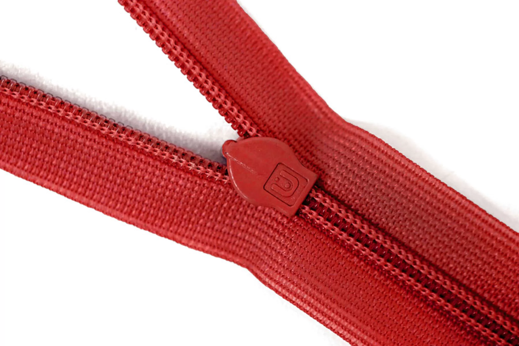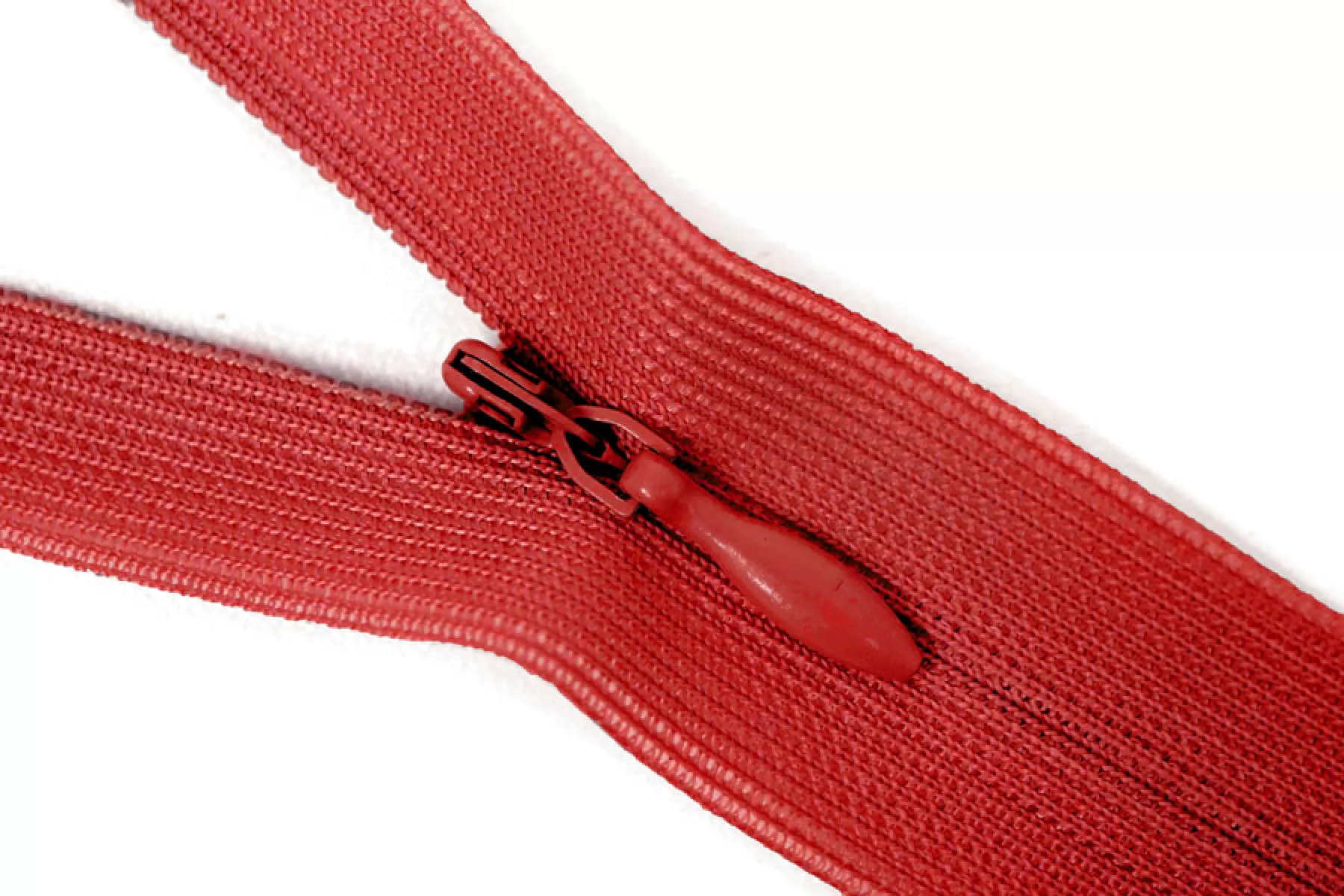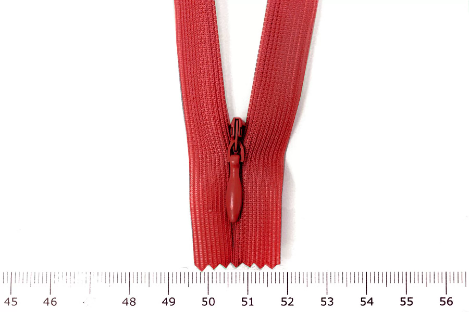 Потайная молния красного цвета, длина 20 см. Неразъемная. Зубцы пластиковые, слайдер и пуллер - металл. Ширина молнии 2 см. Ширина зубцов 4 мм.