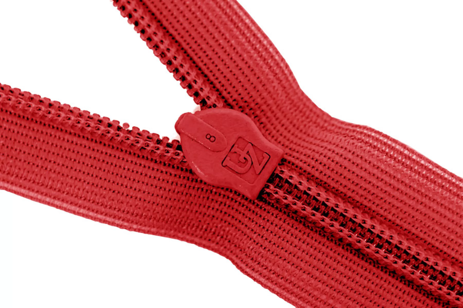 Потайная молния красного цвета, длина 20 см. Неразъемная. Зубцы пластиковые, слайдер и пуллер - металл. Ширина молнии 2 см. Ширина зубцов 4 мм.