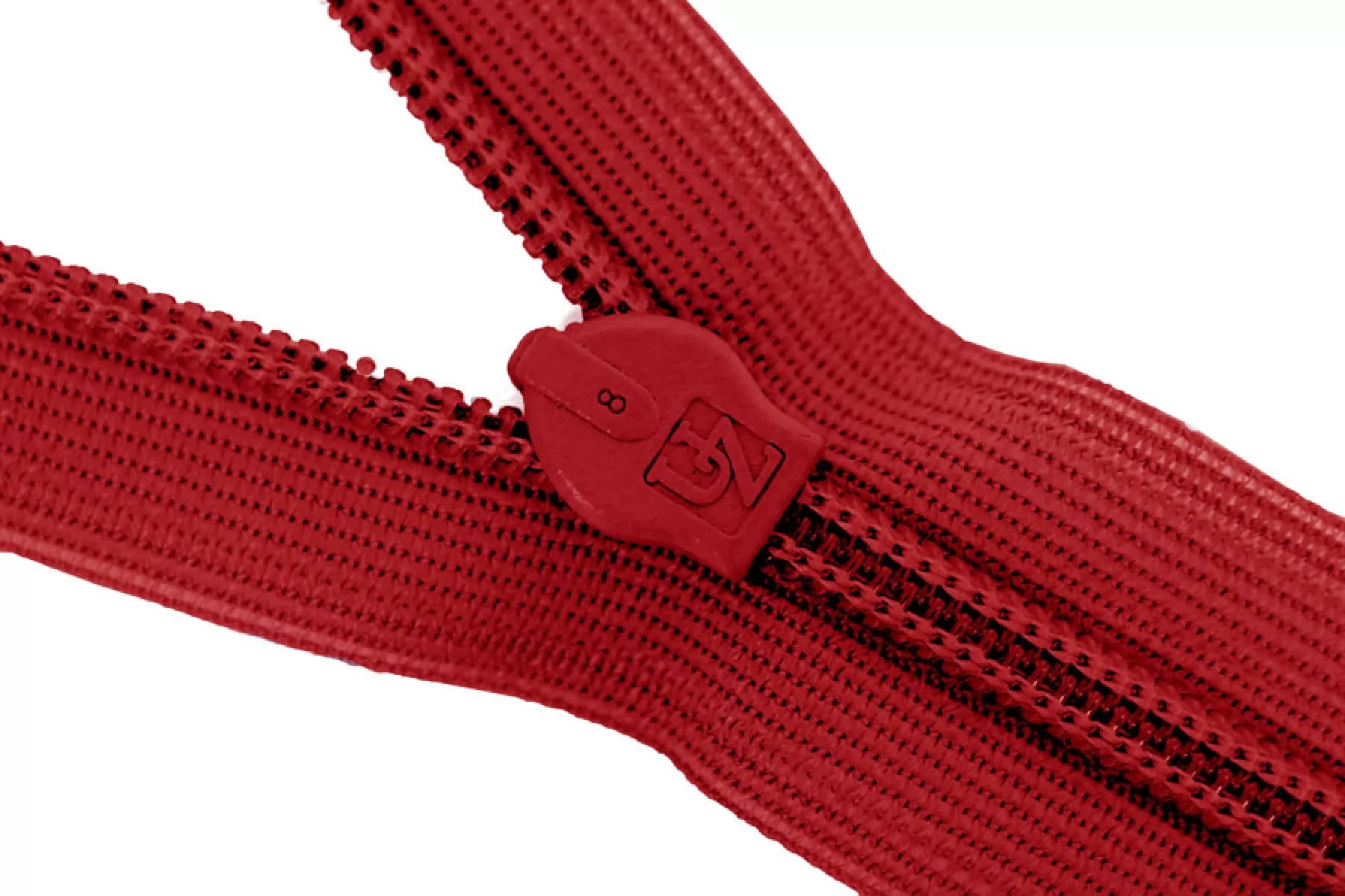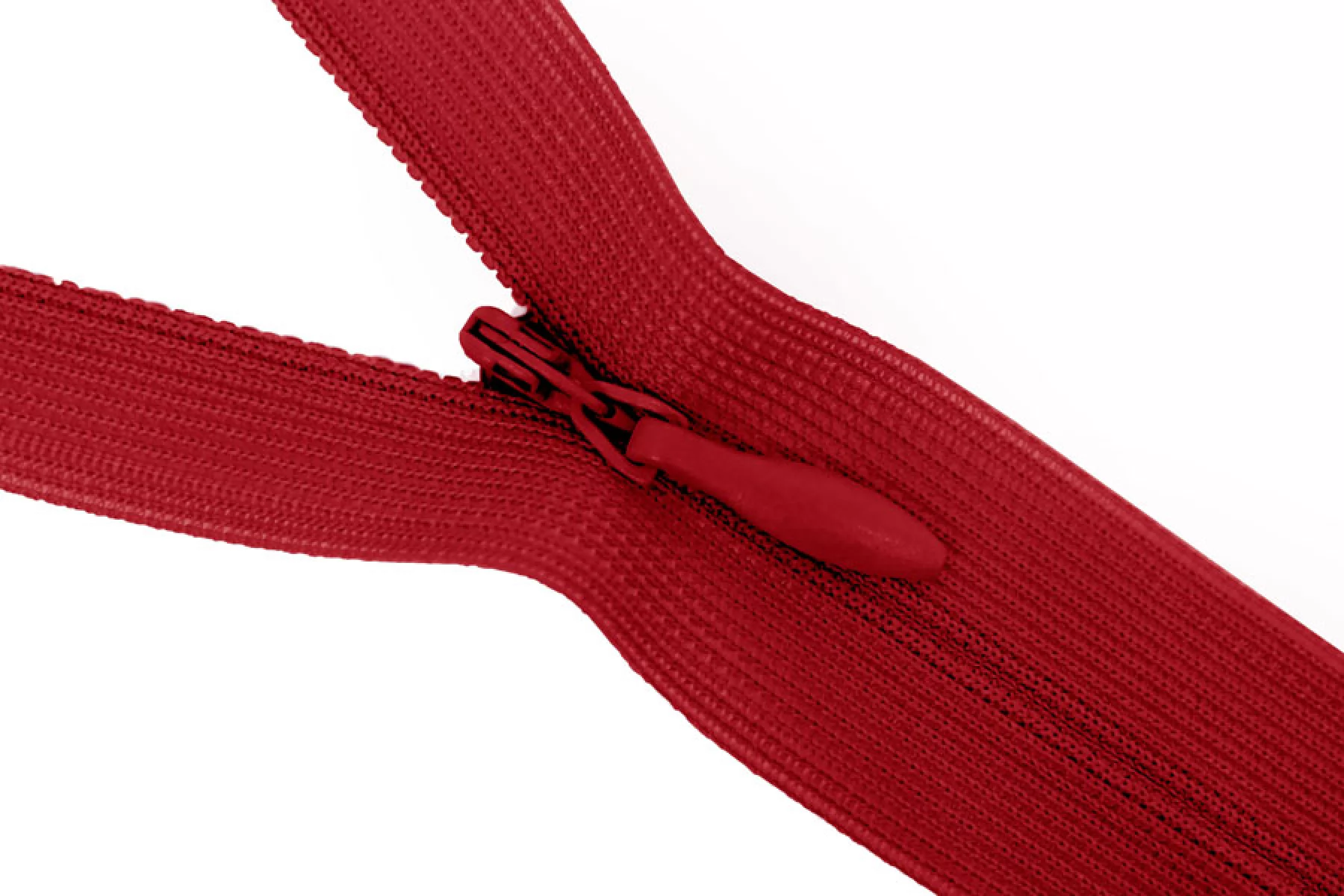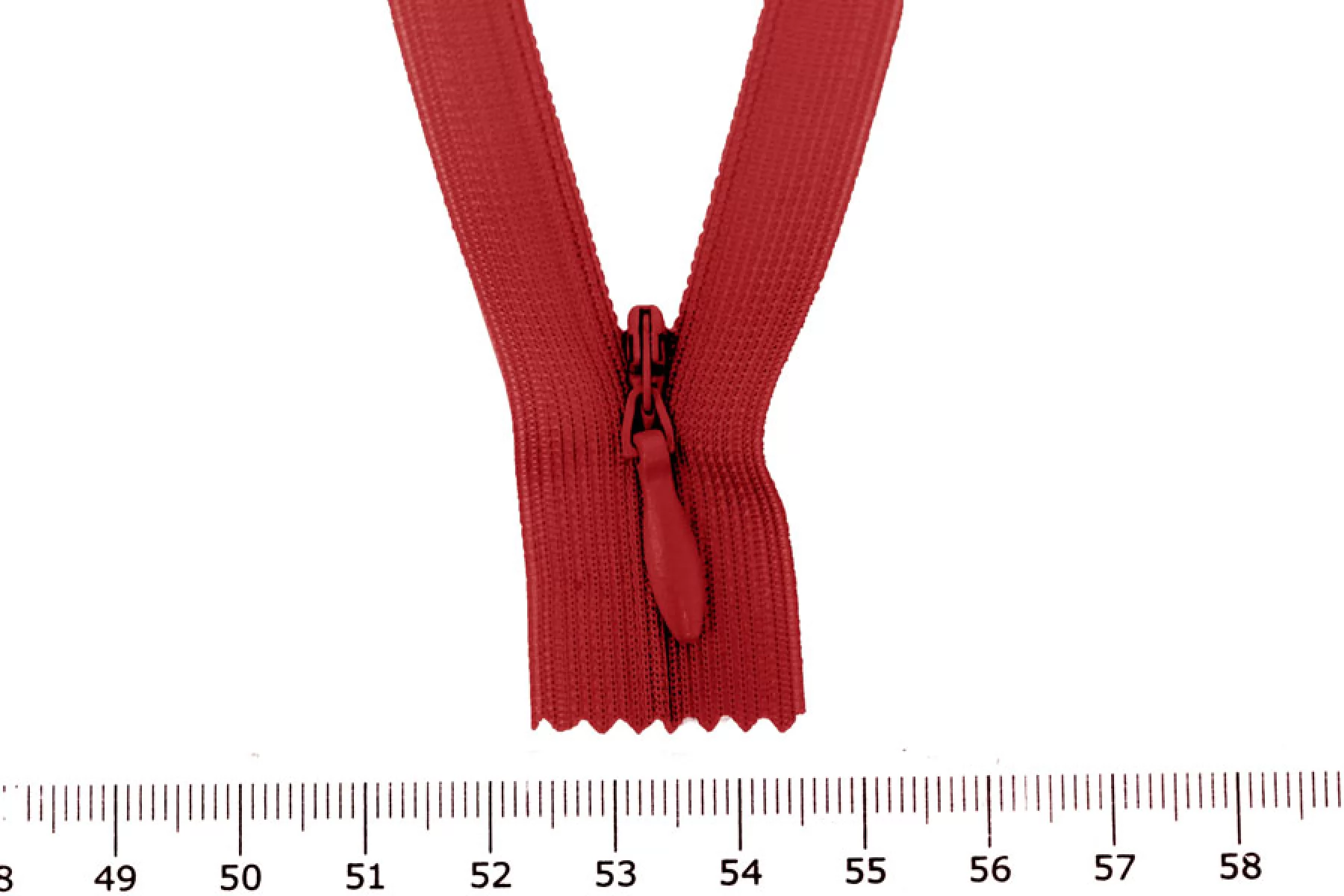 Потайная молния красного цвета, длина 22 см. Неразъемная. Зубцы пластиковые, слайдер и пуллер - металл. Ширина молнии 2 см. Ширина зубцов 4 мм.