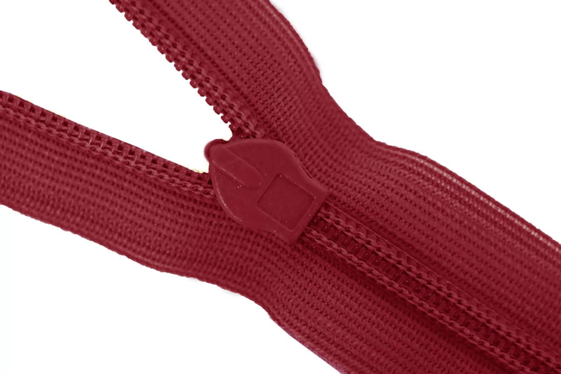 Потайная молния красного цвета, длина 24 см. Неразъемная. Зубцы пластиковые, слайдер и пуллер - металл. Ширина молнии 2 см. Ширина зубцов 4 мм.