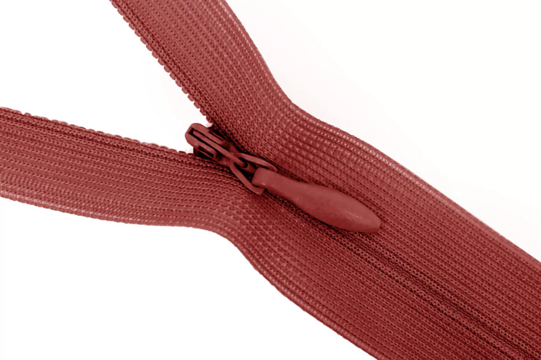 Потайная молния красного цвета, длина 24 см. Неразъемная. Зубцы пластиковые, слайдер и пуллер - металл. Ширина молнии 2 см. Ширина зубцов 4 мм.