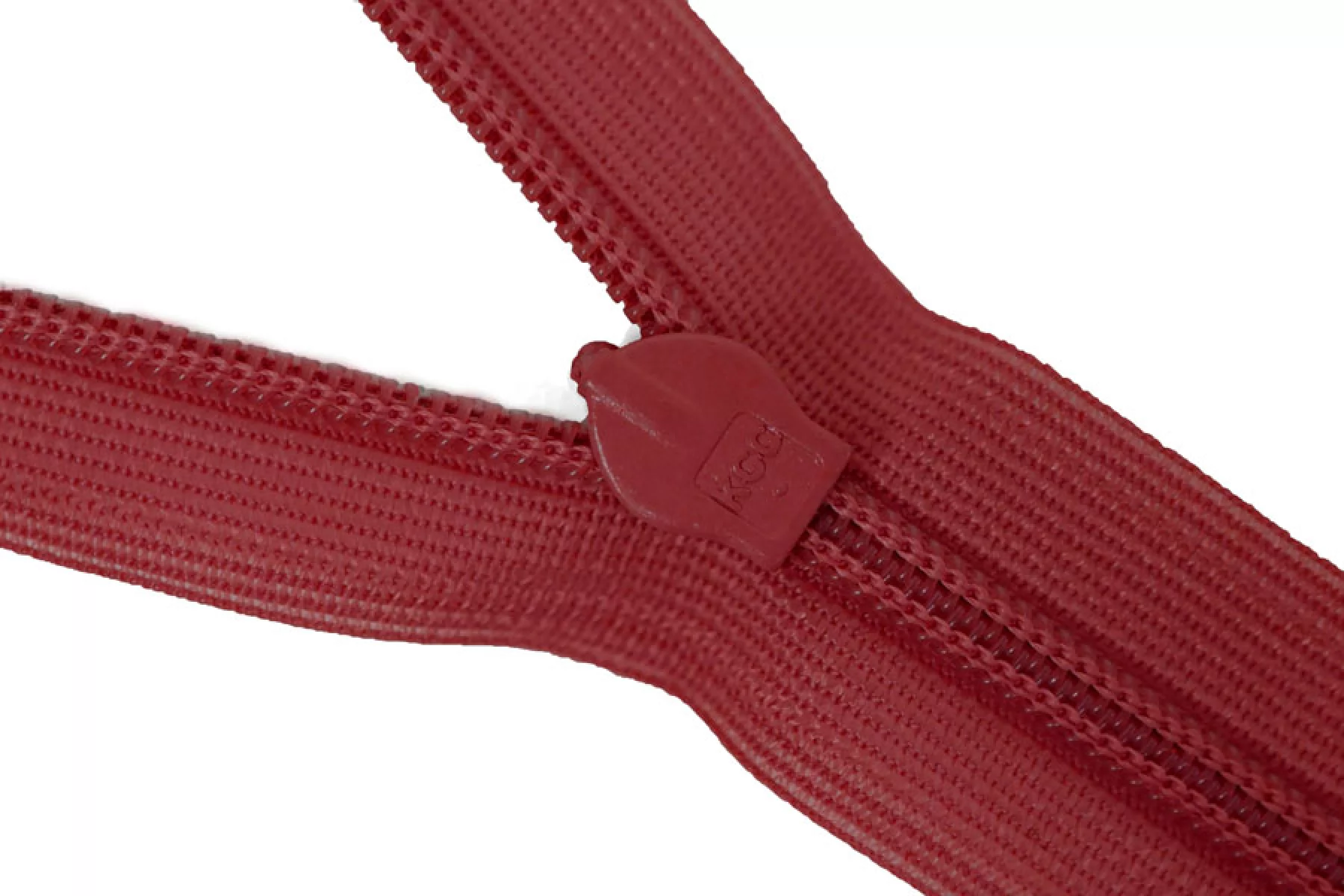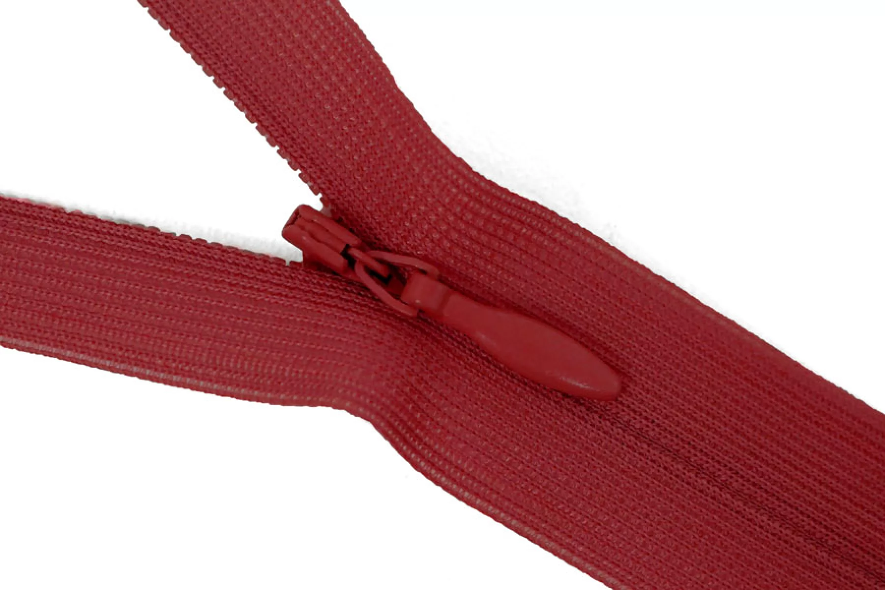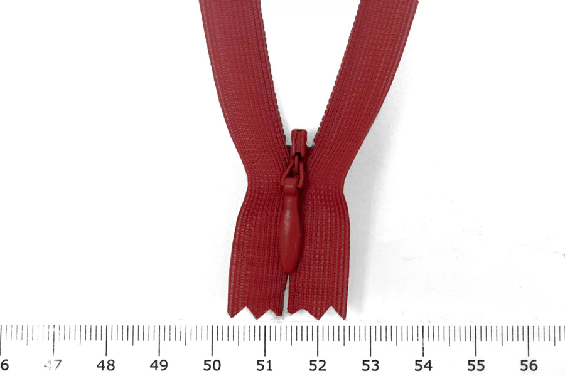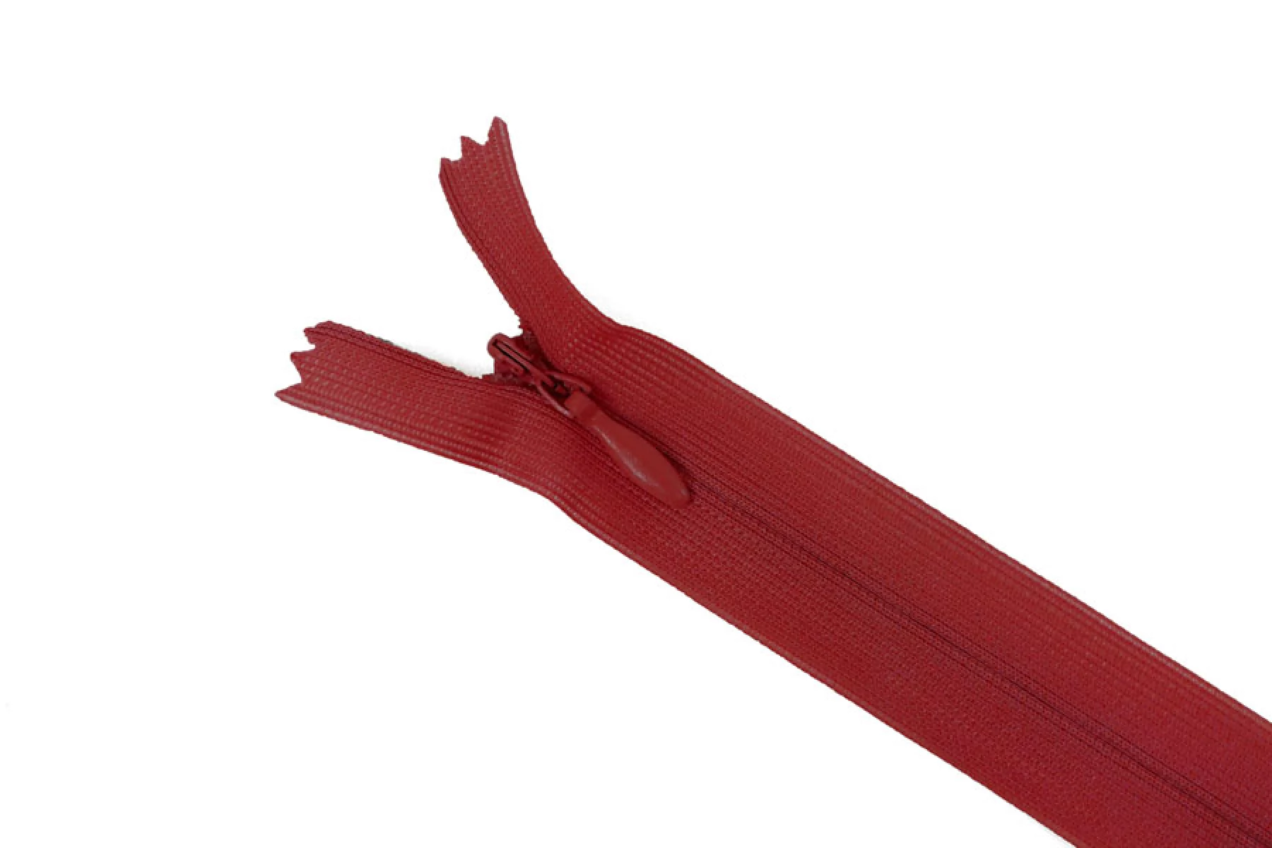 Потайная молния красного цвета, длина 22 см. Неразъемная. Зубцы пластиковые, слайдер и пуллер - металл. Ширина молнии 2 см. Ширина зубцов 4 мм.