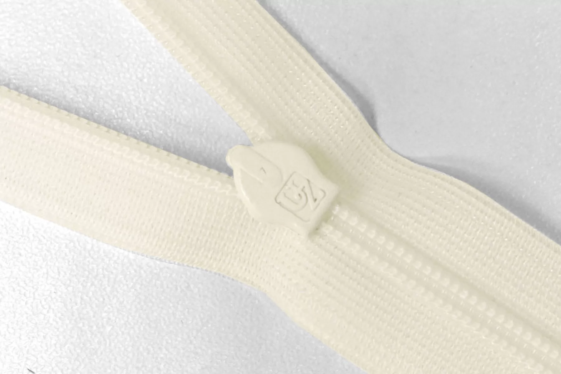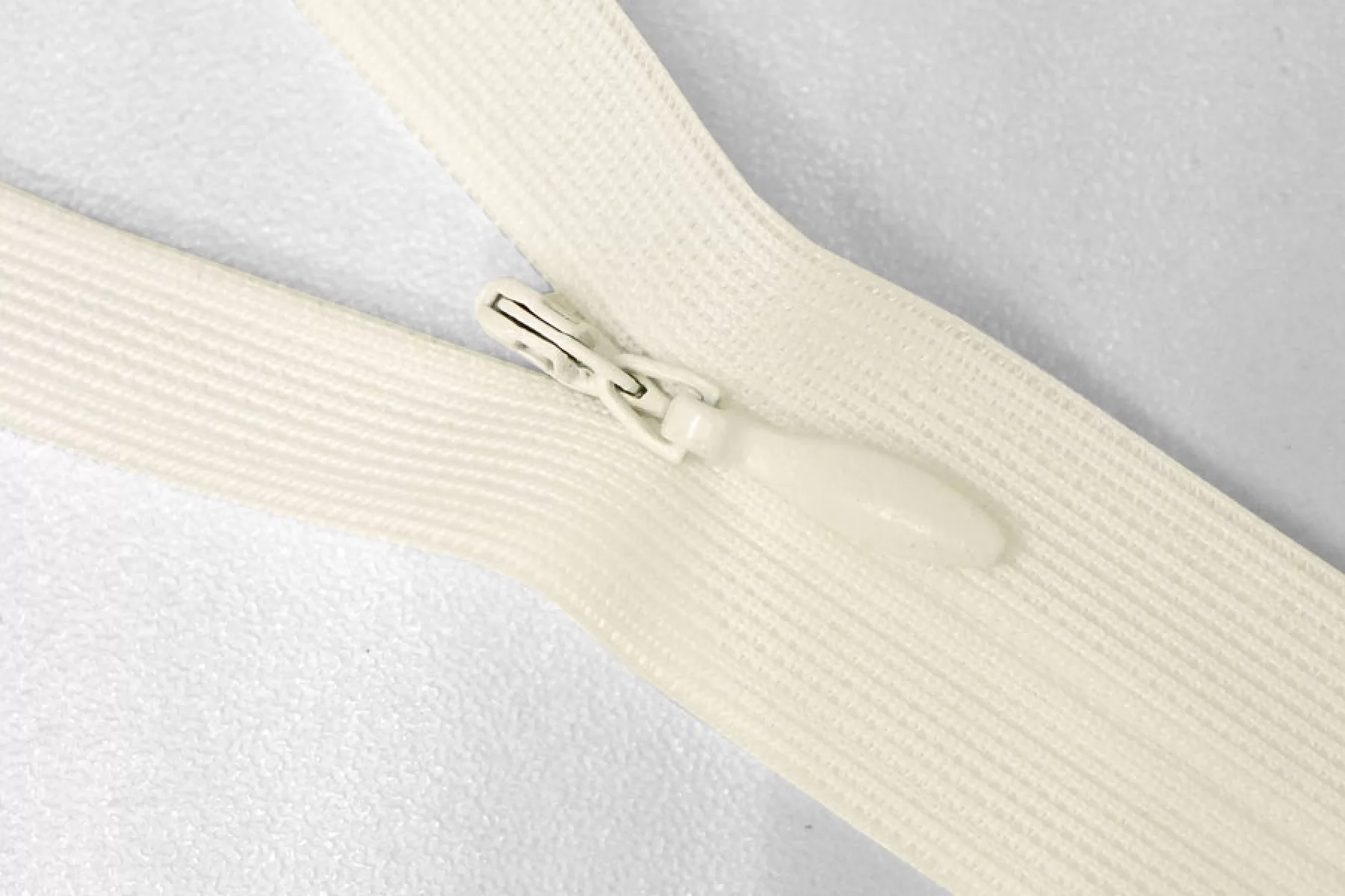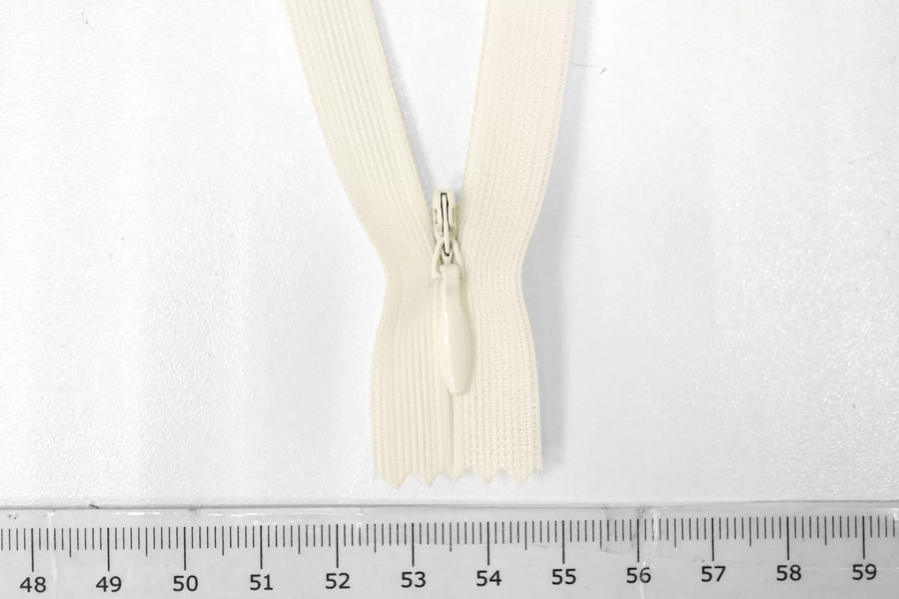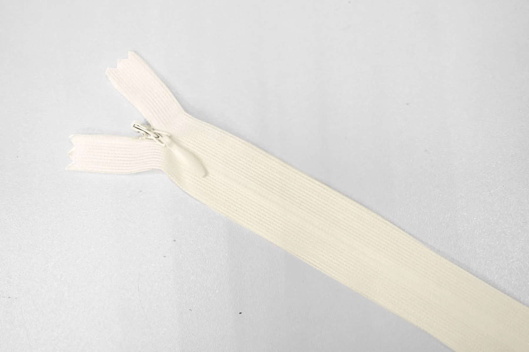 Потайная молния молочного цвета, длина 23 см. Неразъемная. Зубцы пластиковые, слайдер и пуллер - металл.