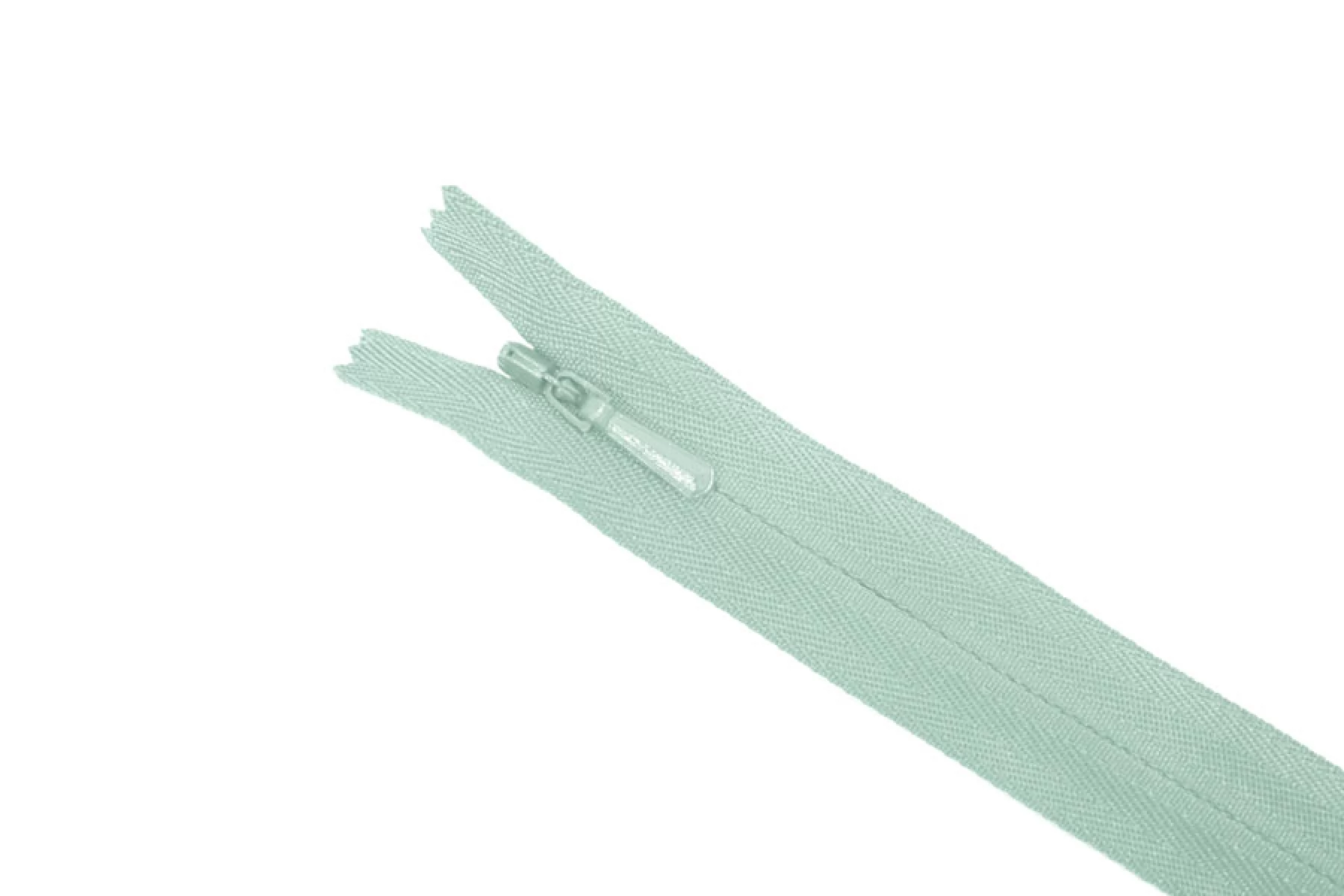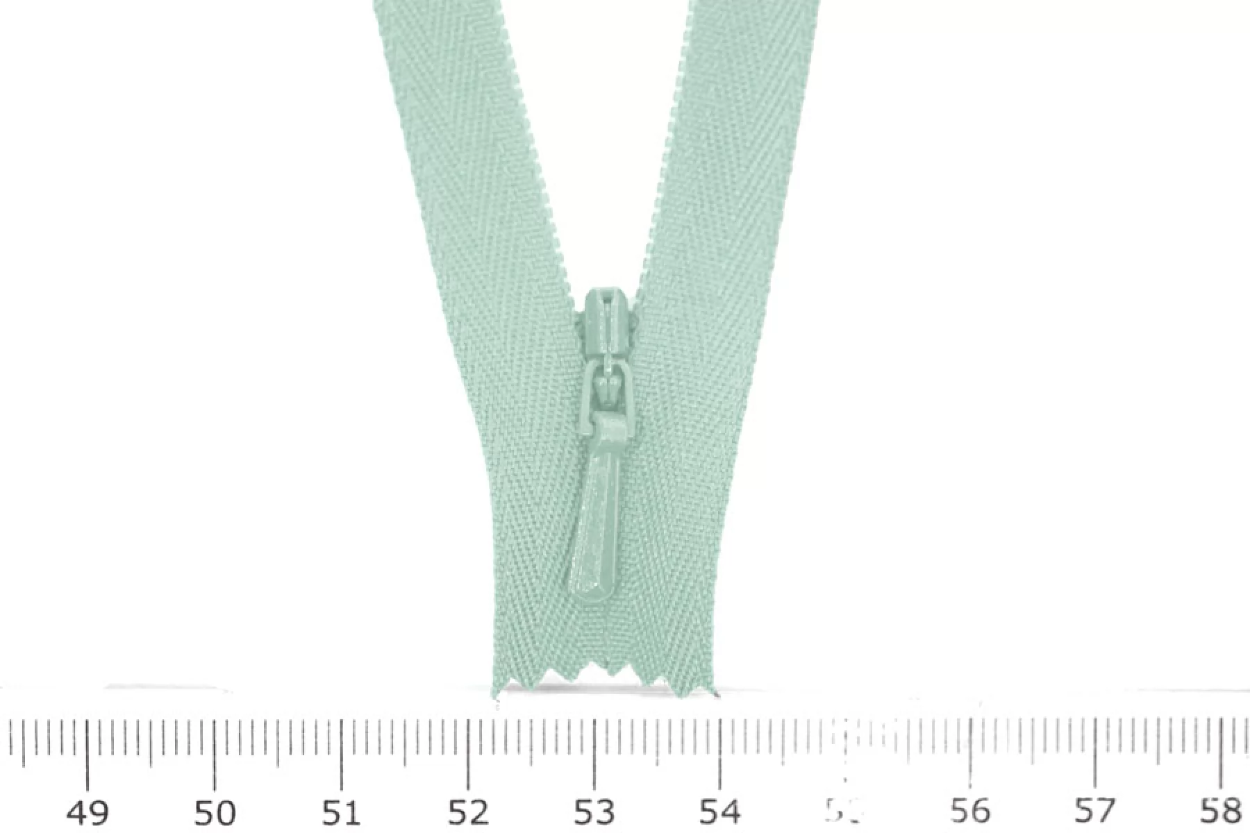 Молния потайная мятная, длина 22 см. Слайдер и пуллер - метал. в цвет молнии. Ширина молнии 2.2 см , ширина зубцов 4мм.