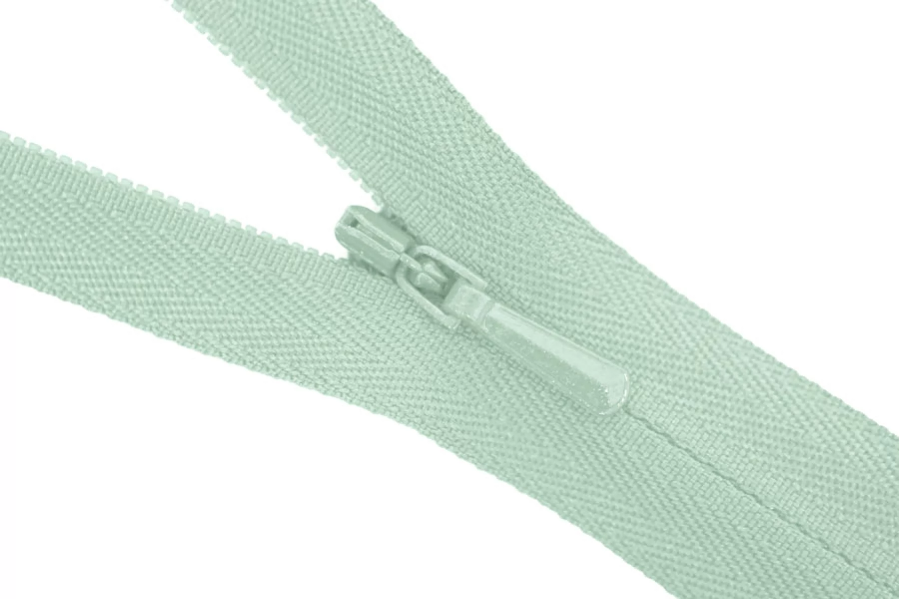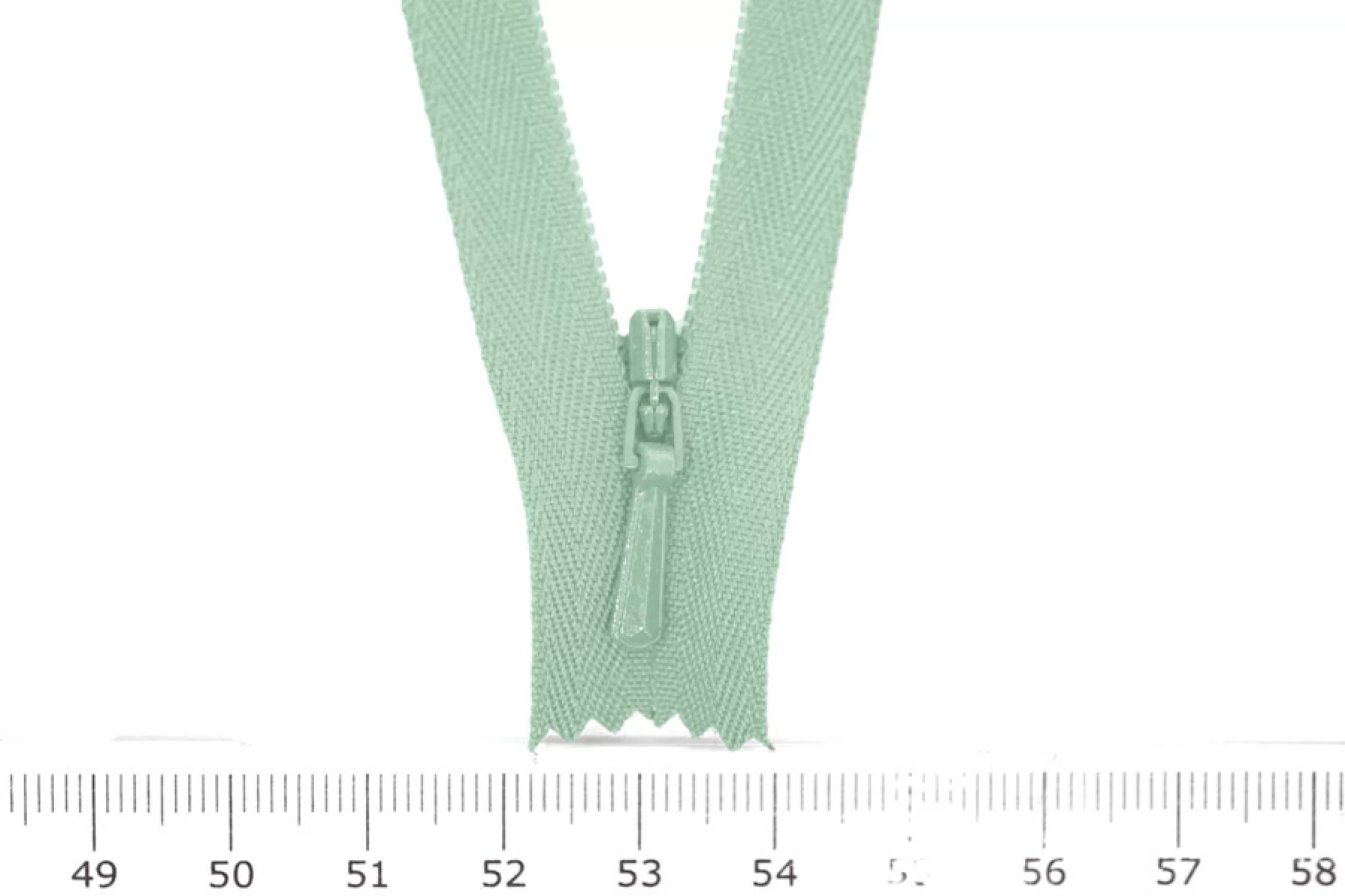 Молния потайная мятная, длина 22 см. Слайдер и пуллер - метал. в цвет молнии. Ширина молнии 2.2 см , ширина зубцов 4мм.