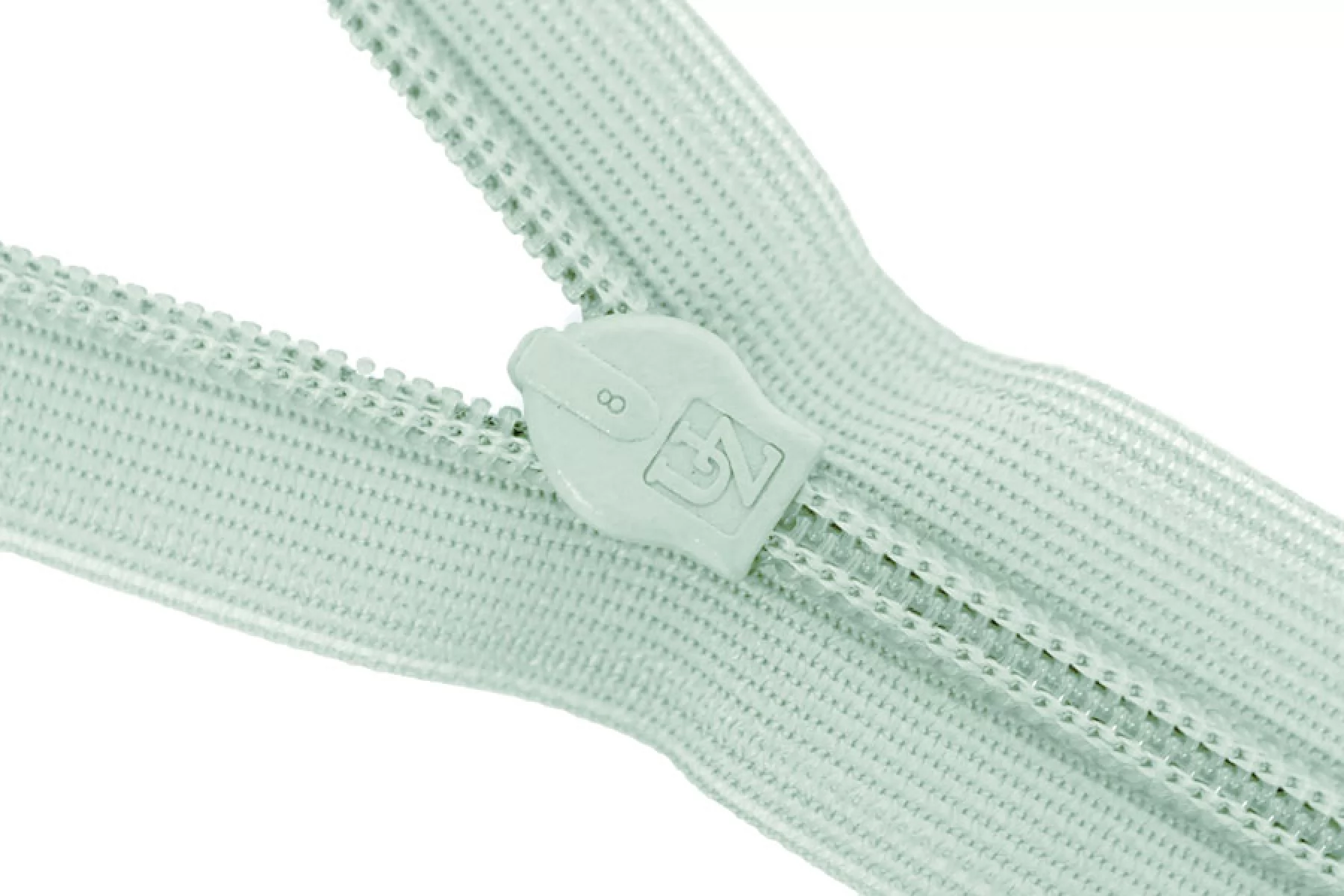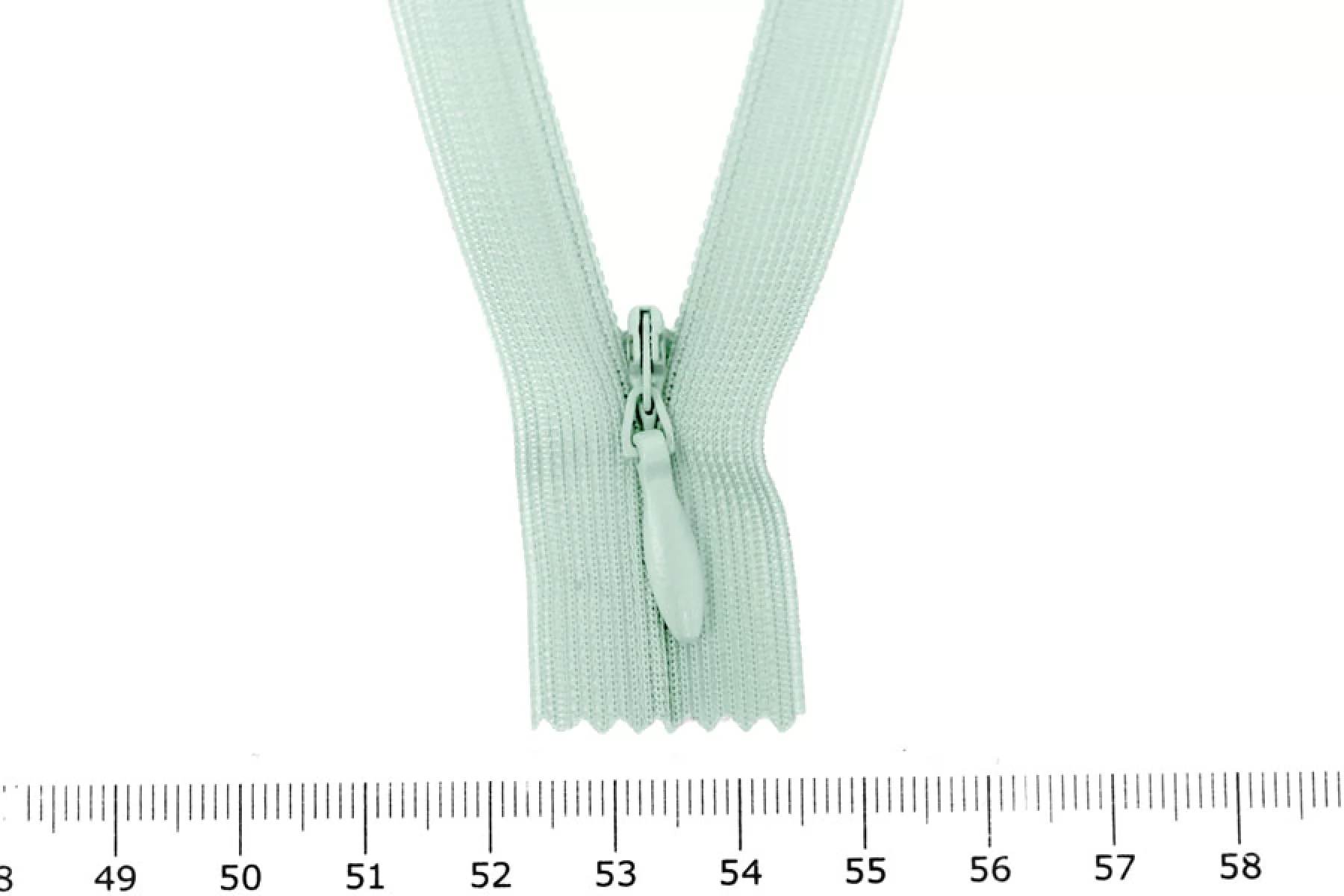 Молния потайная мятная, длина 30 см. Слайдер и пуллер - метал. в цвет молнии. Ширина молнии 2.2 см , ширина зубцов 4мм.