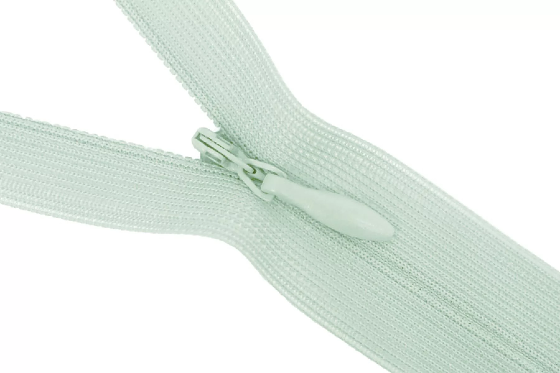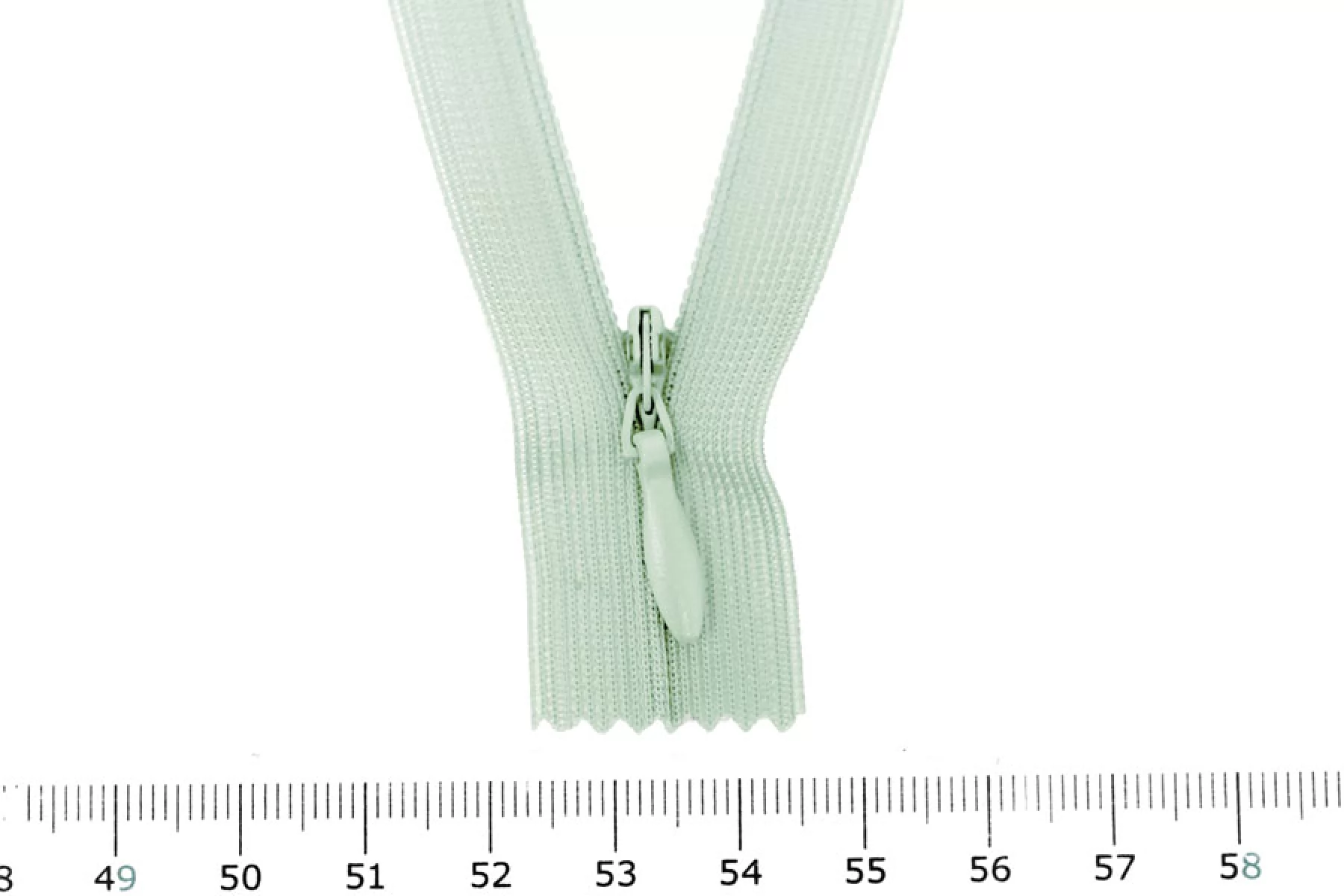 Молния потайная мятная, длина 64 см. Слайдер и пуллер - метал. в цвет молнии. Ширина молнии 2.2 см , ширина зубцов 4мм.
