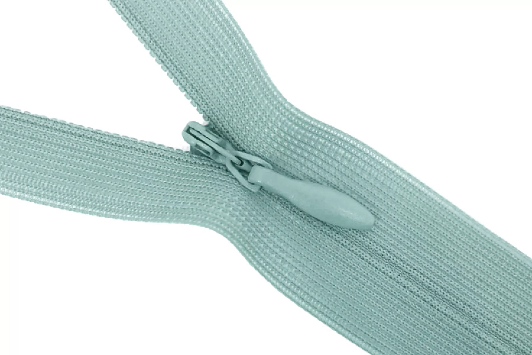 Молния потайная мятно-голубая, длина 27 см. Слайдер и пуллер - метал. в цвет молнии. Ширина молнии 2.2 см , ширина зубцов 4мм.
