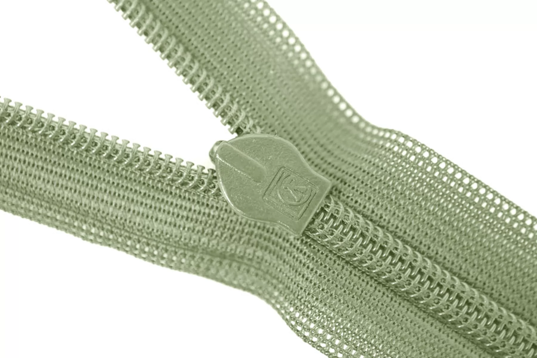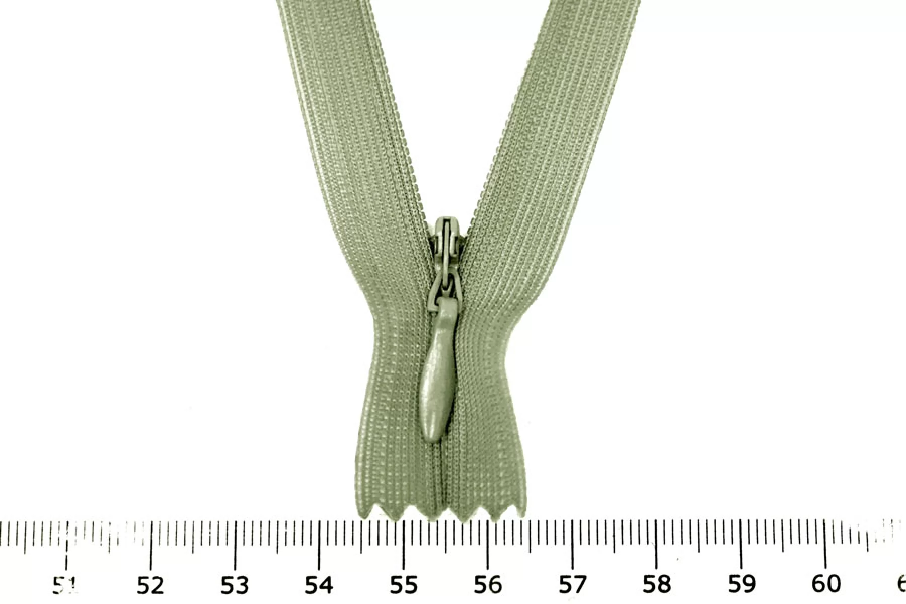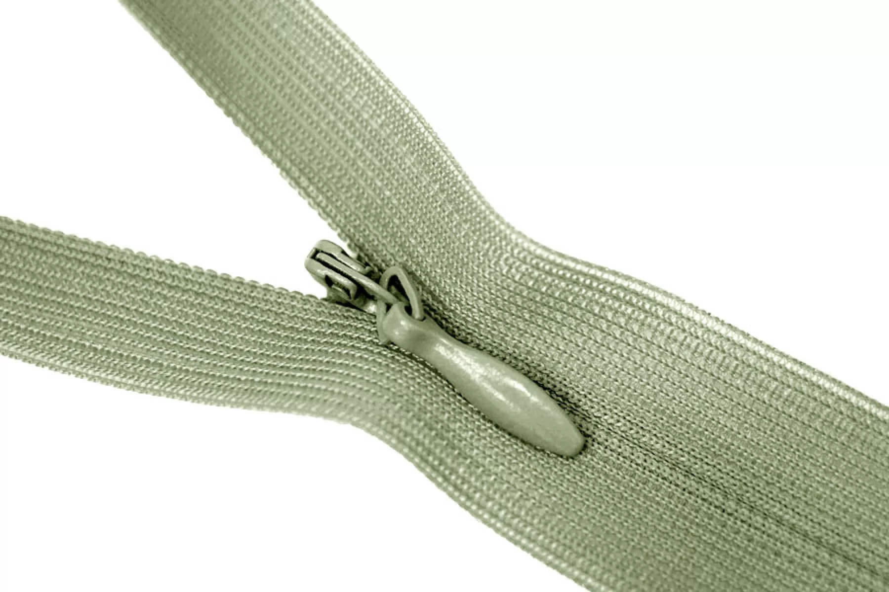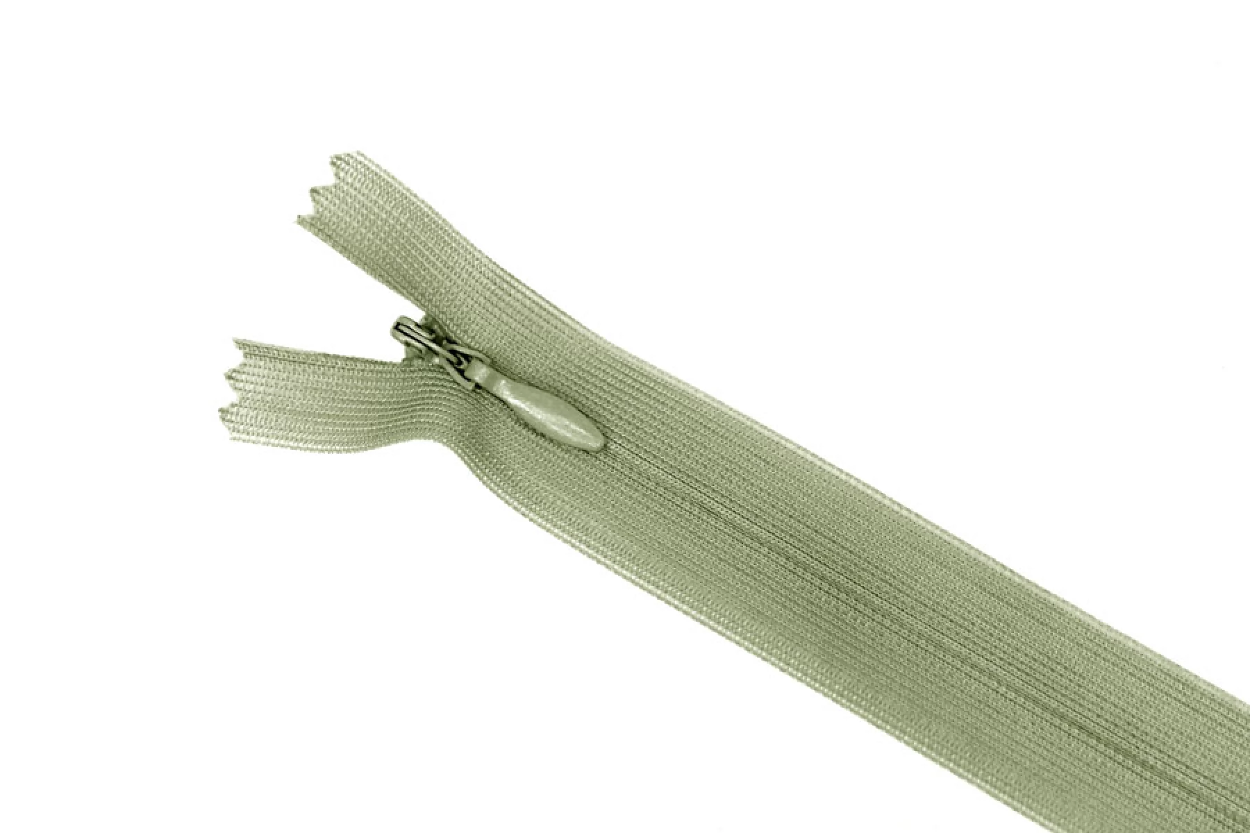 Молния потайная припыленно-зеленая, длина 24 см. Слайдер и пуллер - метал. в цвет молнии. Ширина молнии 2.2 см , ширина зубцов 4мм.