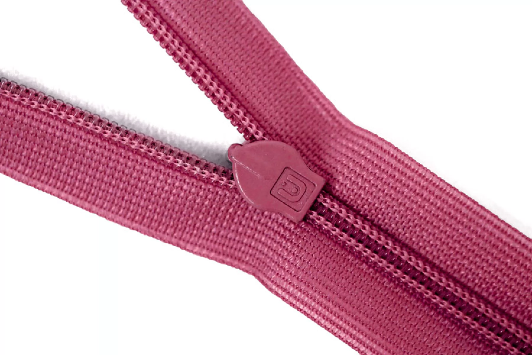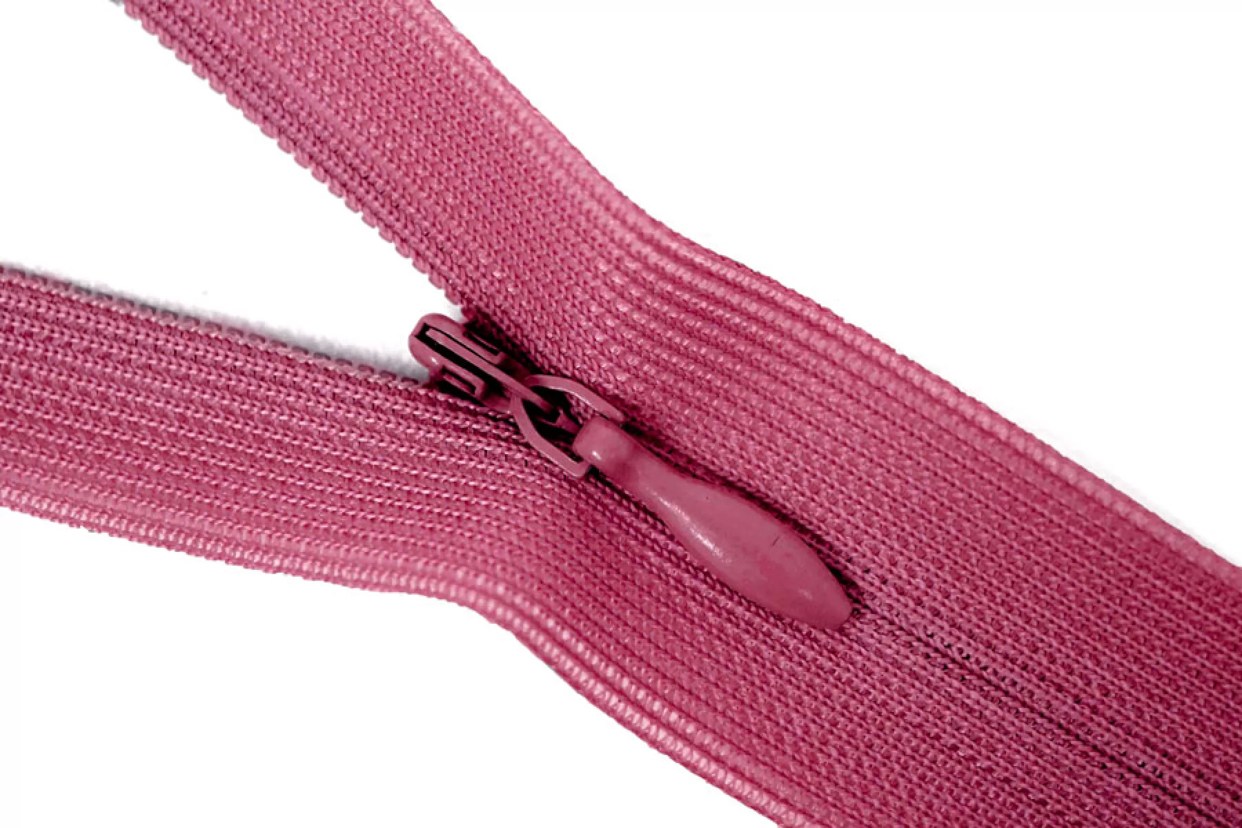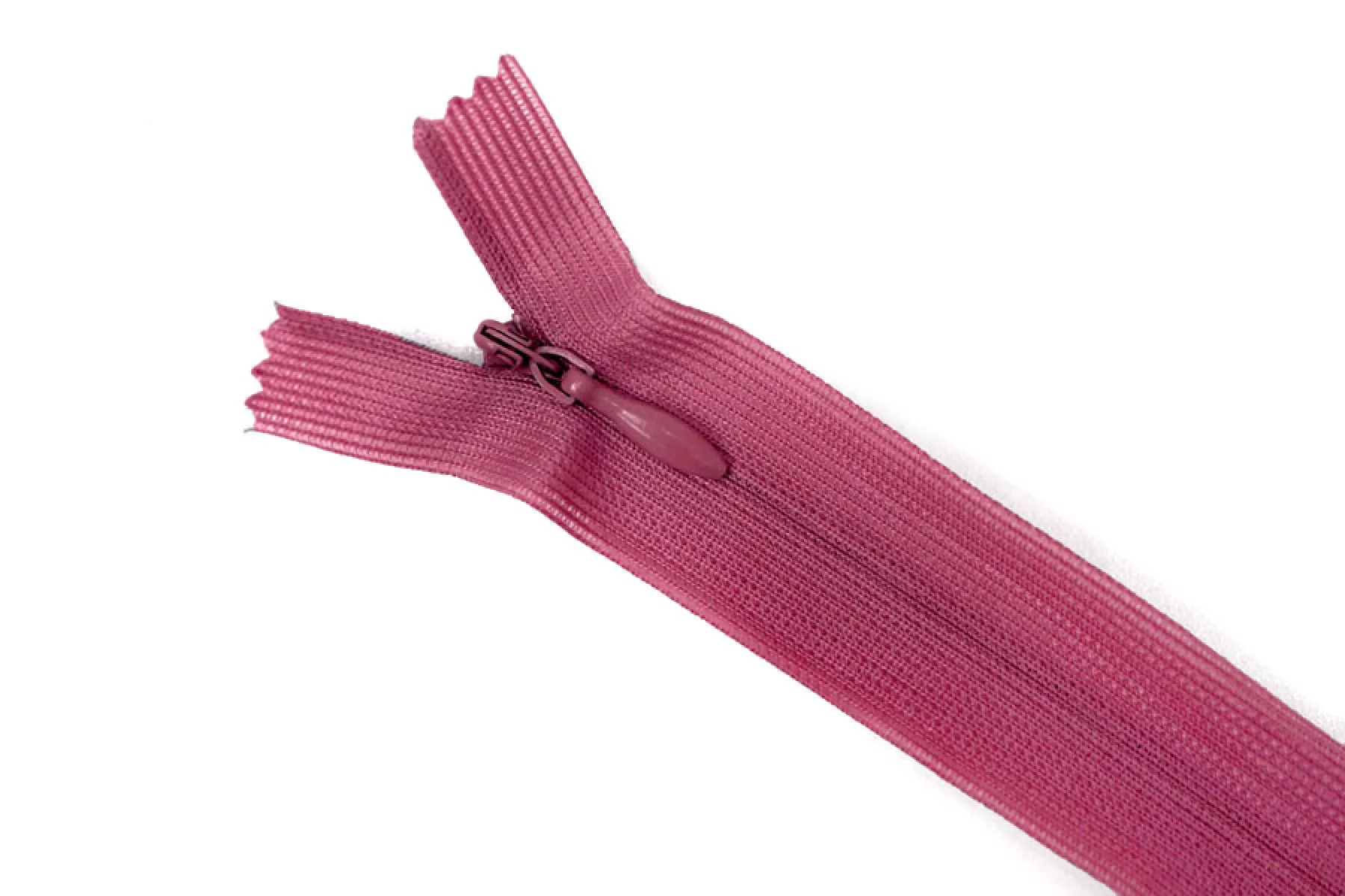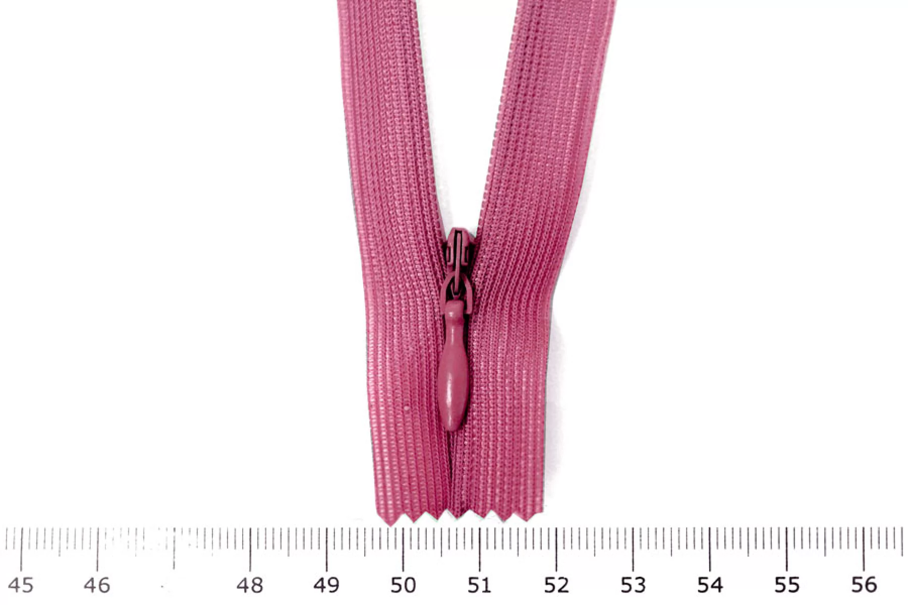 Потайная молния розового цвета, длина 24 см. Неразъемная. Зубцы пластиковые, слайдер и пуллер - металл. Ширина молнии 2 см. Ширина зубцов 4 мм.
