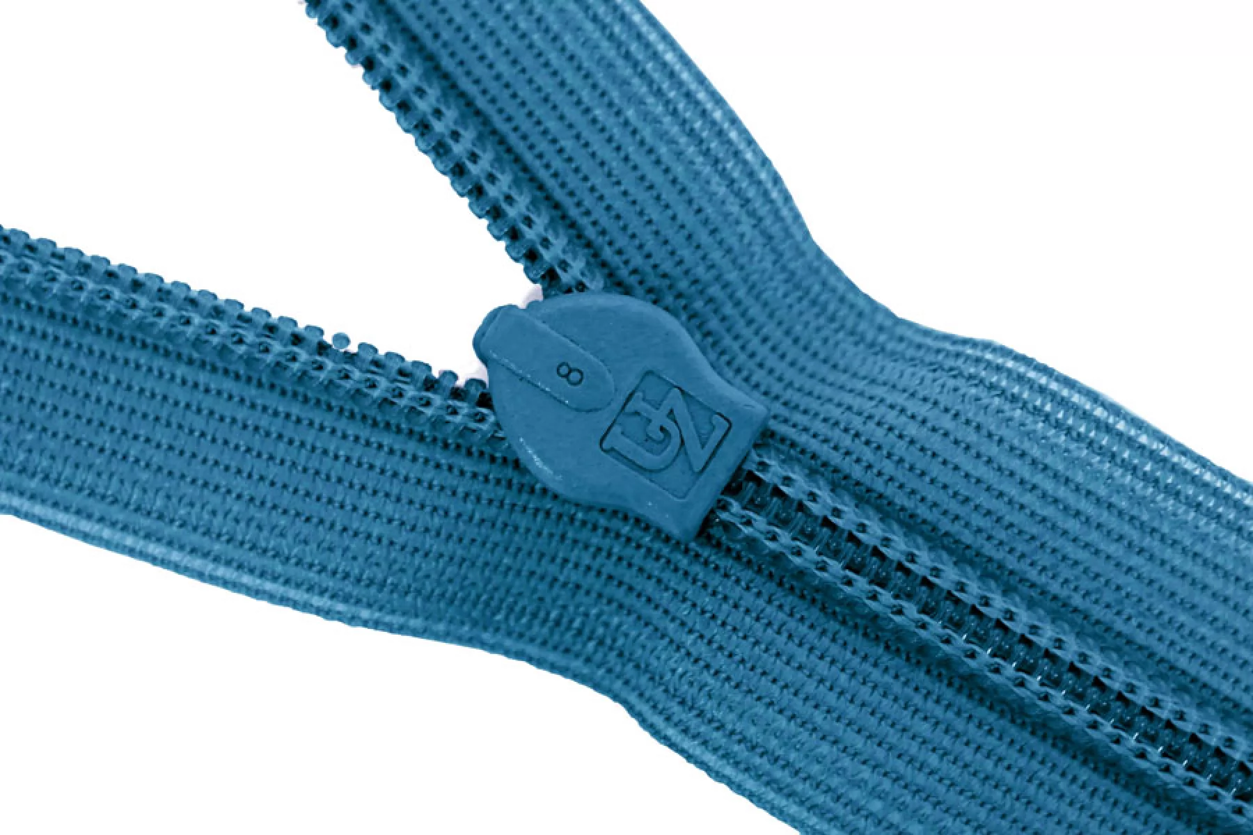 Потайная молния синего цвета, длина 19 см. Неразъемная. Зубцы пластиковые, слайдер и пуллер - металл.