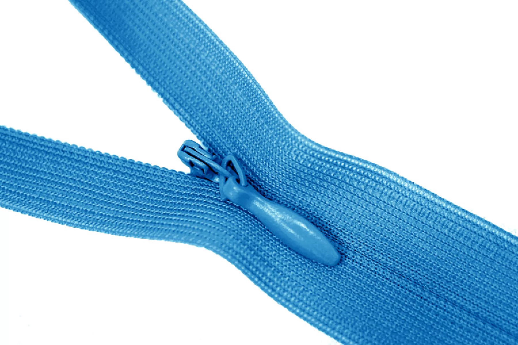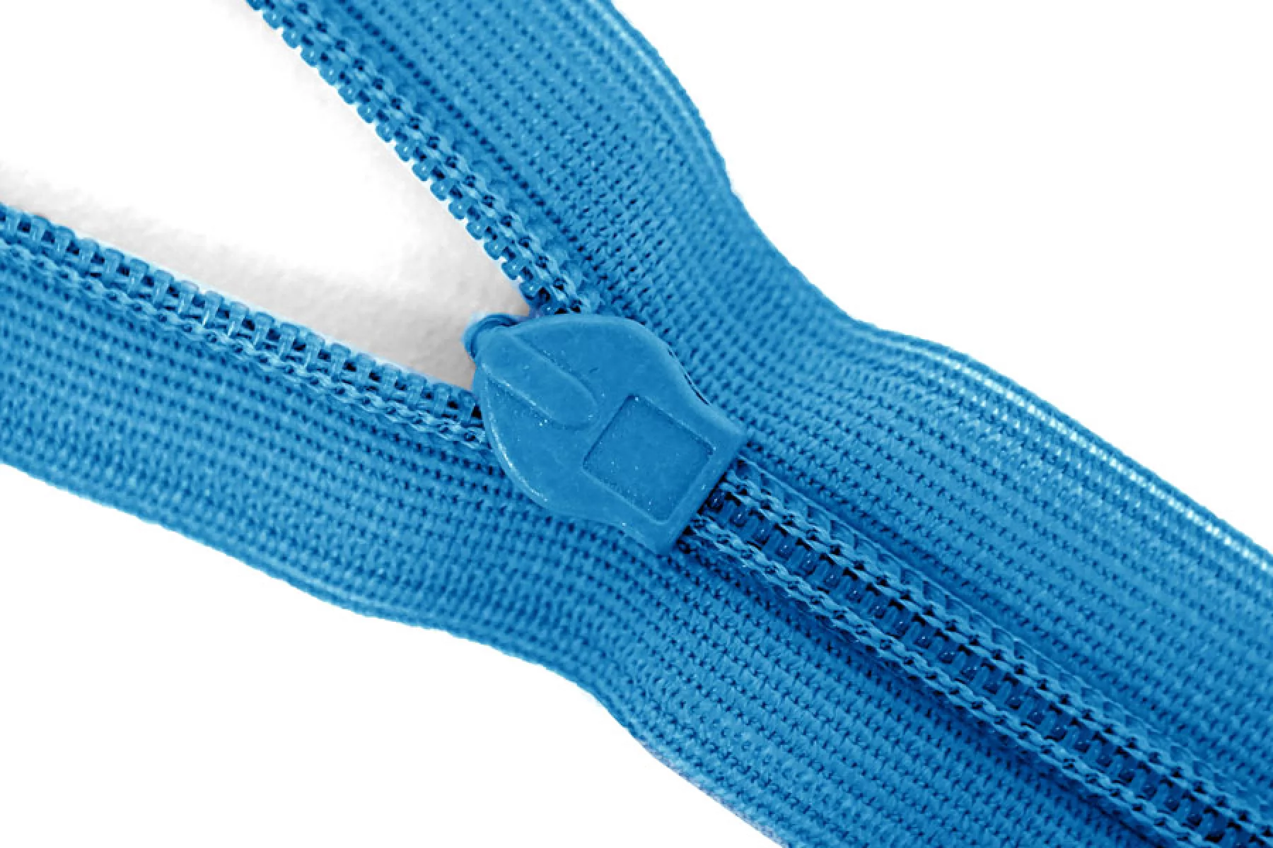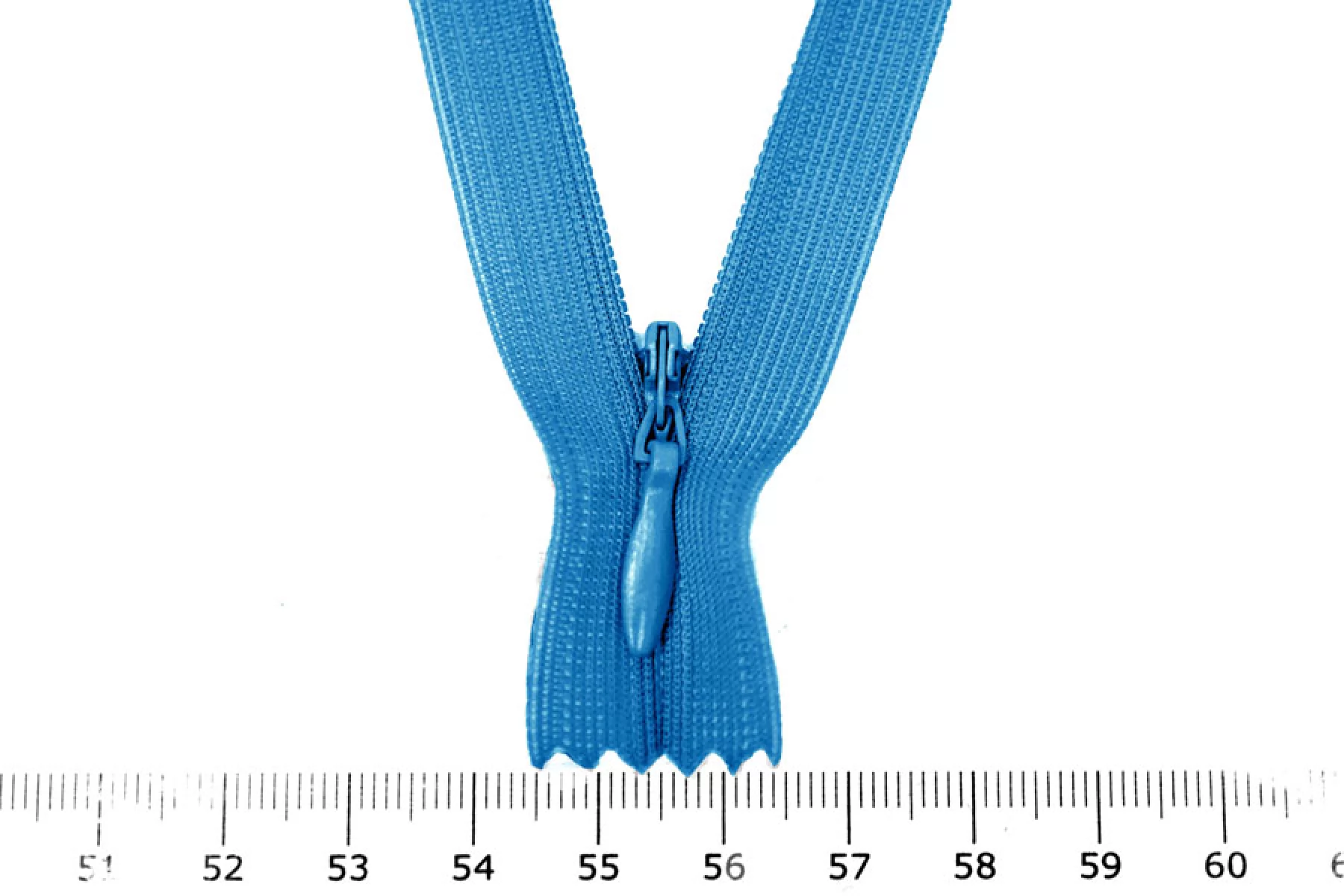 Потайная молния синего цвета, длина 20 см. Неразъемная. Зубцы пластиковые, слайдер и пуллер - металл.