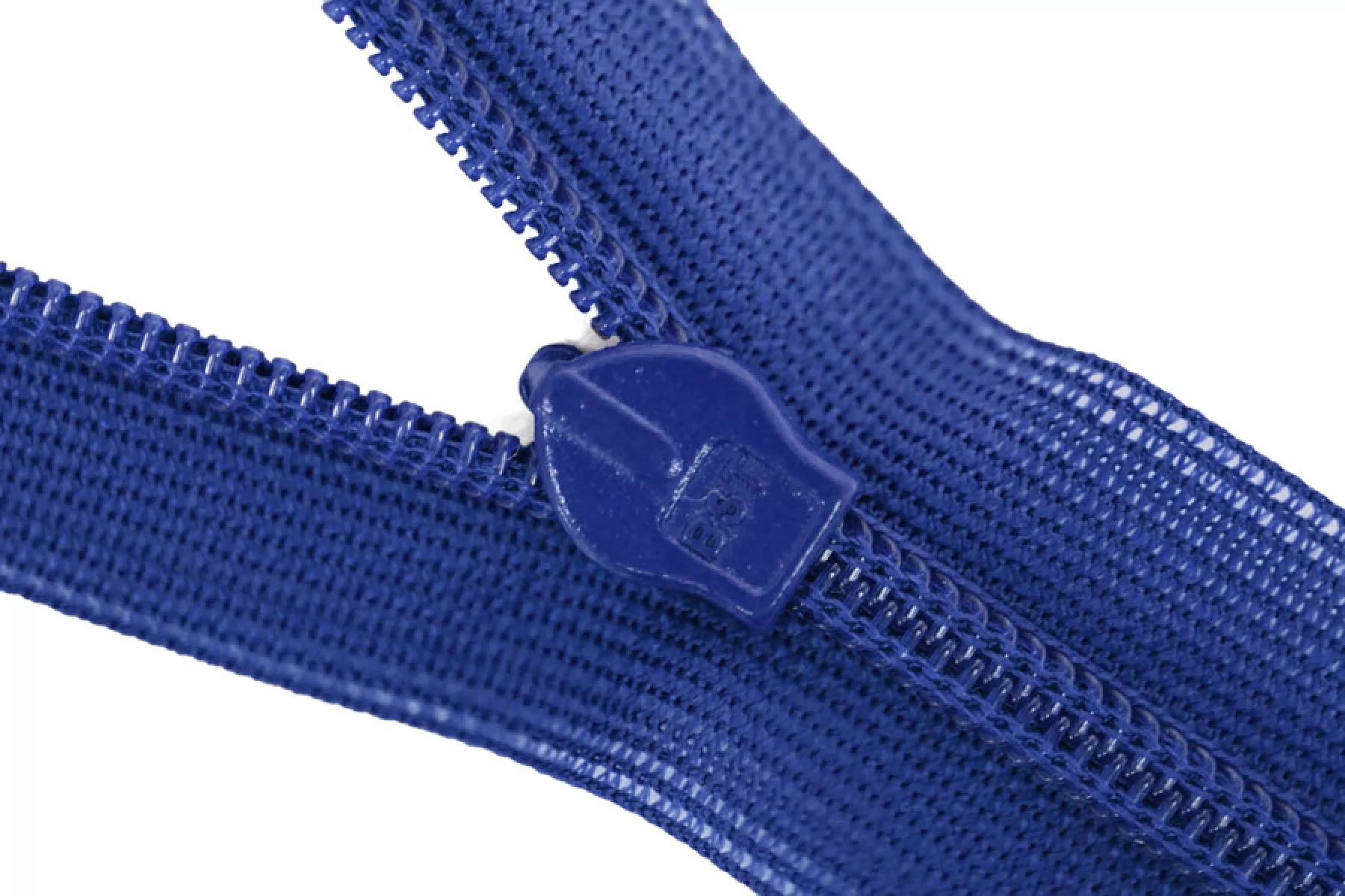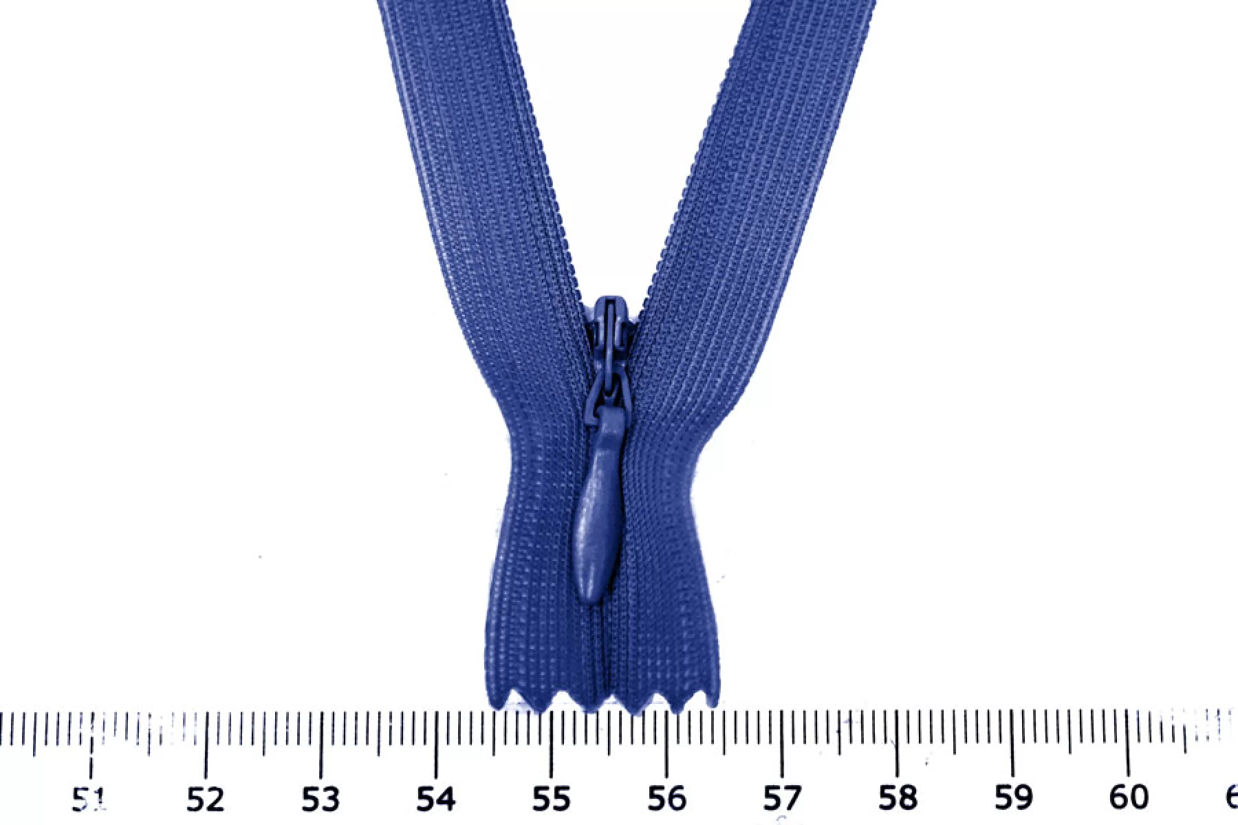Потайная молния синего цвета, длина 21 см. Неразъемная. Зубцы пластиковые, слайдер и пуллер - металл.