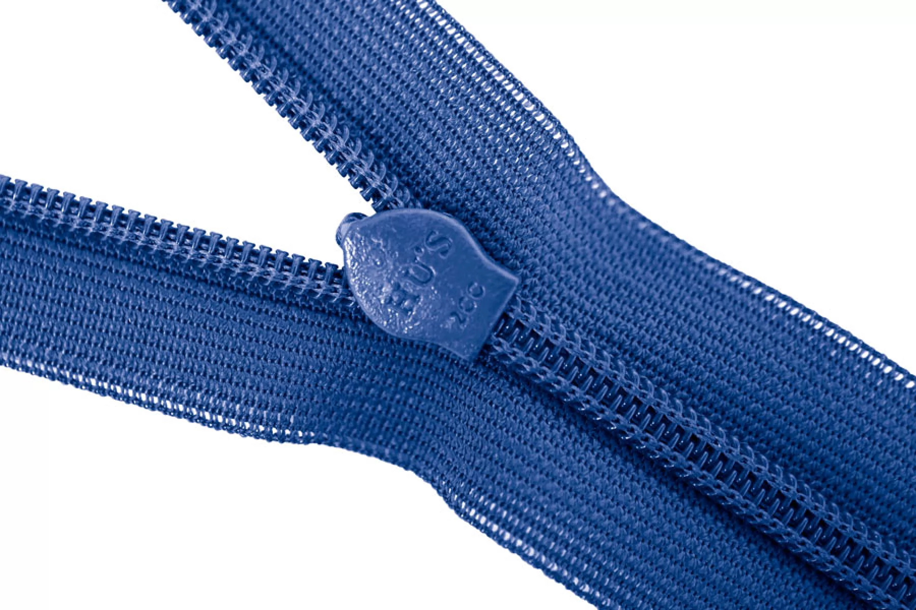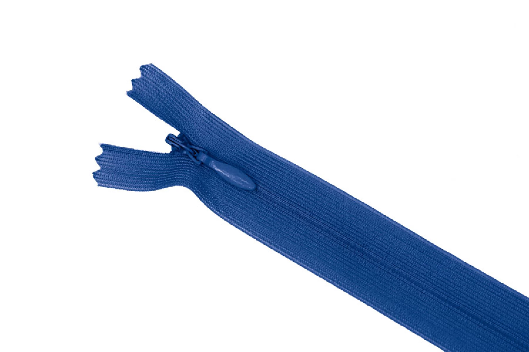 Потайная молния синего цвета, длина 22 см. Неразъемная. Зубцы пластиковые, слайдер и пуллер - металл.