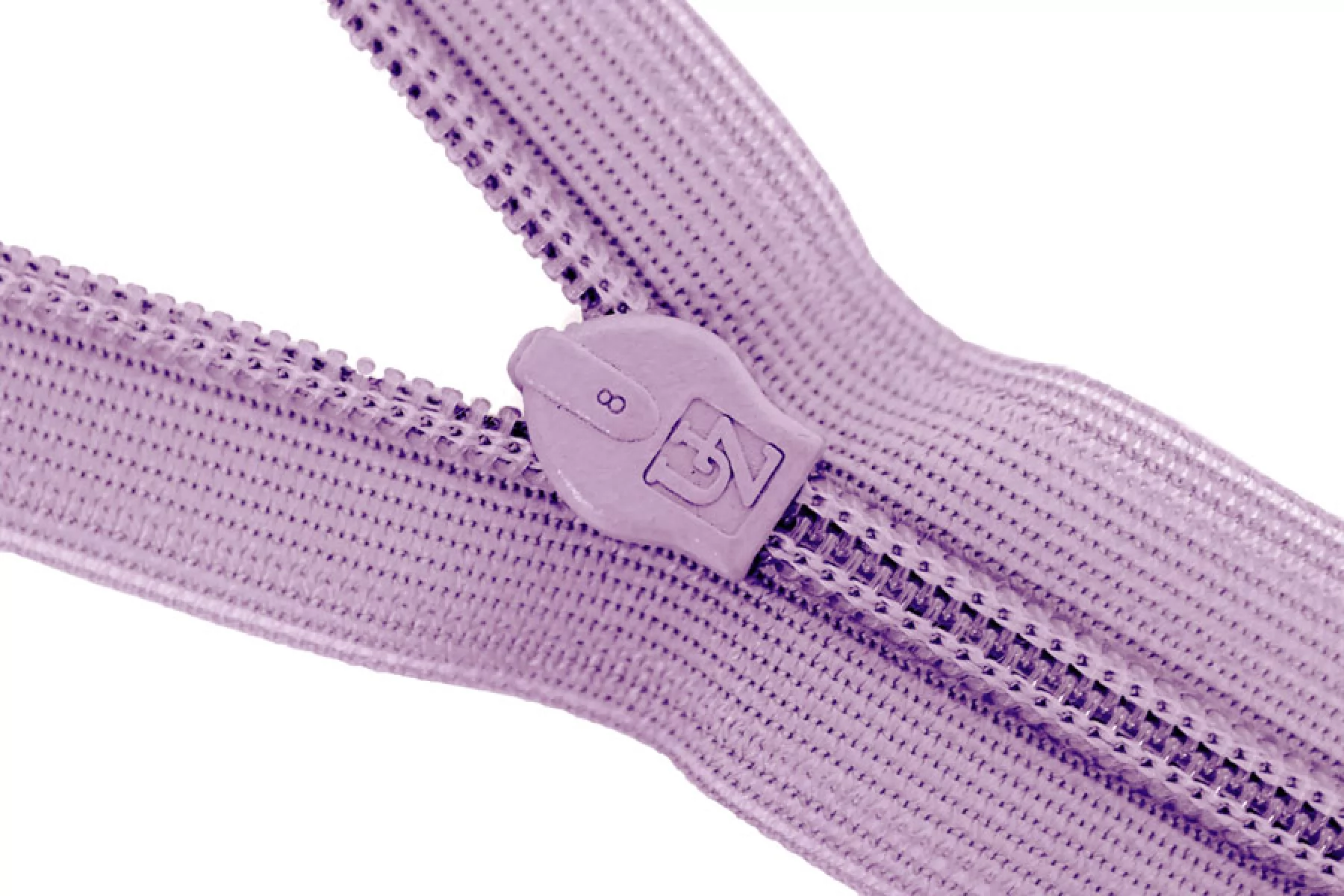 Потайная молния сиреневого цвета, длина 20 см. Неразъемная. Зубцы пластиковые, слайдер и пуллер - металл. Ширина молнии 2 см. Ширина зубцов 4 мм.