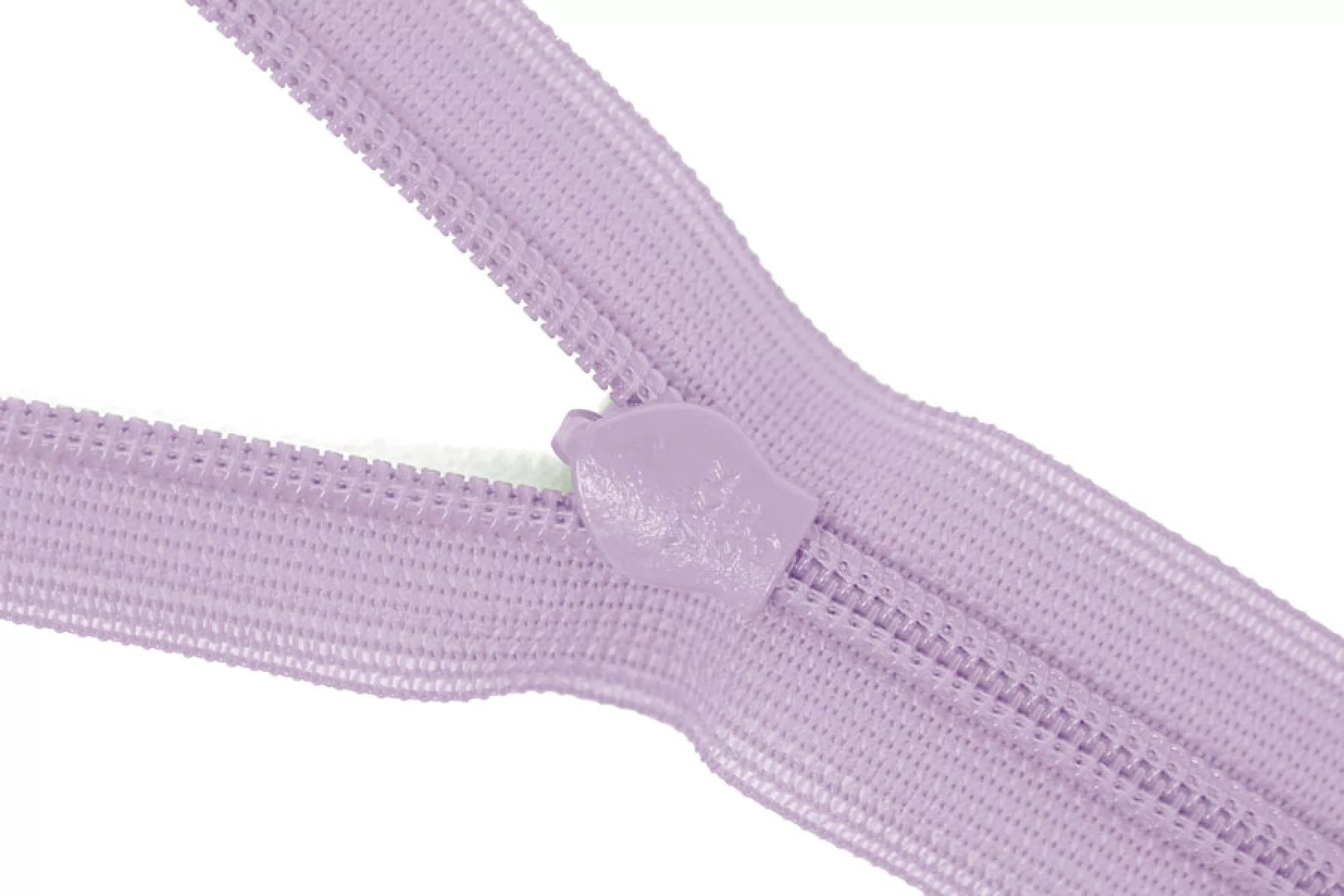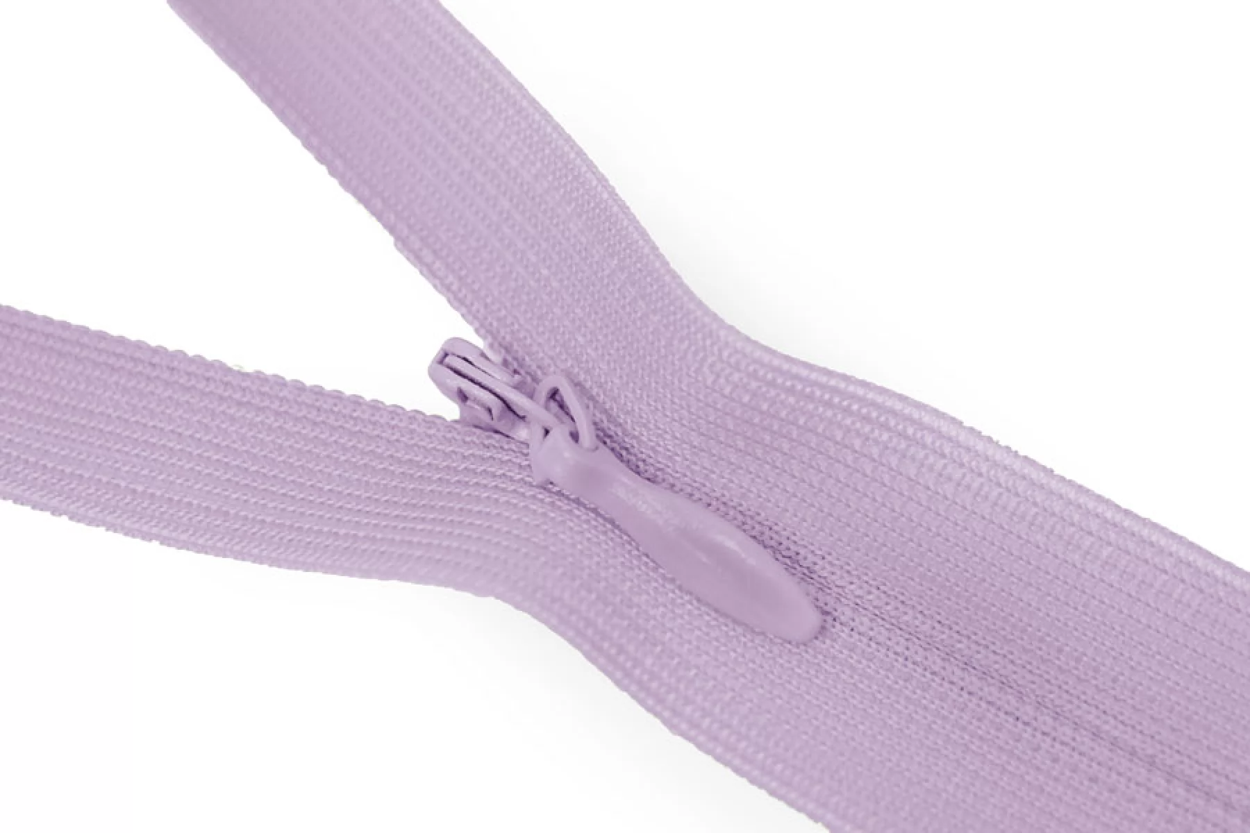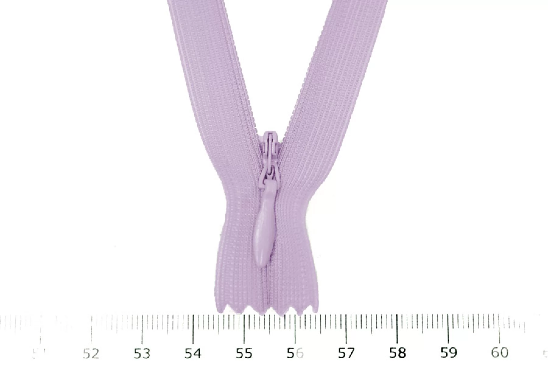 Потайная молния сиреневого цвета, длина 75 см. Неразъемная. Зубцы пластиковые, слайдер и пуллер - металл. Ширина молнии 2 см. Ширина зубцов 4 мм.