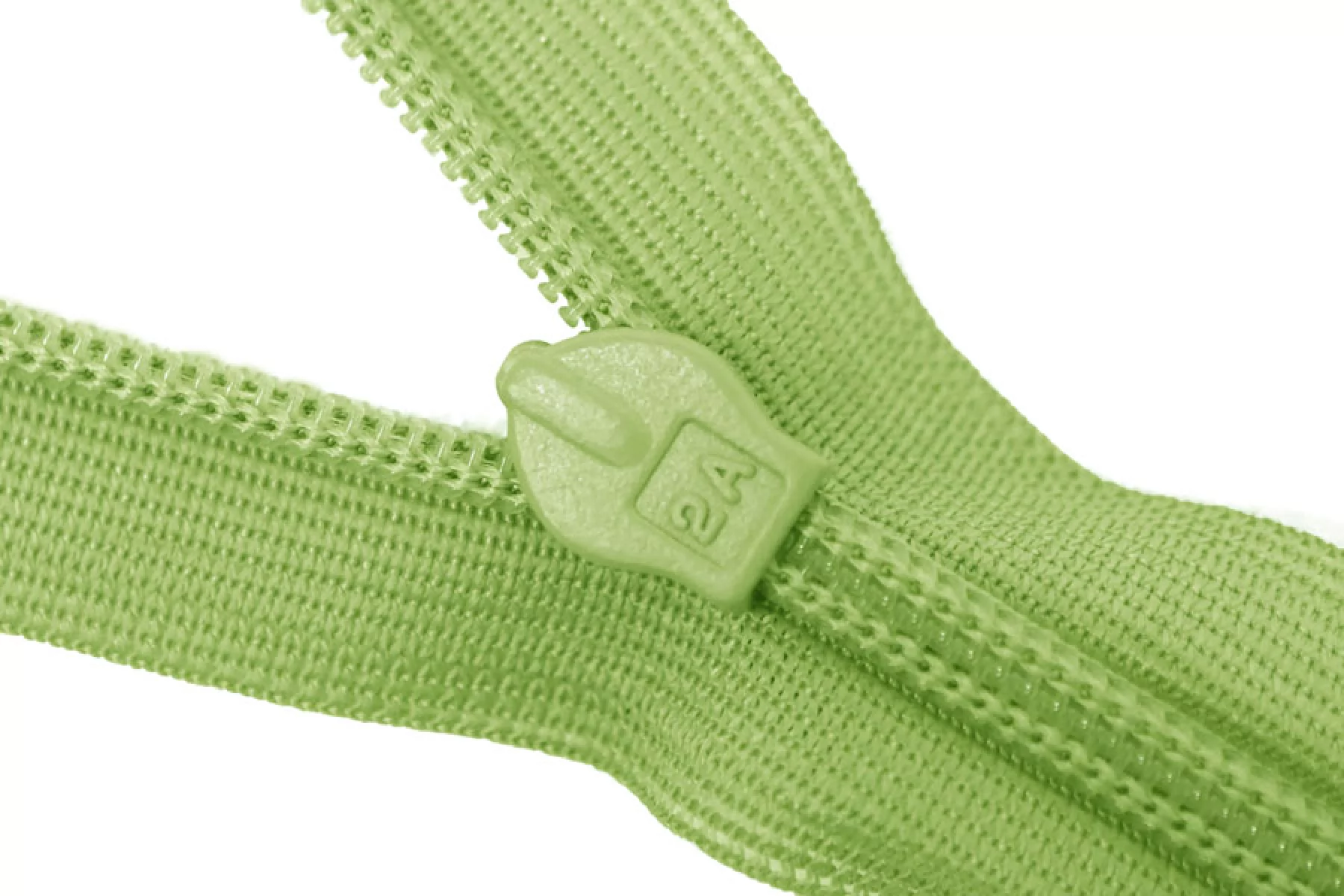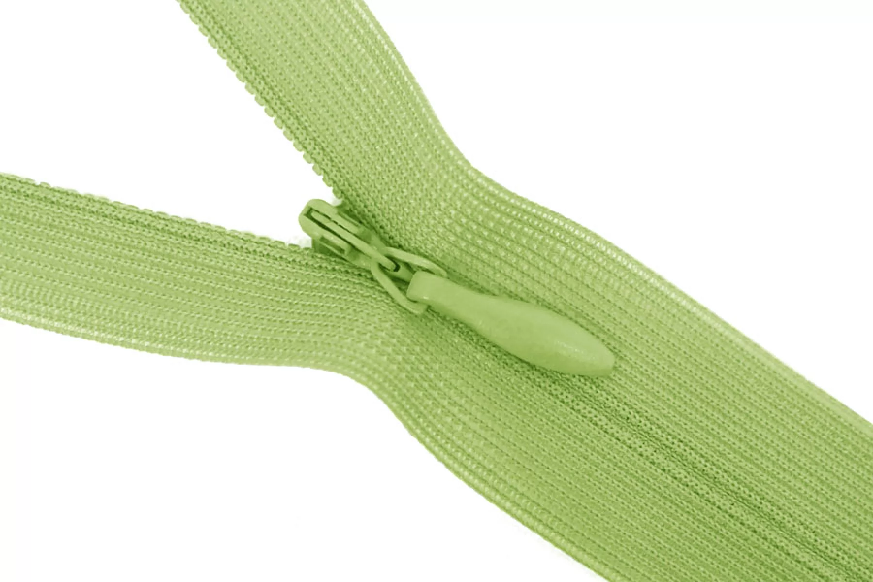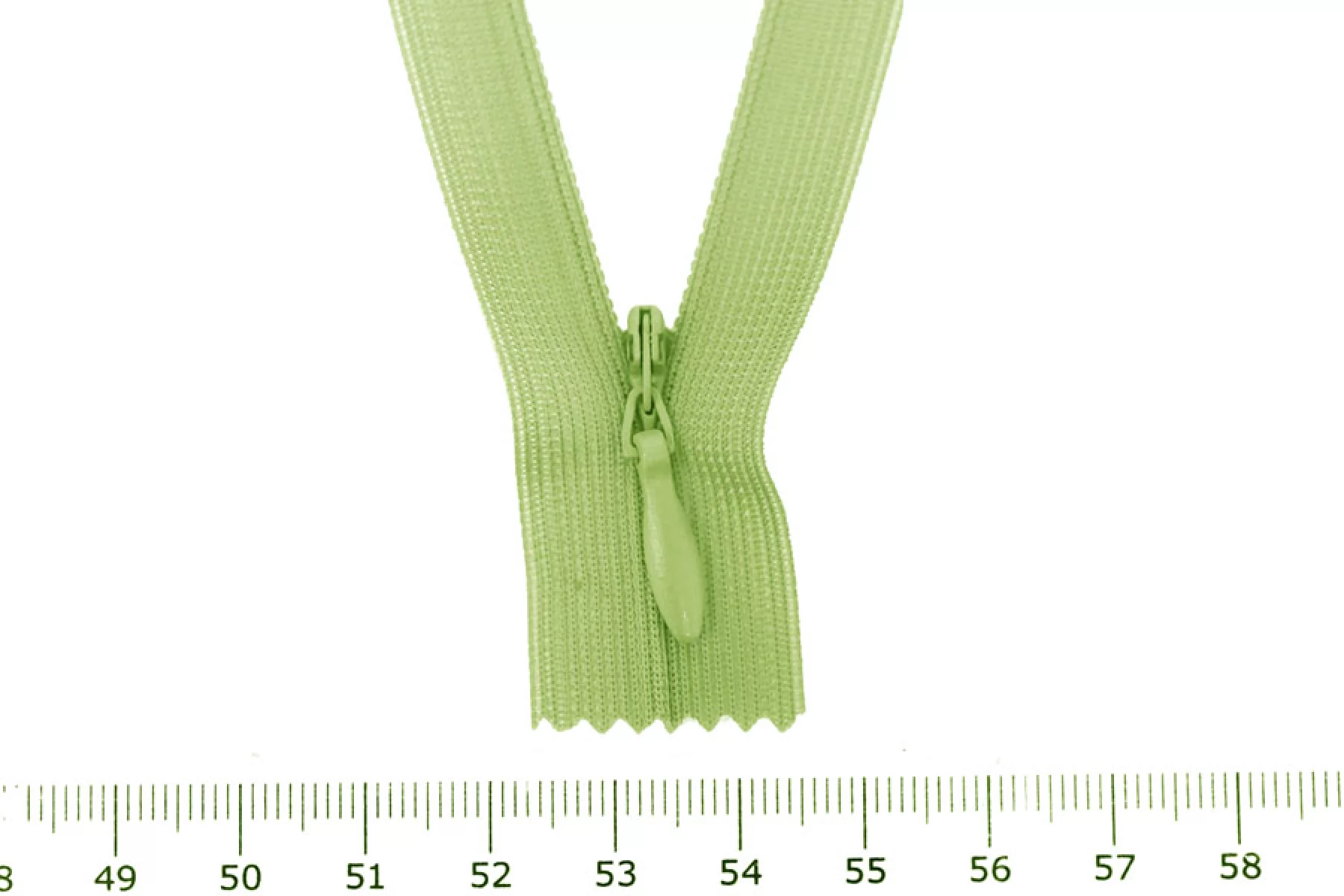 Молния потайная светло салатовая, длина 24 см. Слайдер и пуллер - метал. в цвет молнии. Ширина молнии 2.2 см , ширина зубцов 4мм.