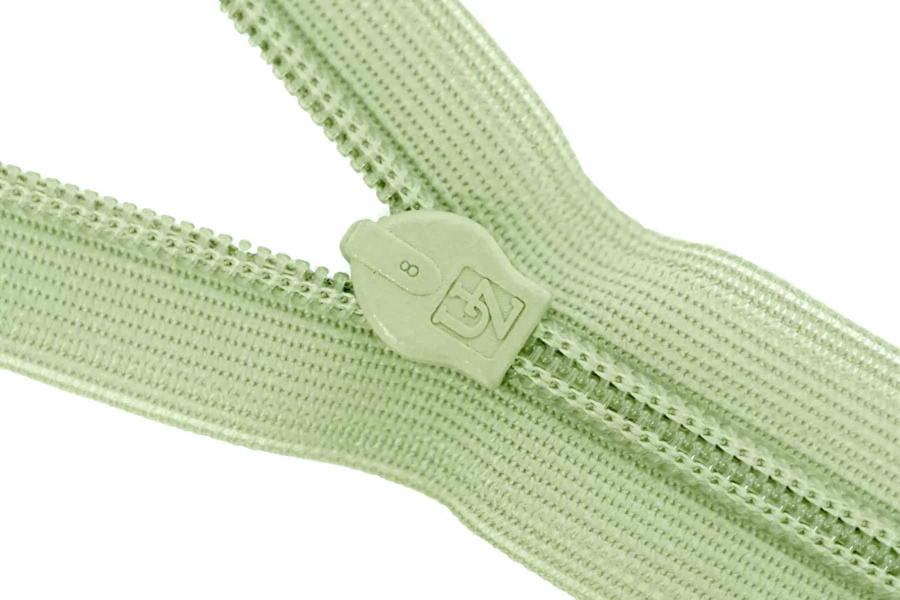 Молния потайная светло зеленая, длина 25 см. Слайдер и пуллер - метал. в цвет молнии. Ширина молнии 2.2 см , ширина зубцов 4мм.