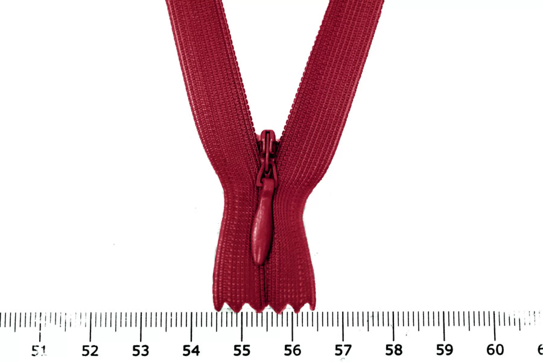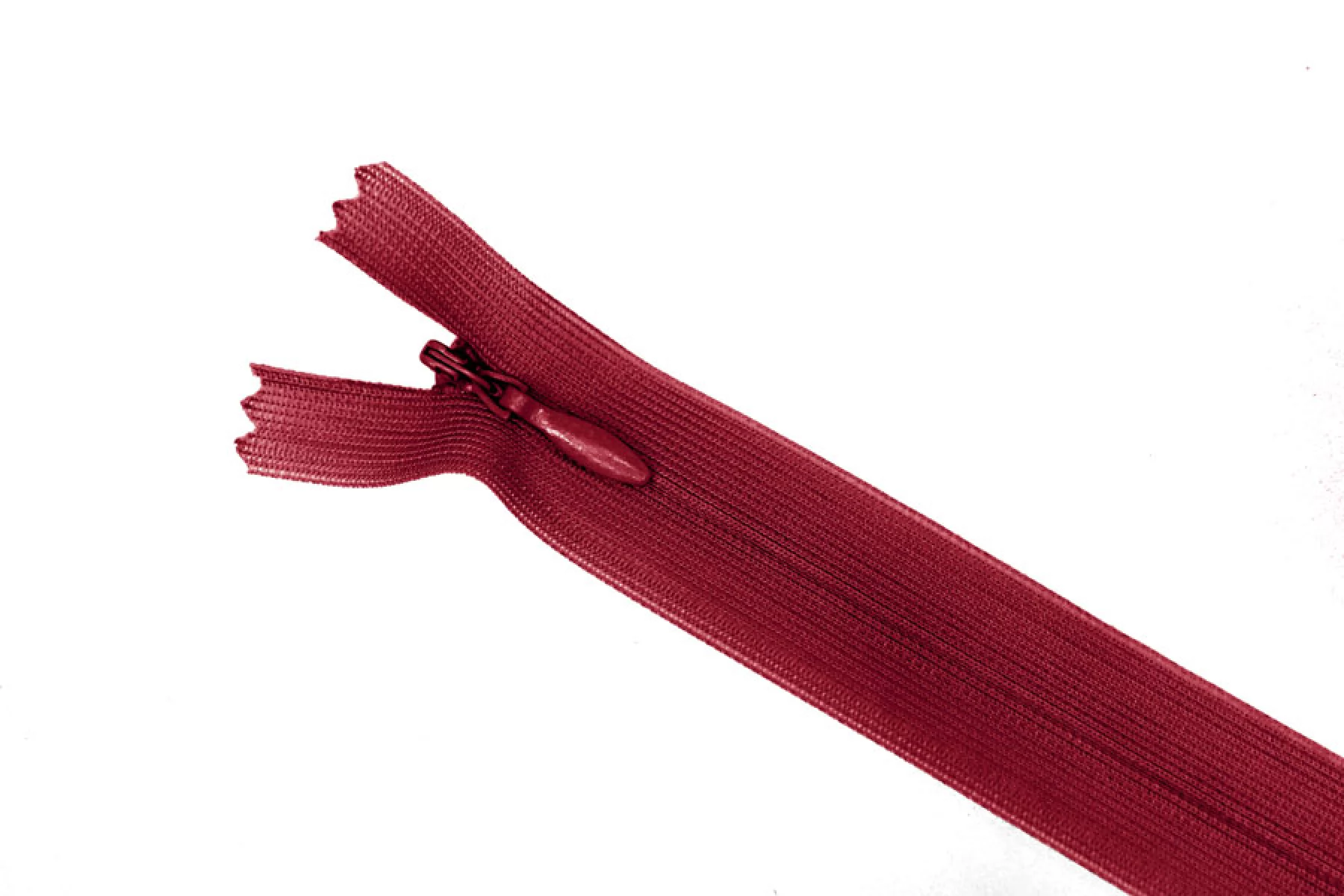 Потайная молния темно красного цвета, длина 18 см. Неразъемная. Зубцы пластиковые, слайдер и пуллер - металл. Ширина молнии 2 см. Ширина зубцов 4 мм.