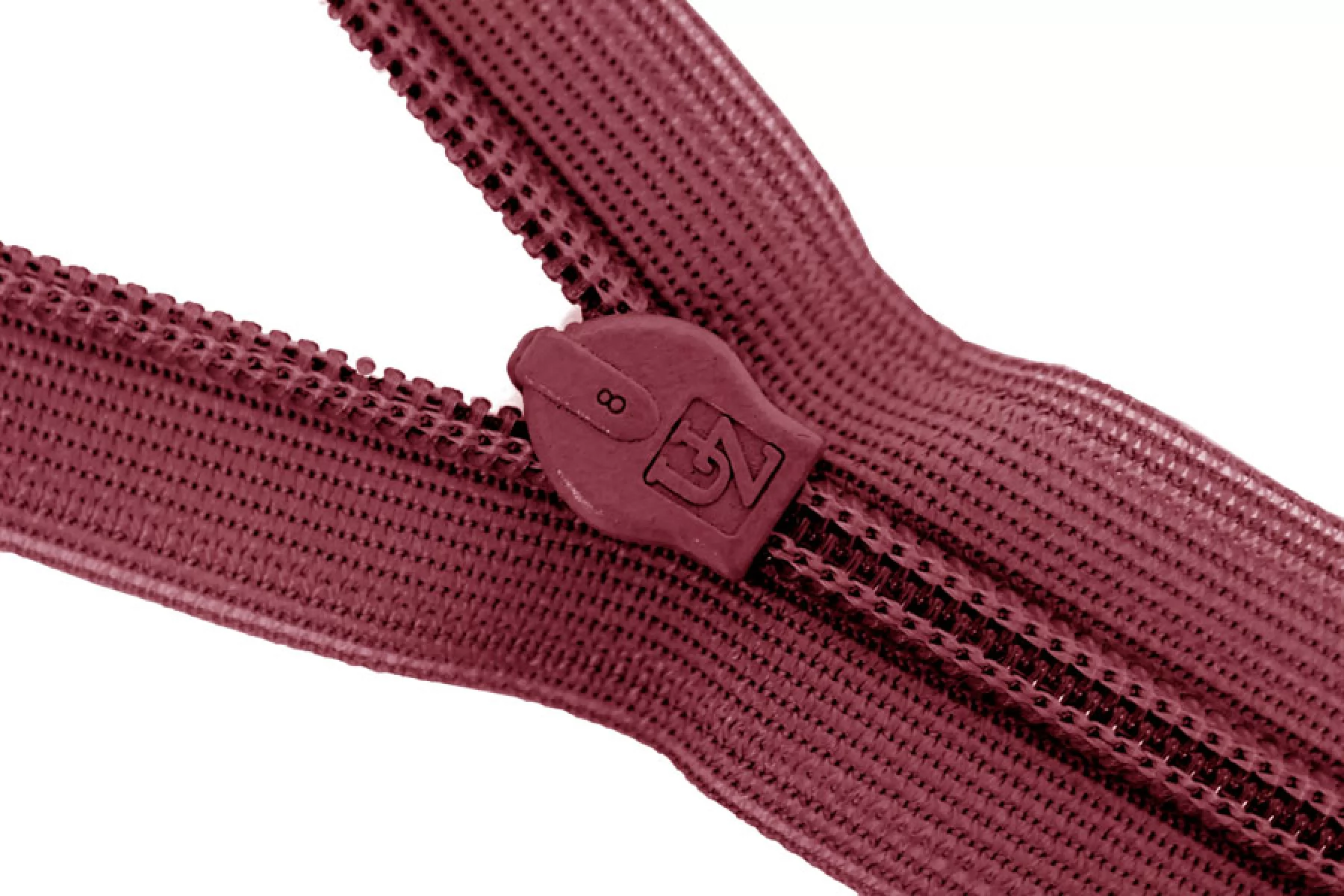 Потайная молния темно красного цвета, длина 22 см. Неразъемная. Зубцы пластиковые, слайдер и пуллер - металл. Ширина молнии 2 см. Ширина зубцов 4 мм.