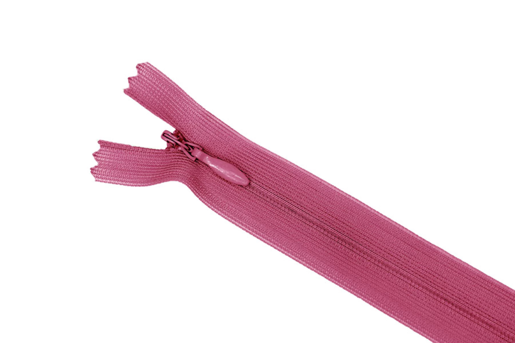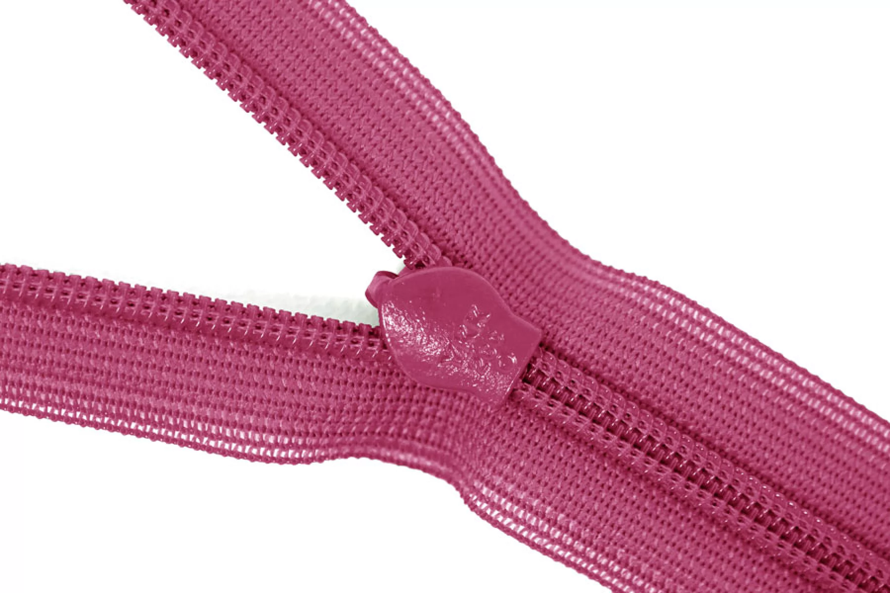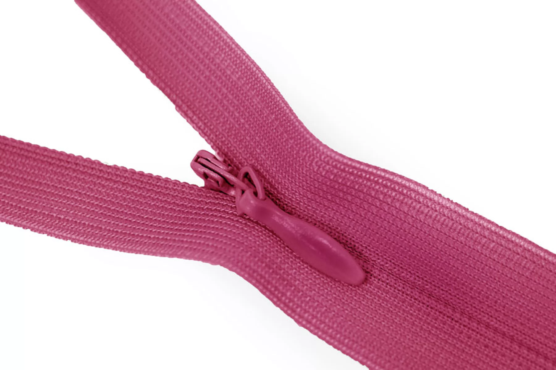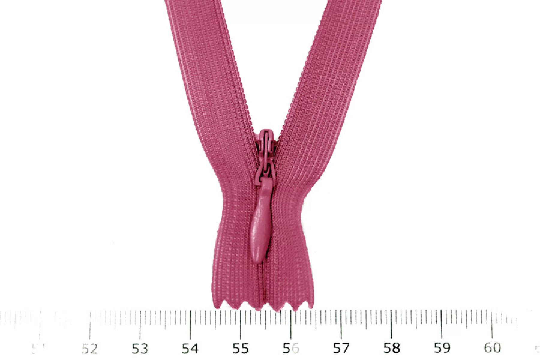 Потайная молния ярко розового цвета, длина 75 см. Неразъемная. Зубцы пластиковые, слайдер и пуллер - металл. Ширина молнии 2 см. Ширина зубцов 4 мм.
