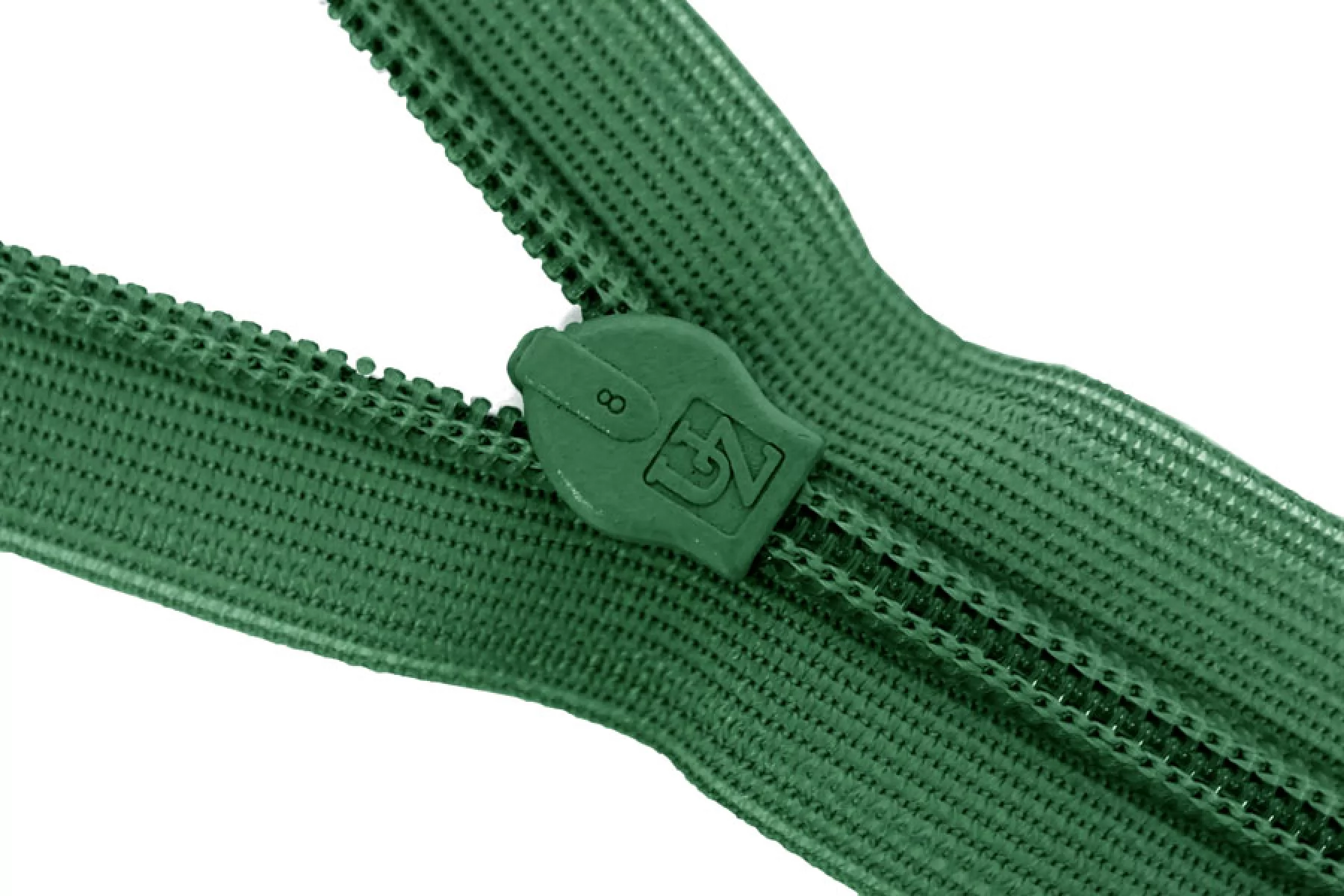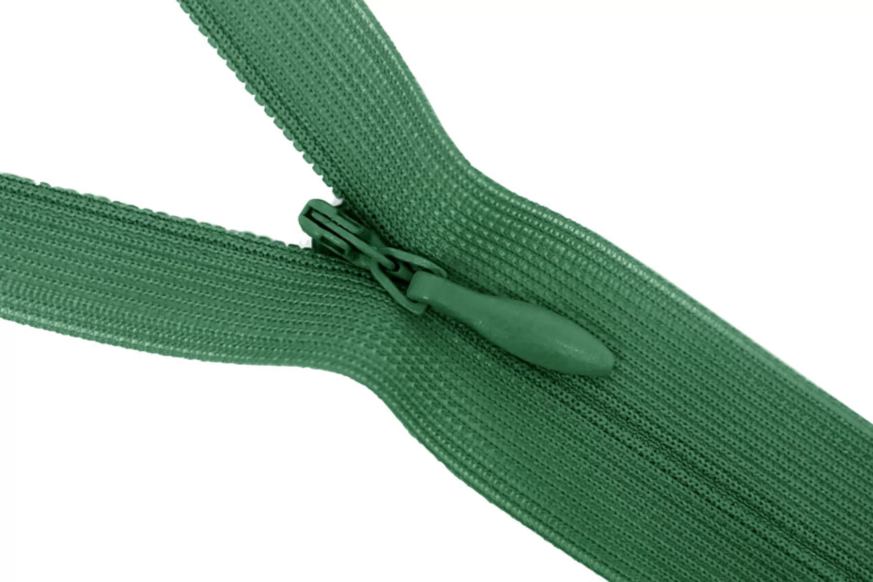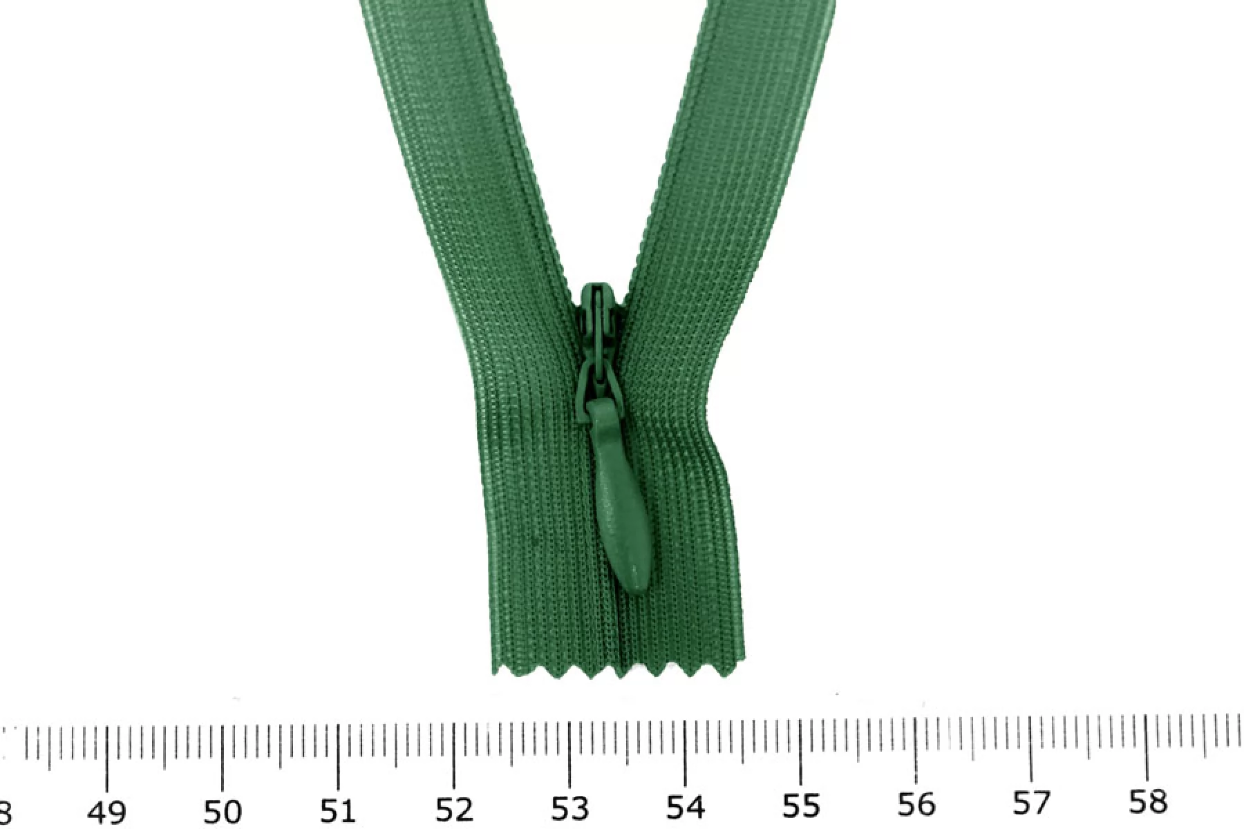Молния потайная зеленая, длина 39 см. Слайдер и пуллер - метал. в цвет молнии. Ширина молнии 2.2 см , ширина зубцов 4мм.