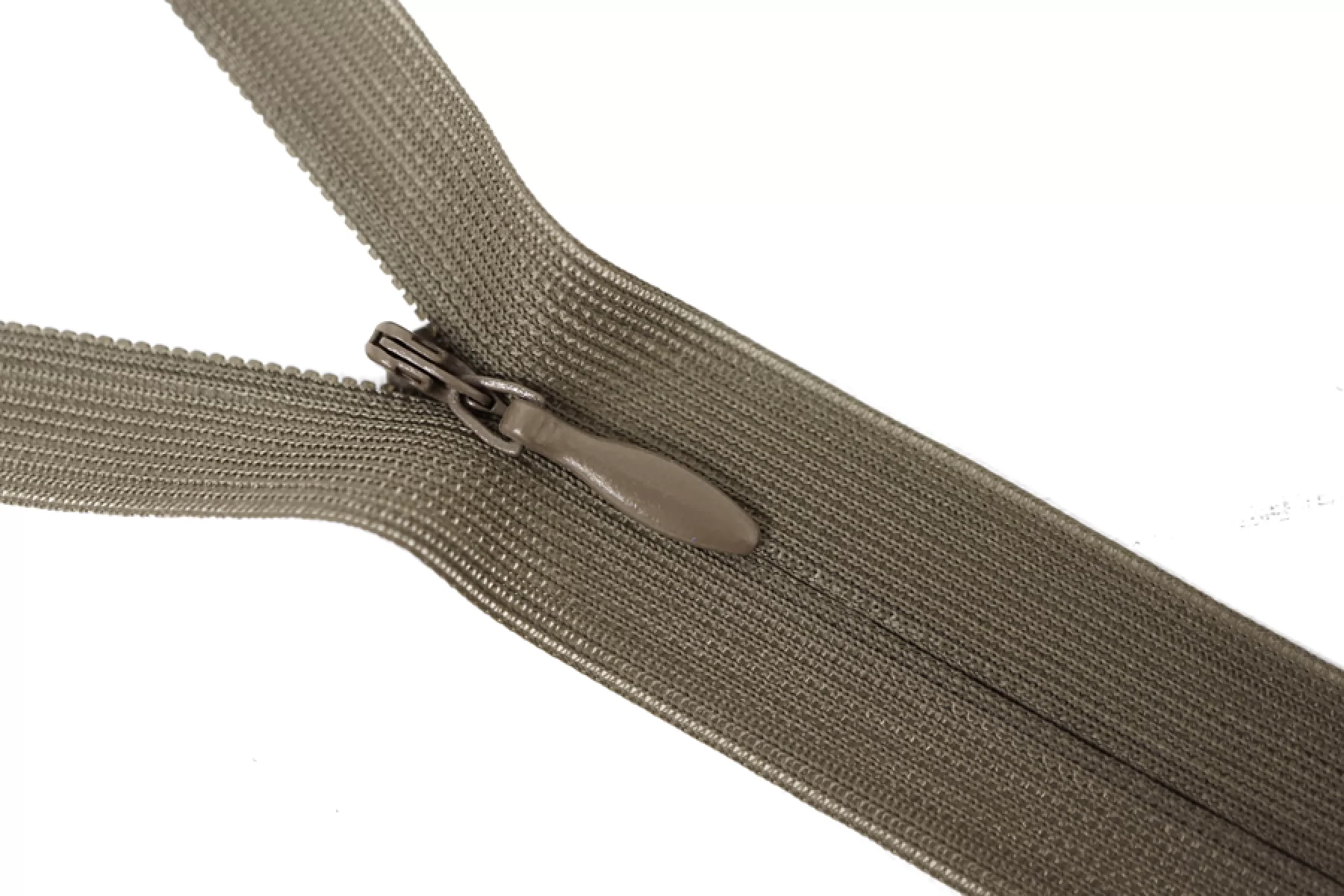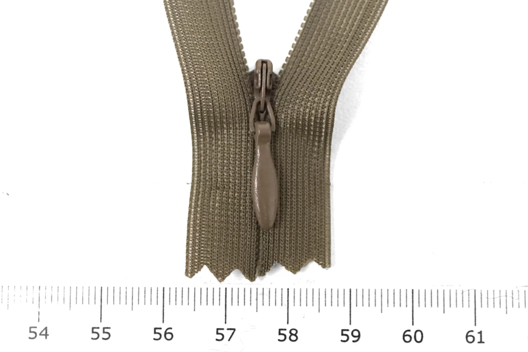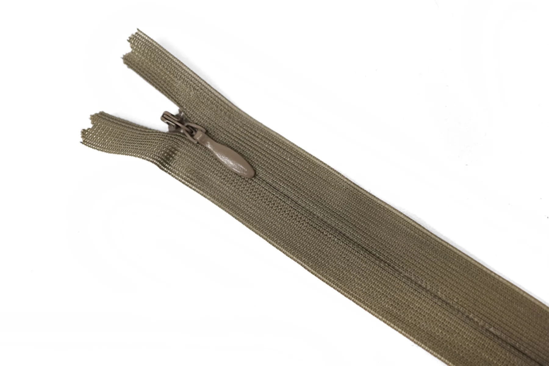 Потайная молния пыльно-коричневого цвета от KCC , длина 20 см. Слайдер и пуллер метал. в цвет молнии. Ширина молнии 2.2 см , ширина зубцов 4мм.