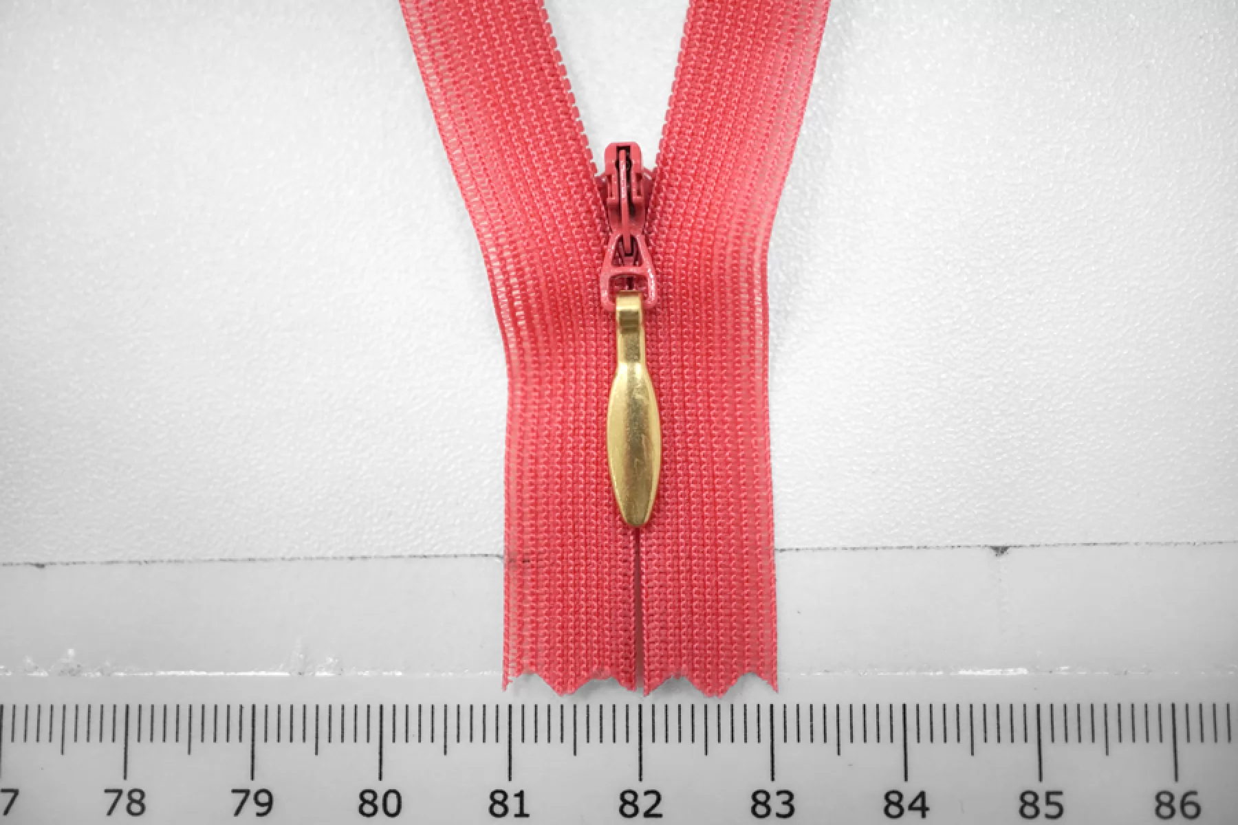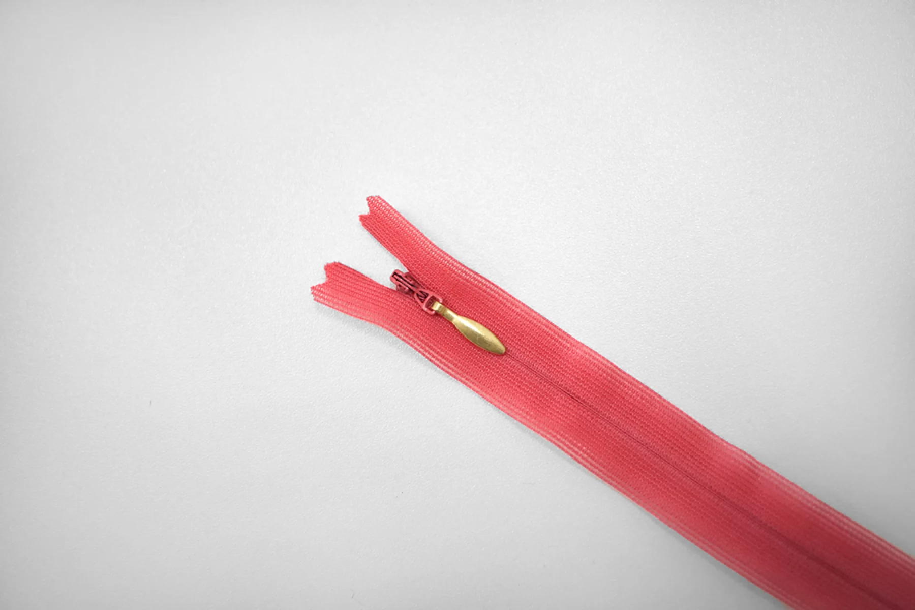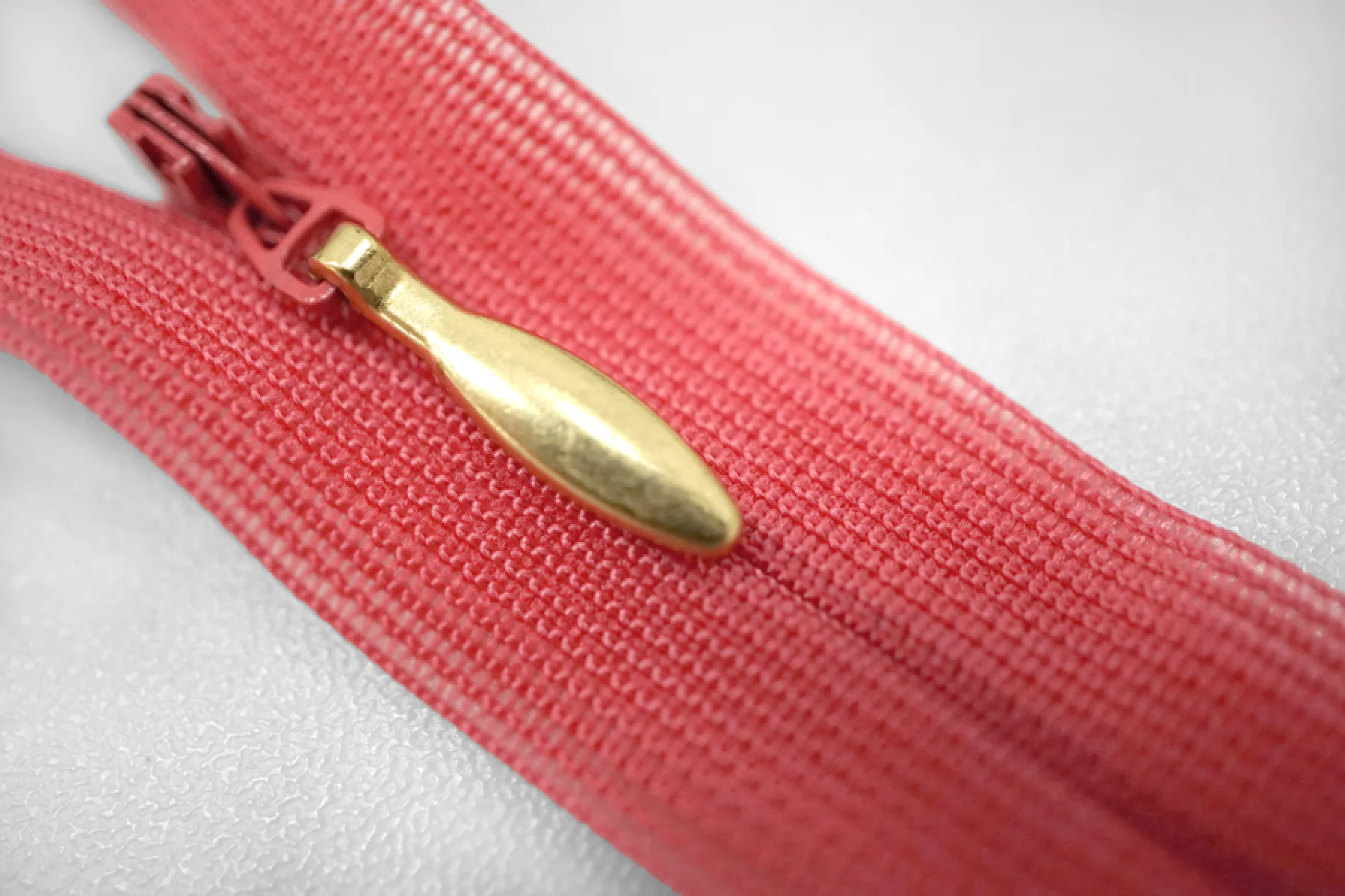 Потайная молния малинового цвета от YKK, с золотистым пулером, длина 16 см.