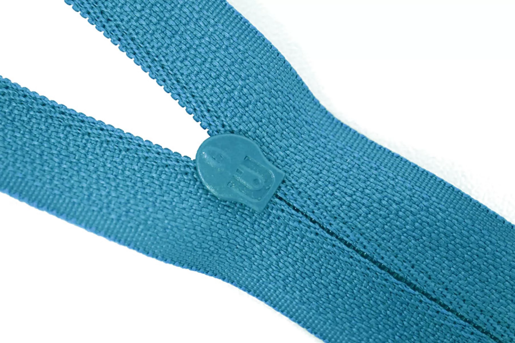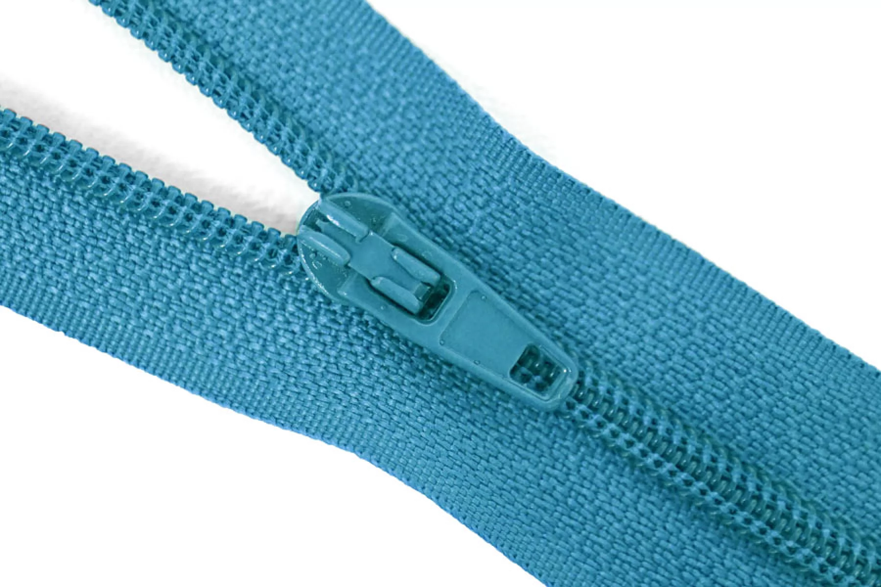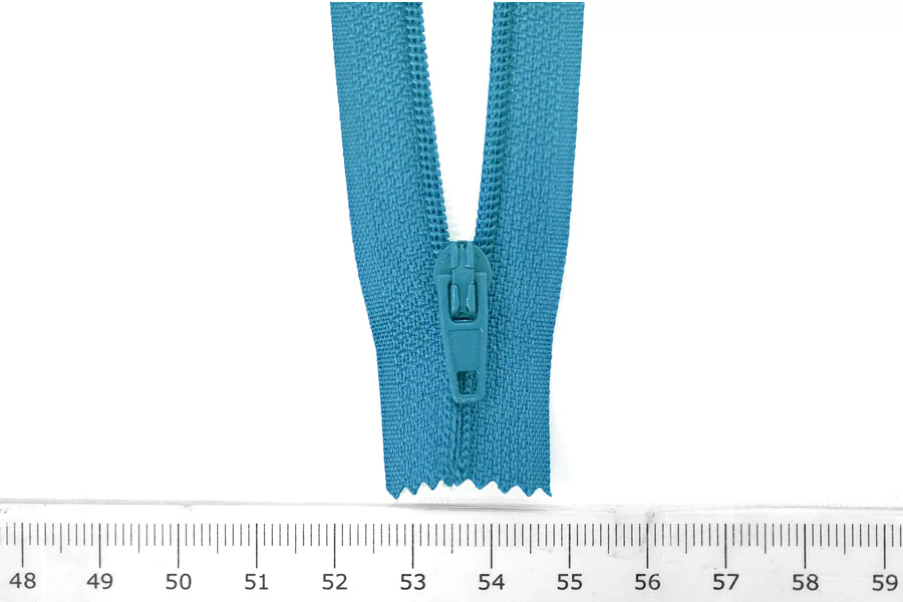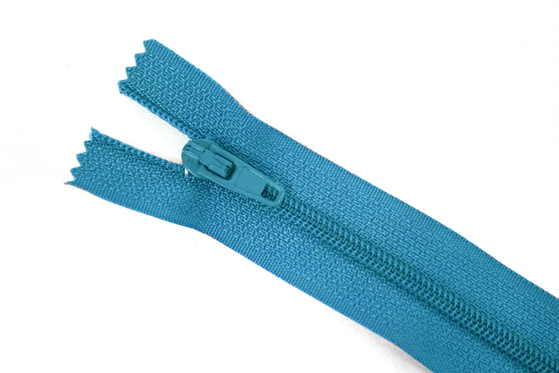 Пластиковая молния бирюзового цвета, длина 21 см. Неразъемная. Зубцы пластиковые, слайдер и пуллер - металл.