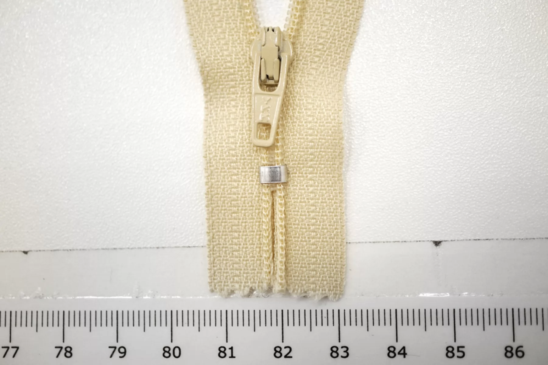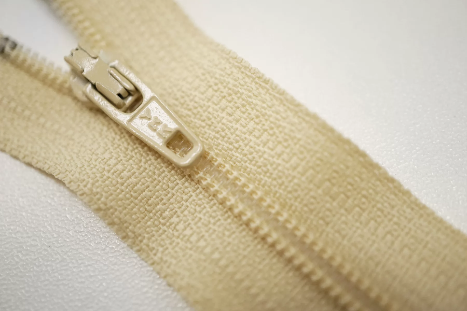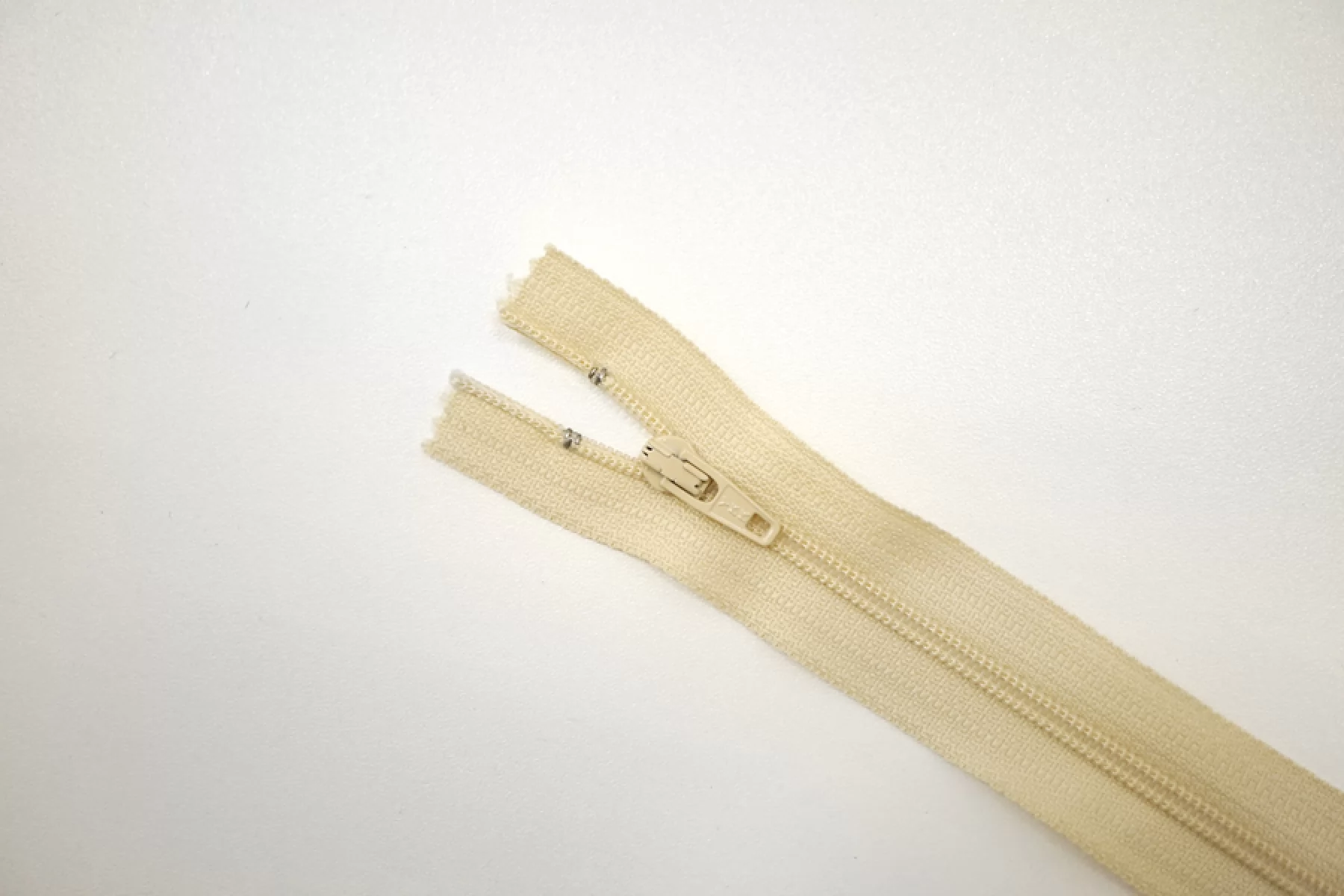 Молния брючная спиральная неразъёмная, однозамковая, бежево-желтого цвета, от YKK. Длина 28 см.