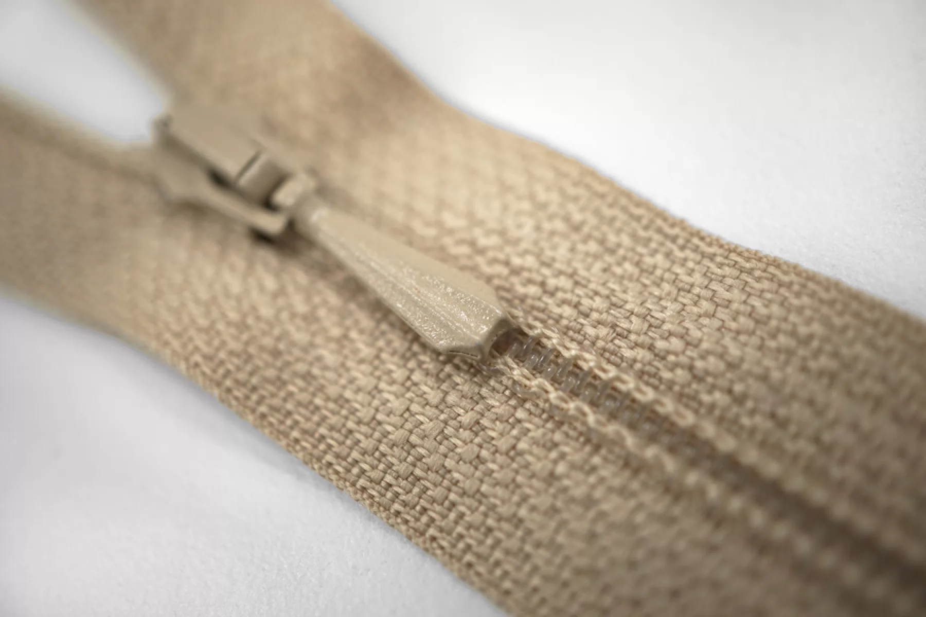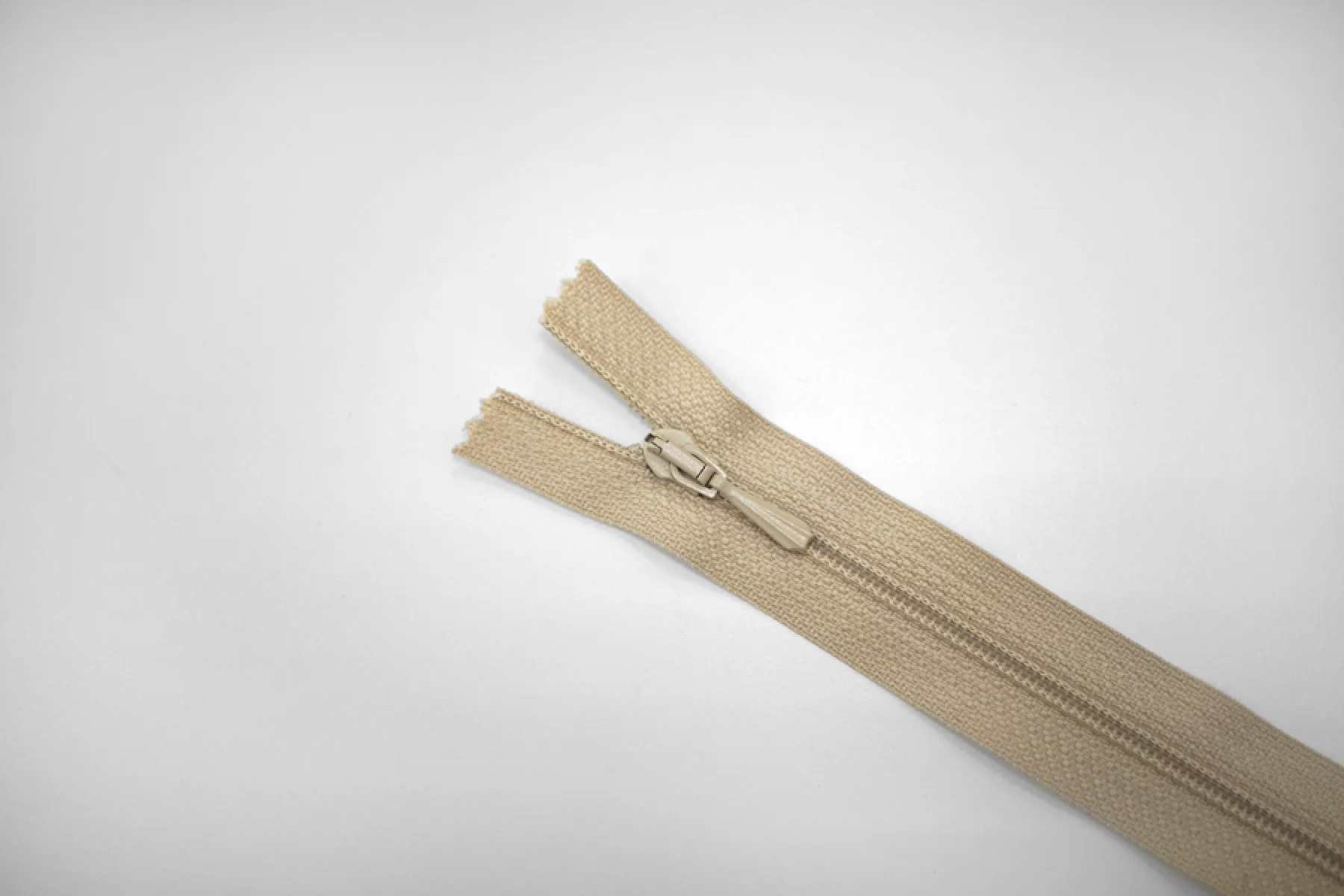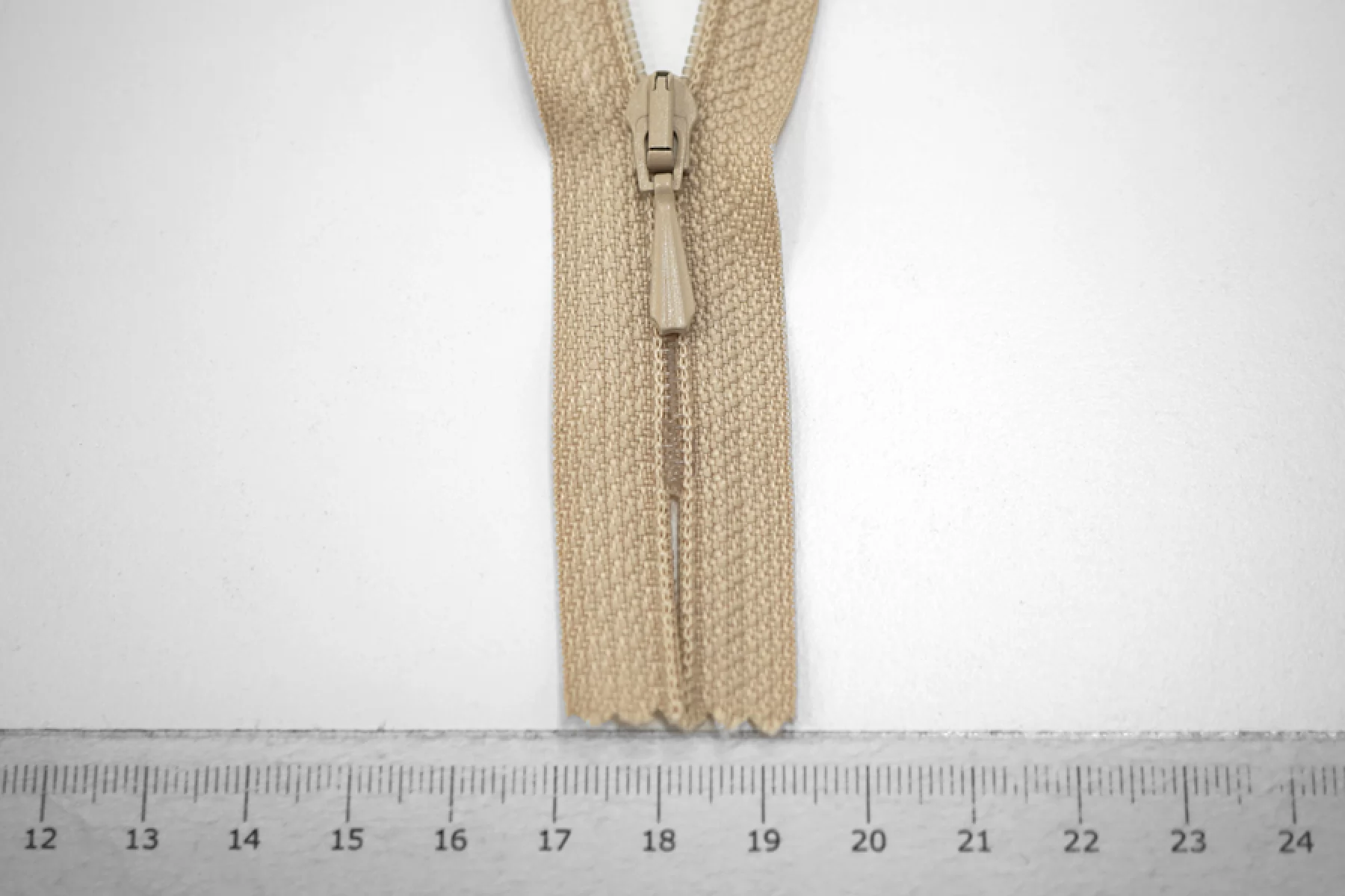 Молния брючная спиральная неразъёмная, однозамковая, бежевого цвета, от Lampo. Длина 22 см.