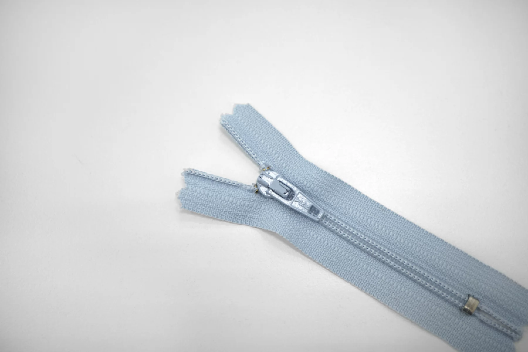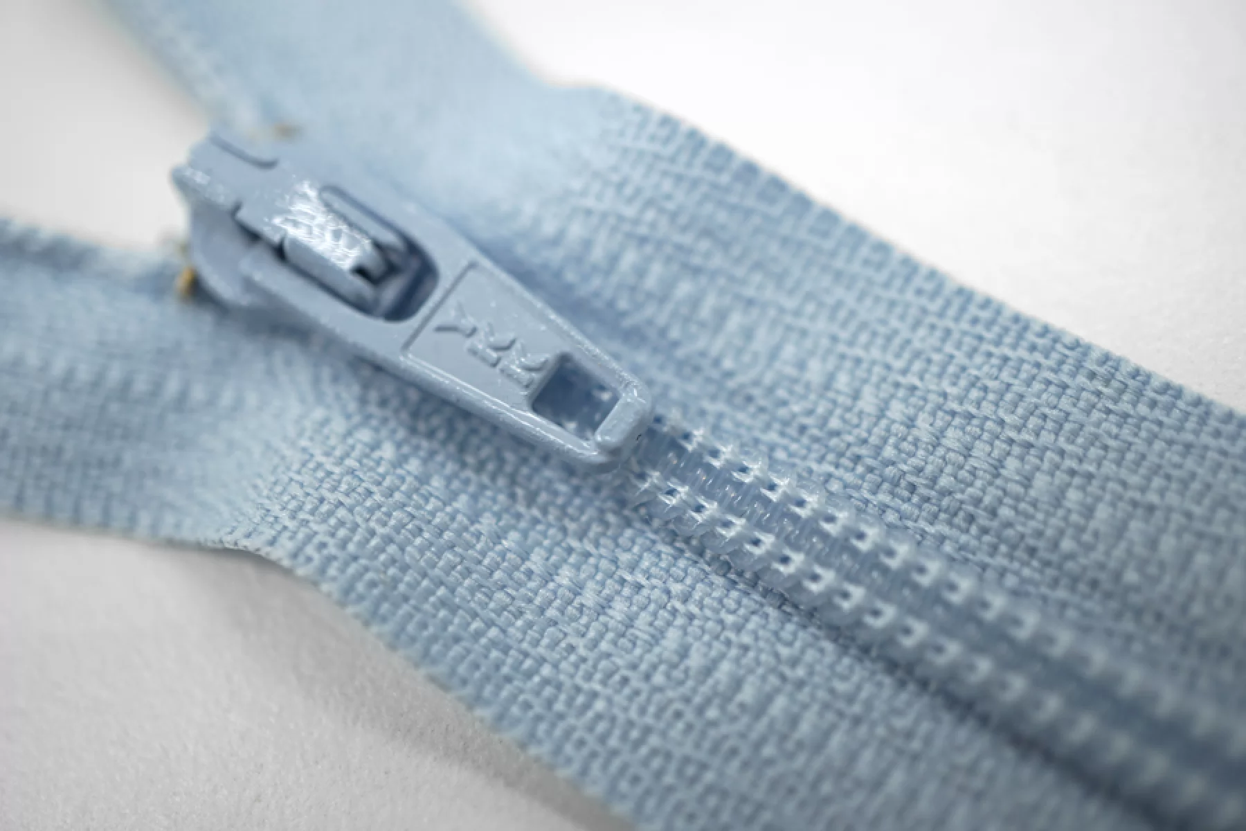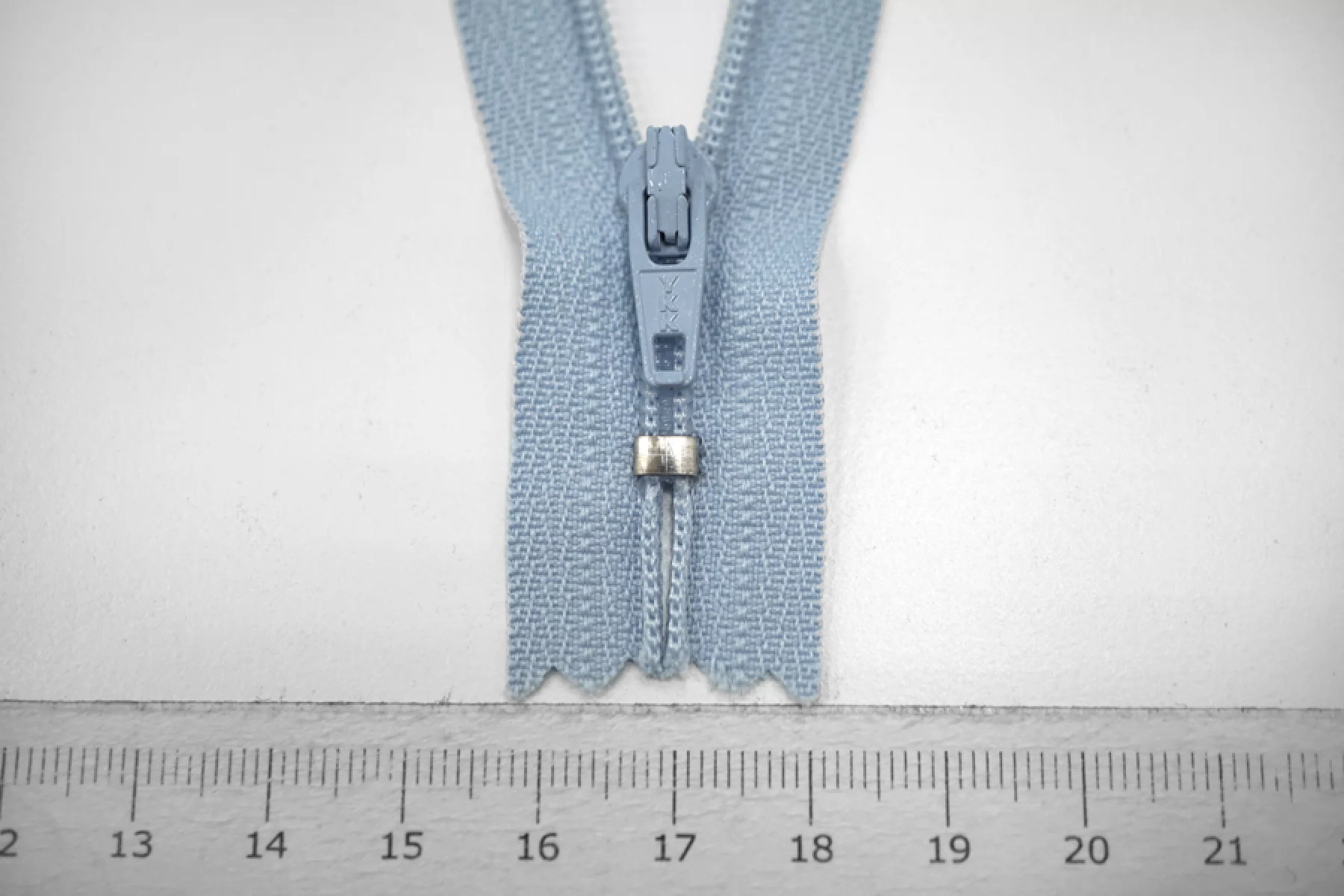 Молния брючная спиральная неразъёмная, однозамковая, голубого цвета, от YKK. Длина 7 см.