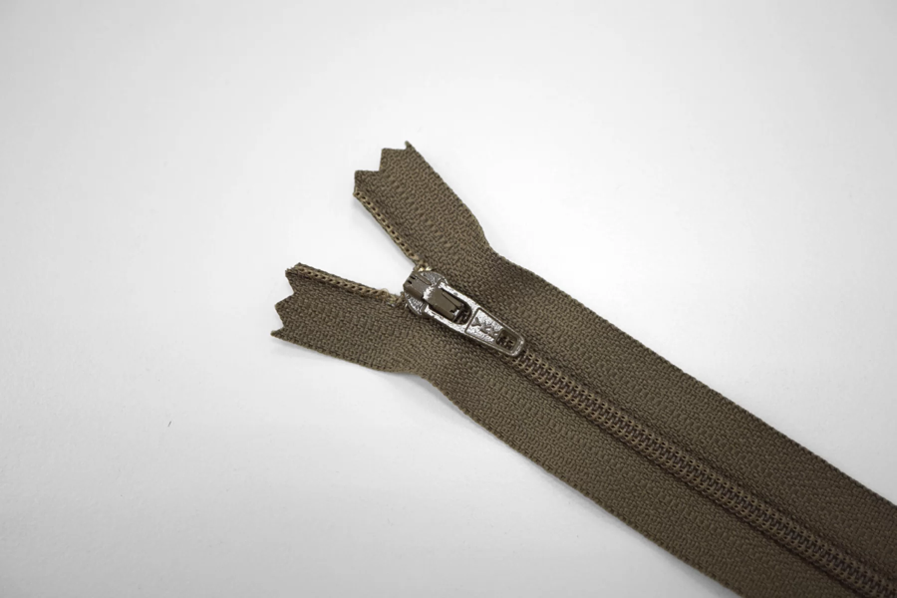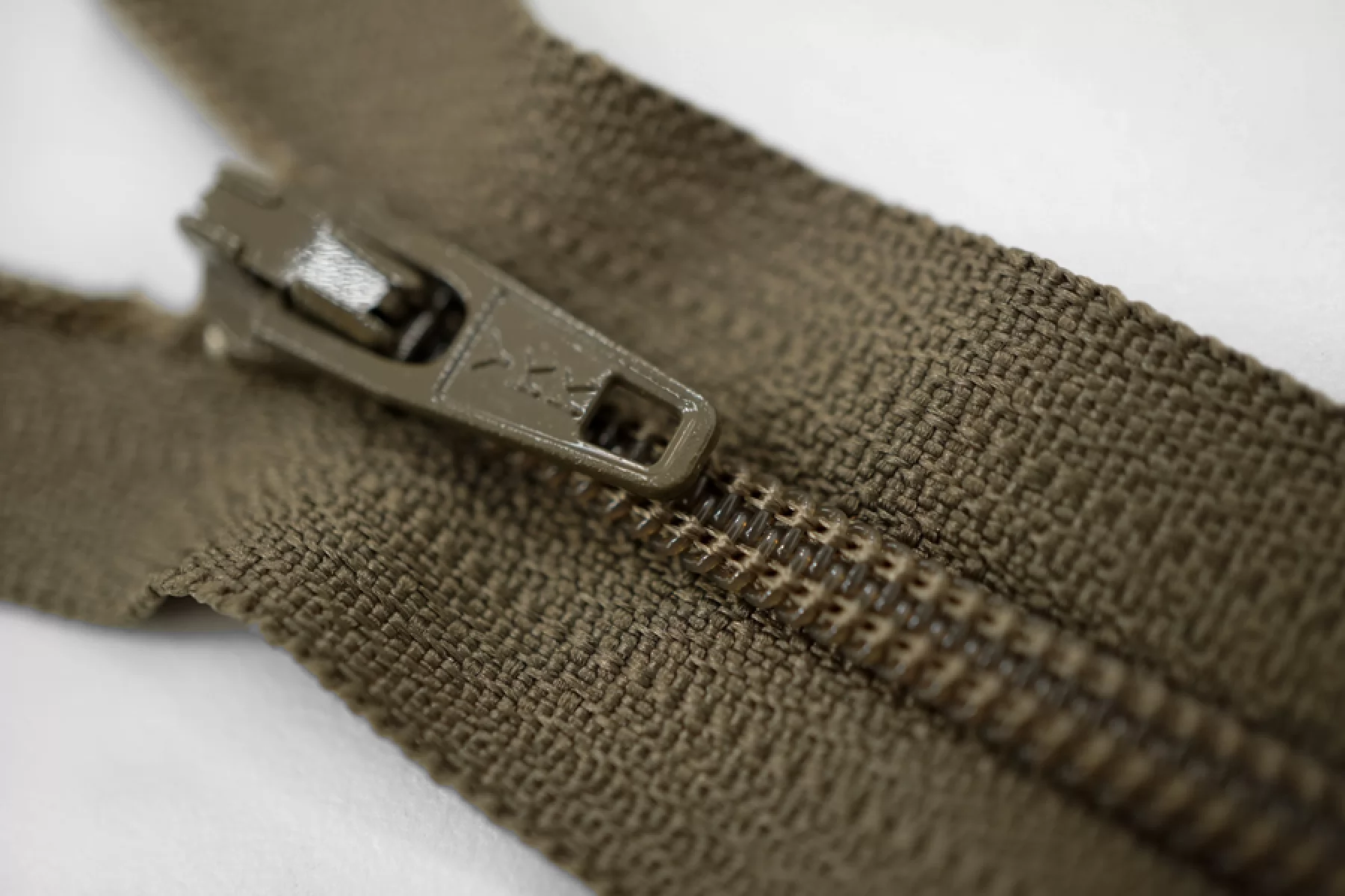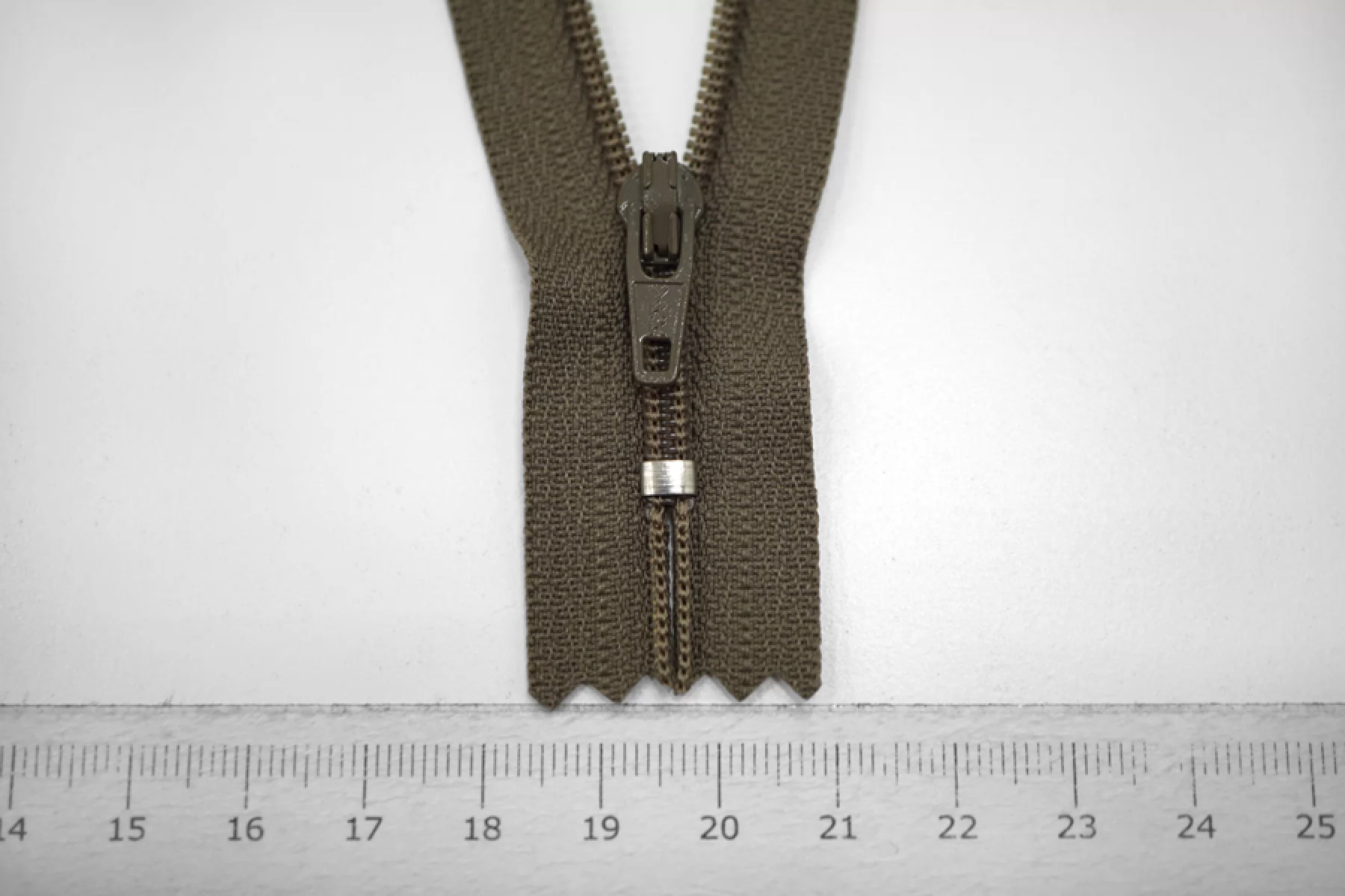 Молния брючная спиральная неразъёмная, однозамковая, в оттенке хаки, от YKK. Длина 10 см.