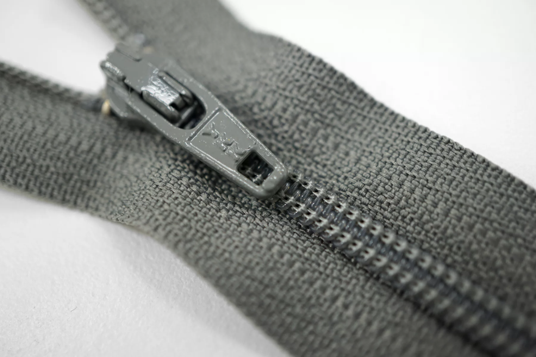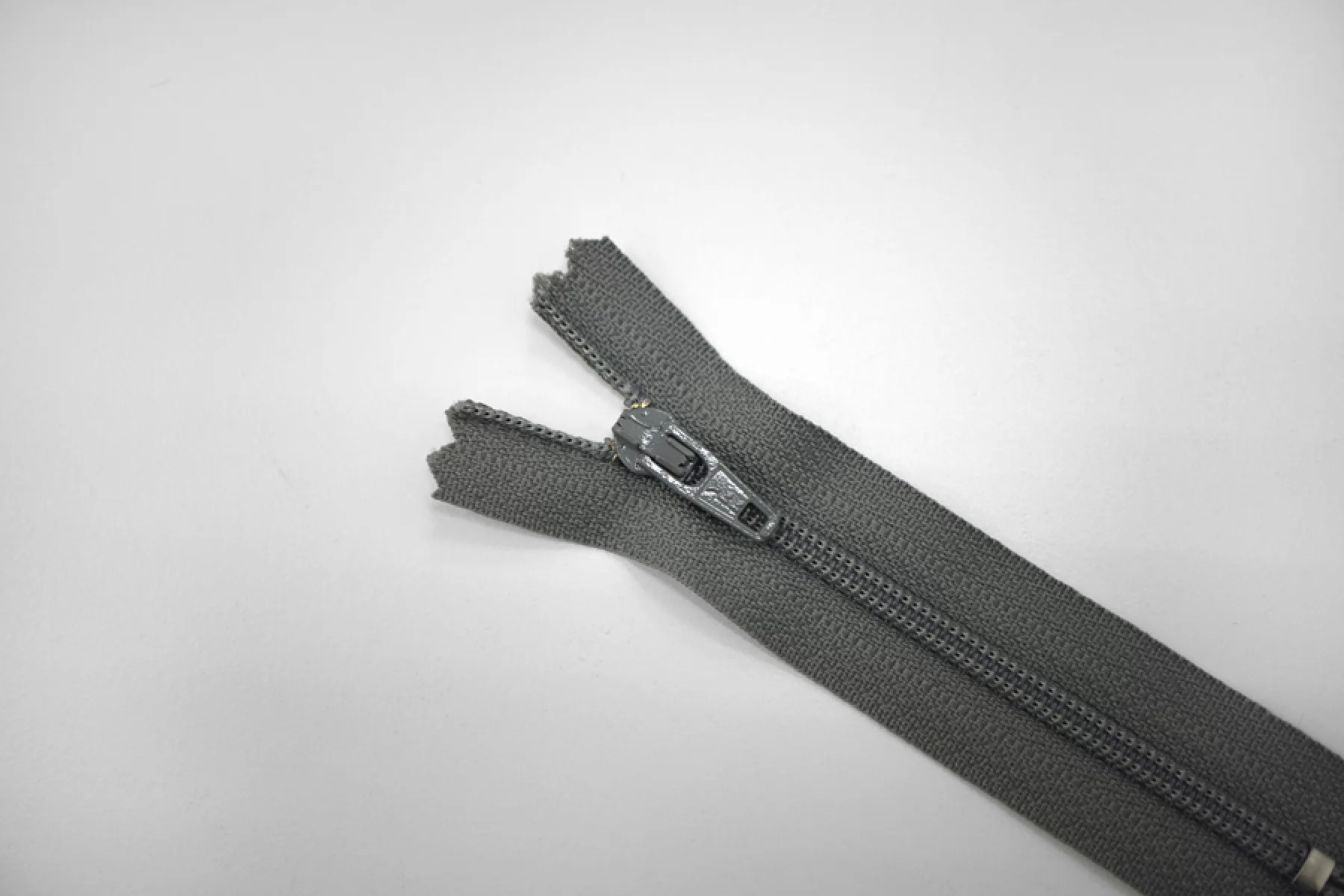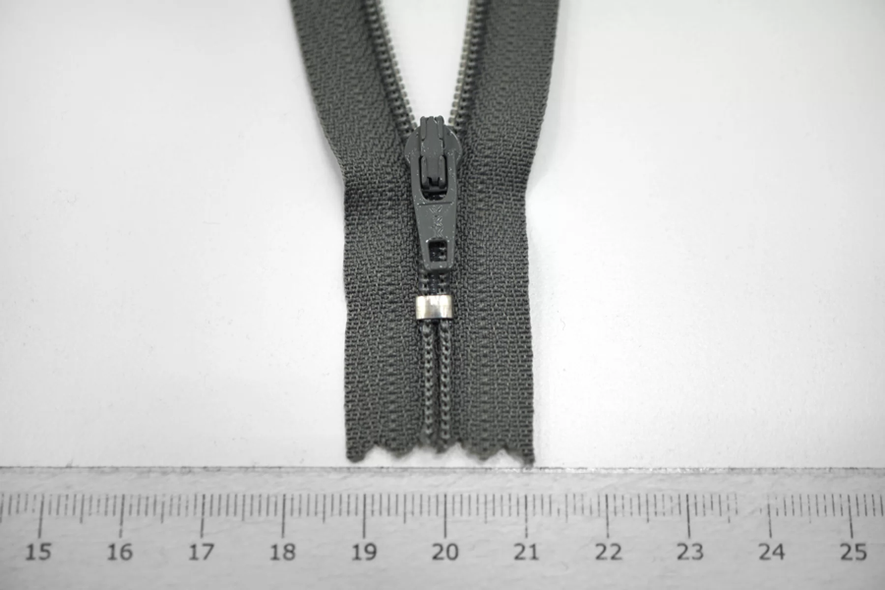 Молния брючная спиральная неразъёмная, однозамковая, серого цвета, от YKK. Длина 9 см.