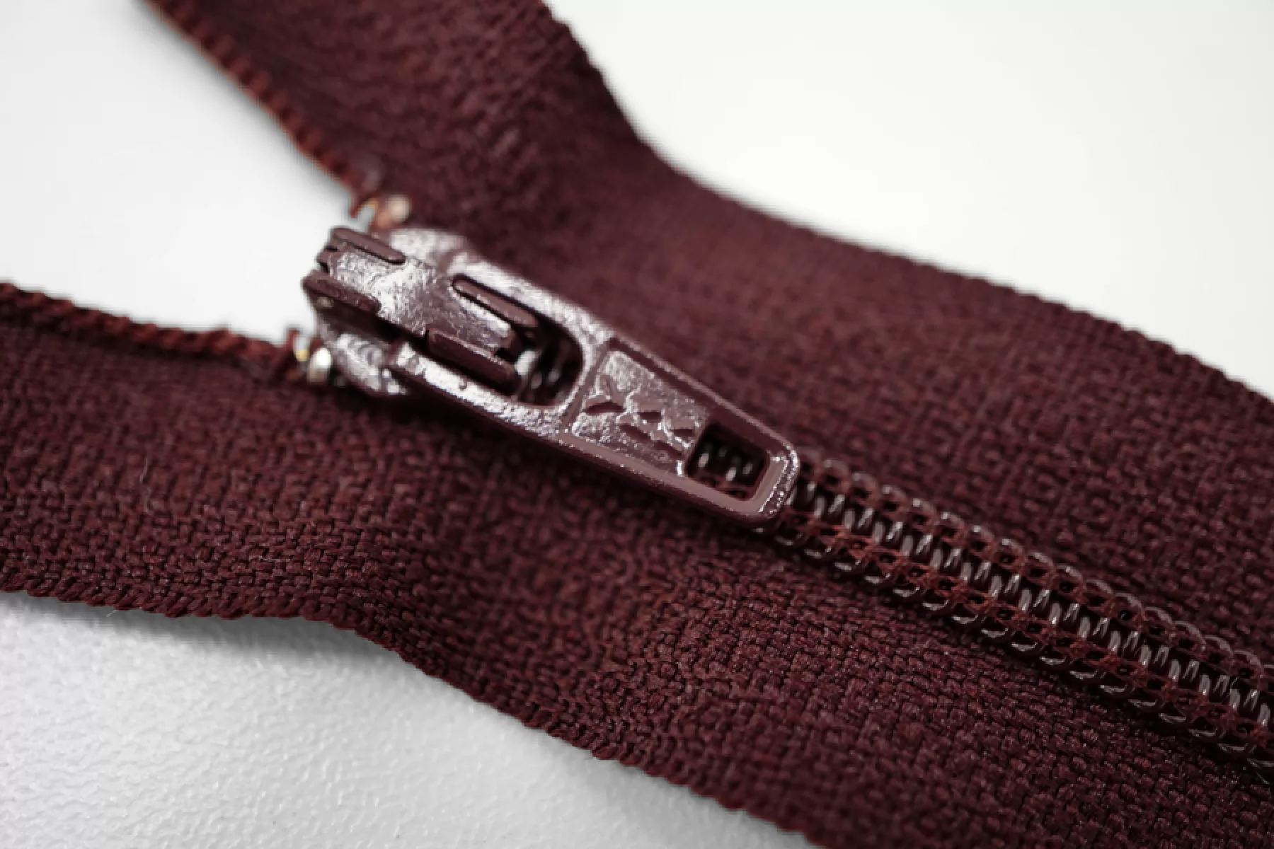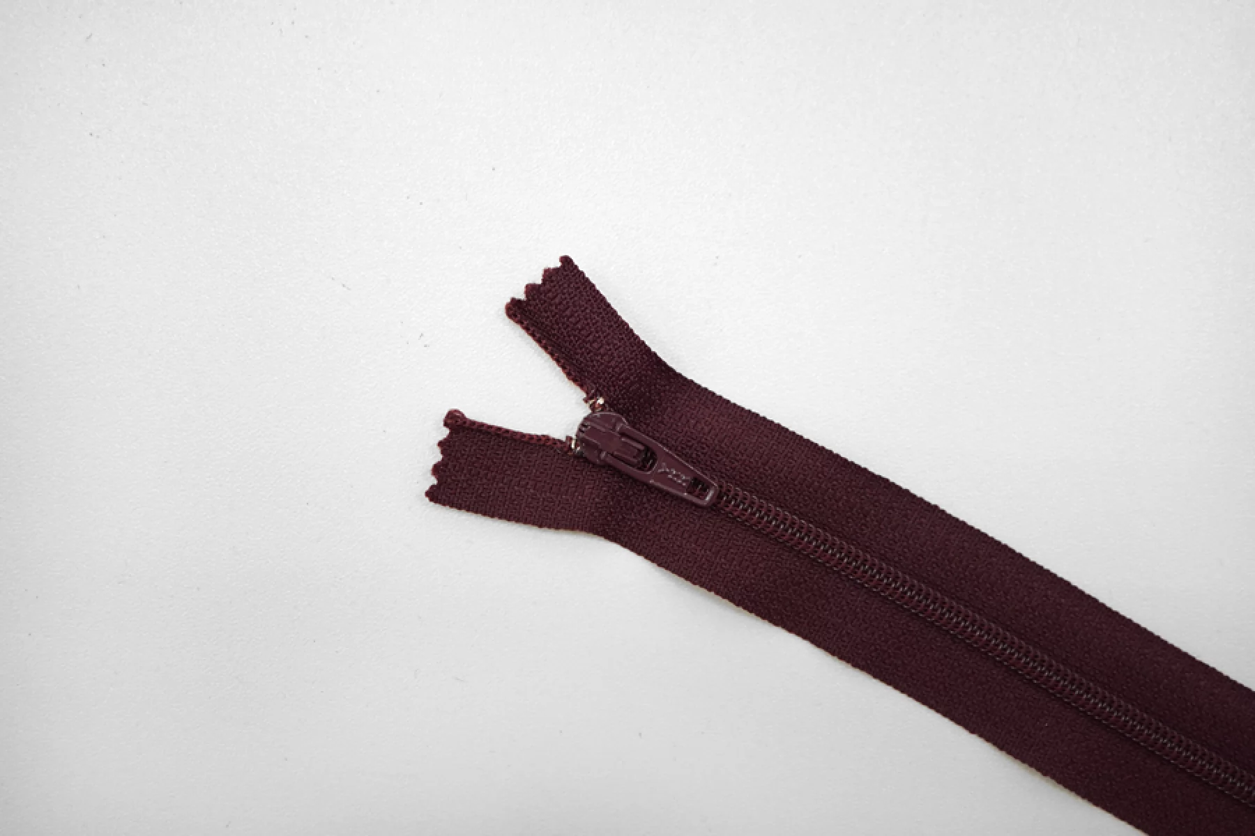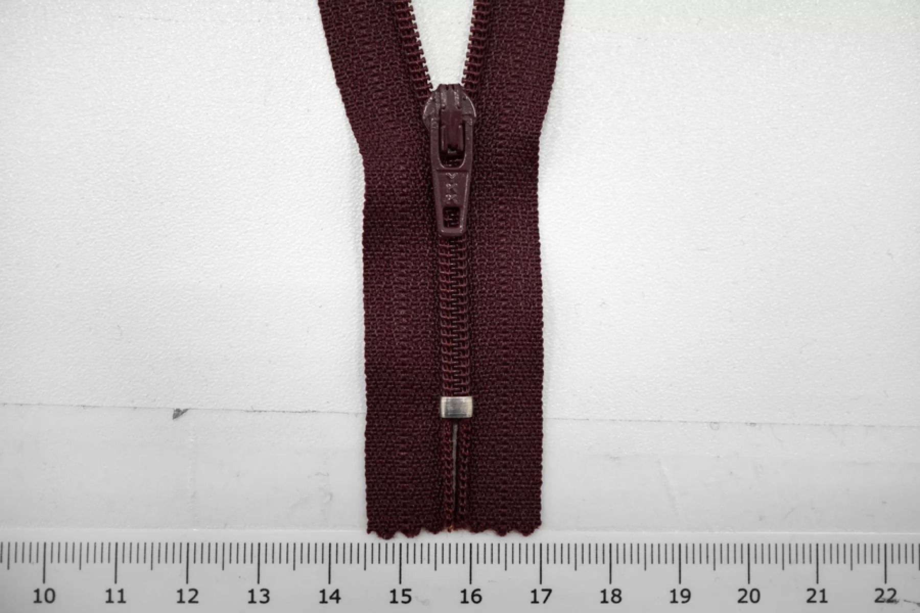 Молния спиральная брючная неразъёмная, однозамковая, темно-бордового цвета от YKK. Длина 13 см.