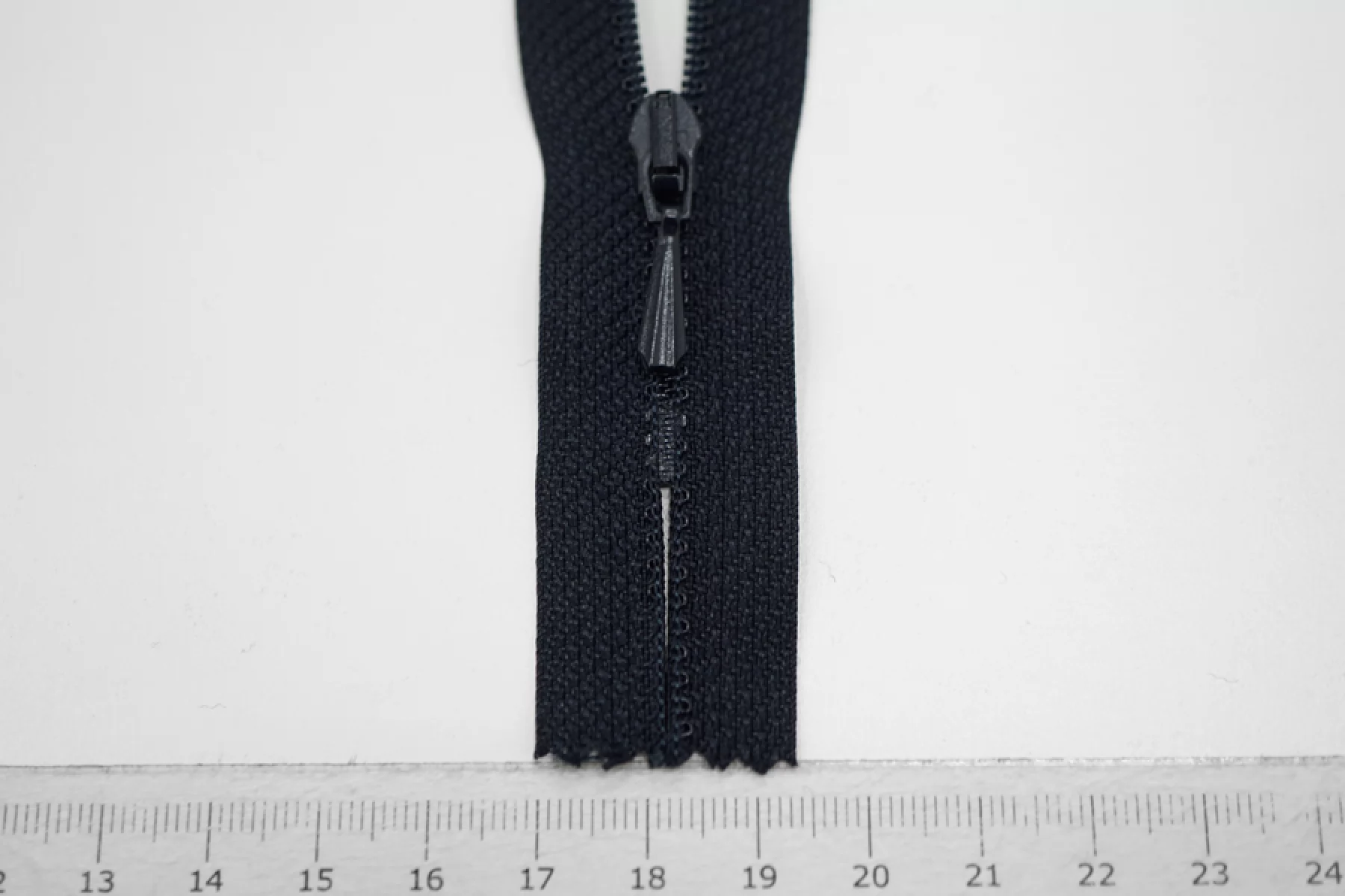 Молния брючная спиральная неразъёмная, однозамковая, темно-синего цвета, от Lampo. Длина 10 см.