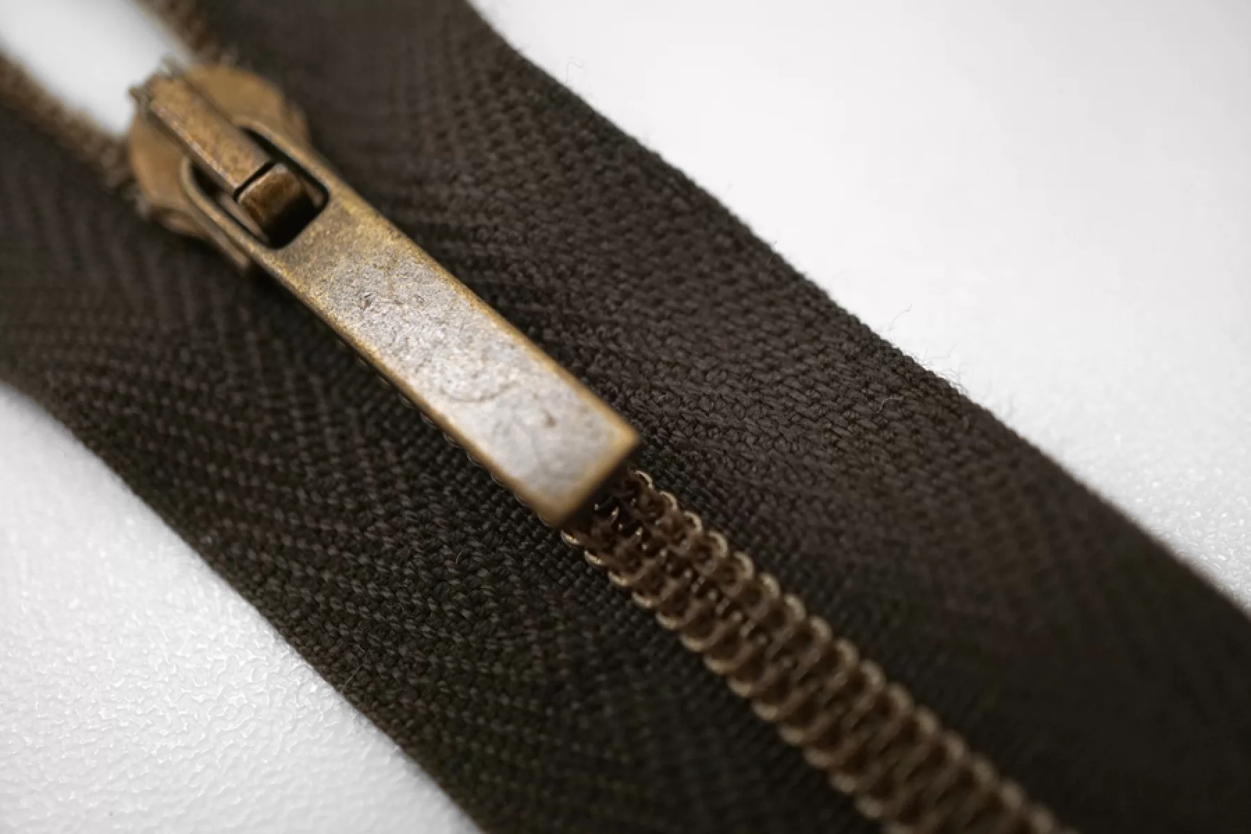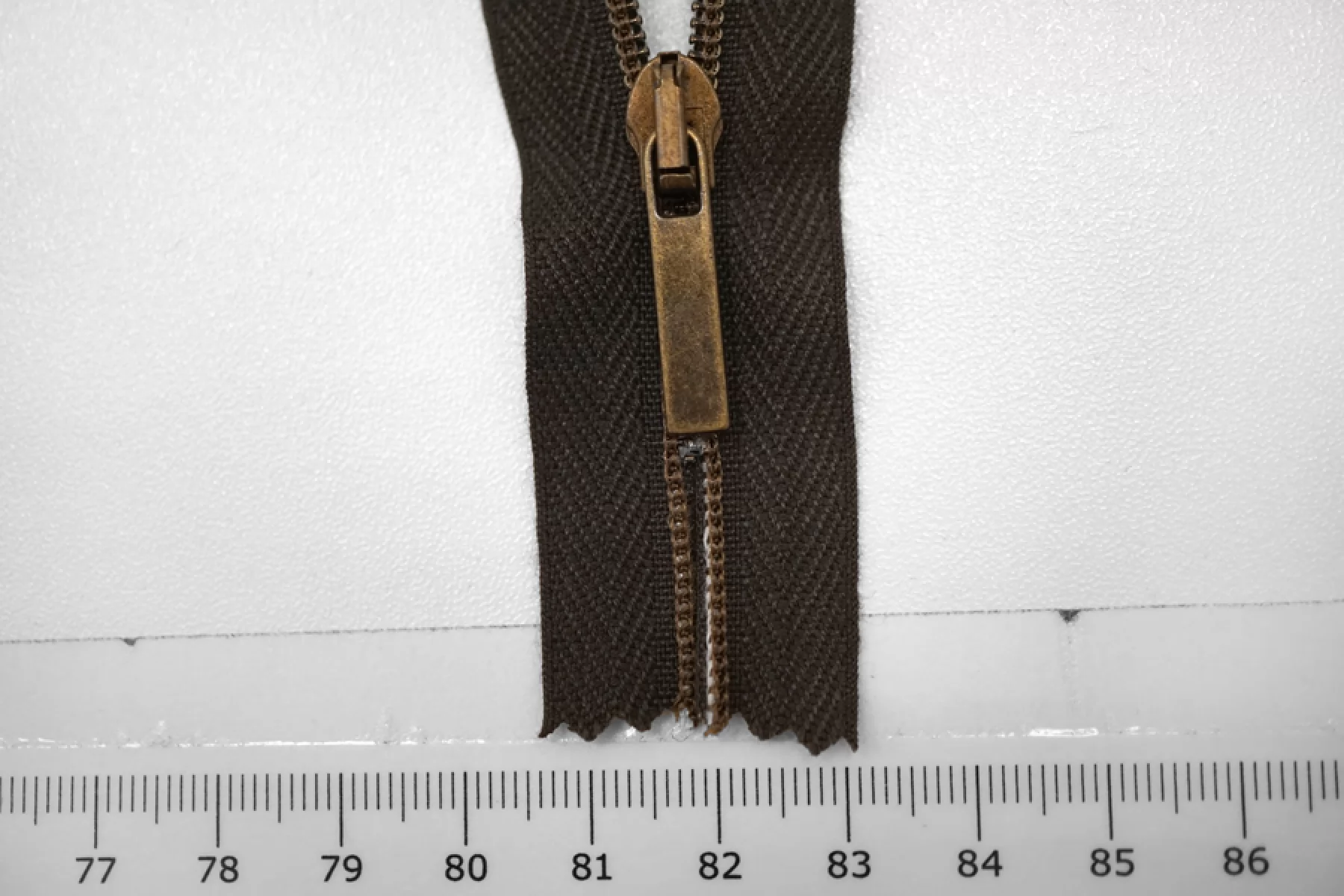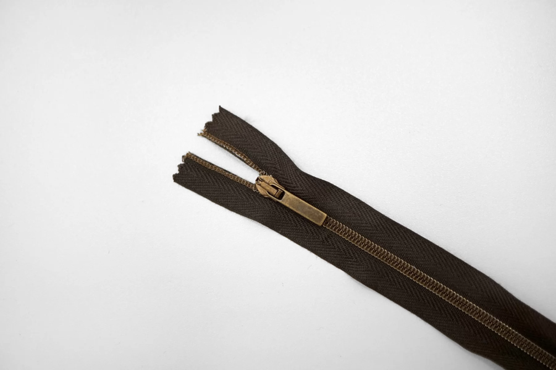 Молния декоративная спиральная неразъёмная, однозамковая, коричневого цвета с бронзовыми зубцами и пуллером от Lampo. Длина 30 см.
