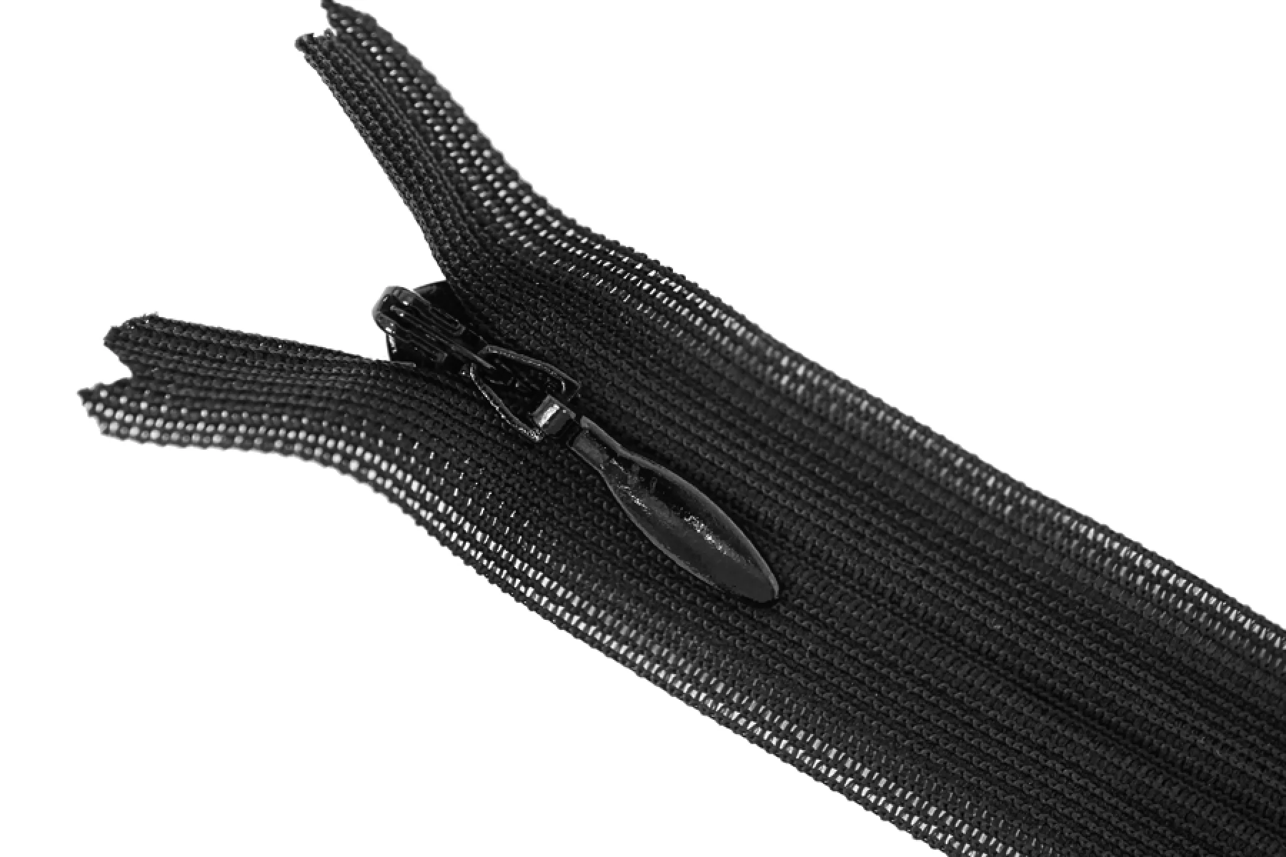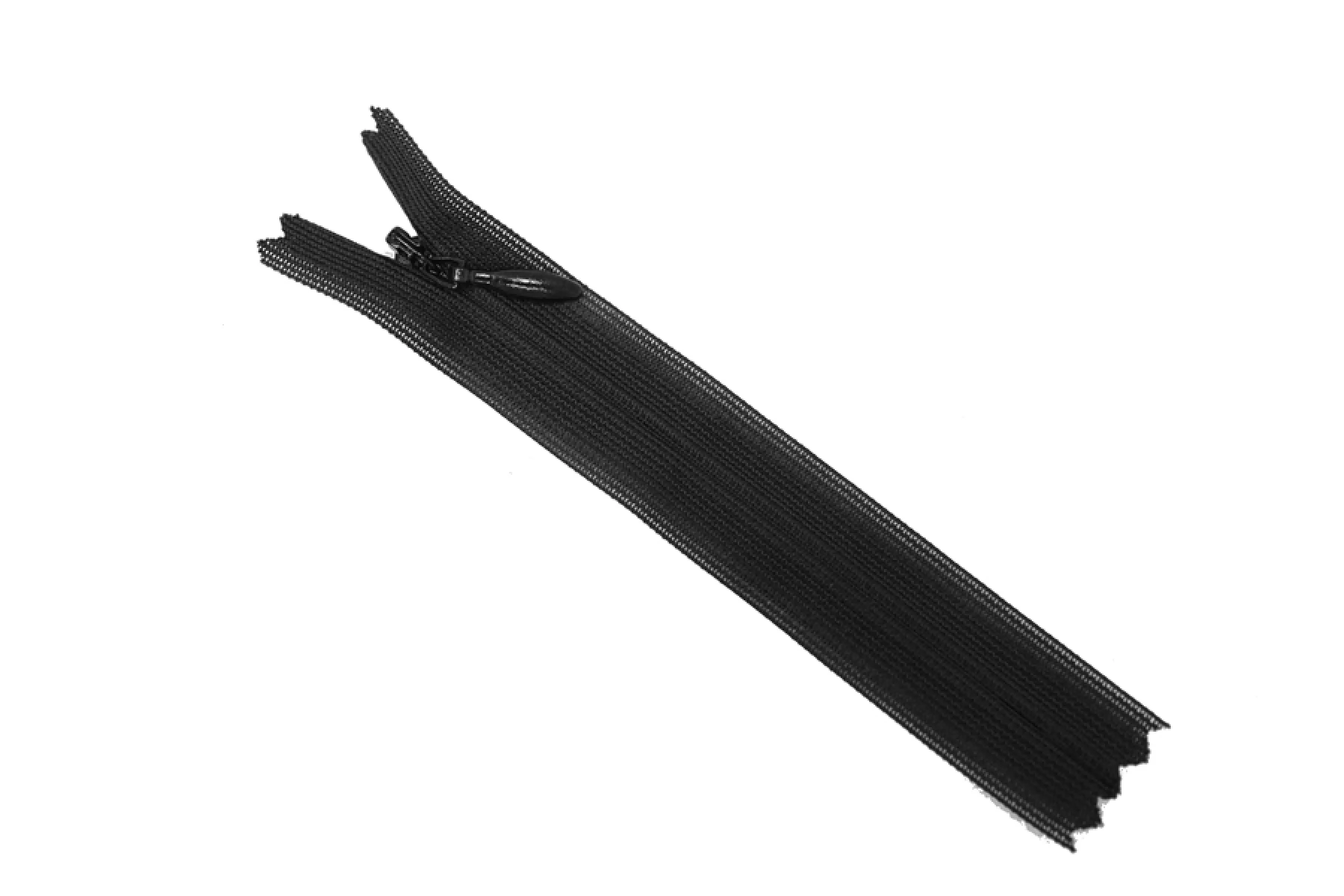 Потайная молния, спиральная, неразъёмная, однозамковая, черно цвета. Зубцы пластиковые, слайдер и пулер в форме капли металл черного цвета. Длина 10,5см. Ширина молнии 2,1см. Ширина зубцов 5мм.