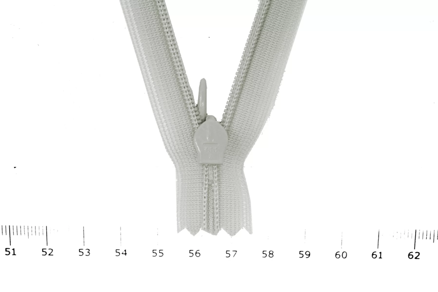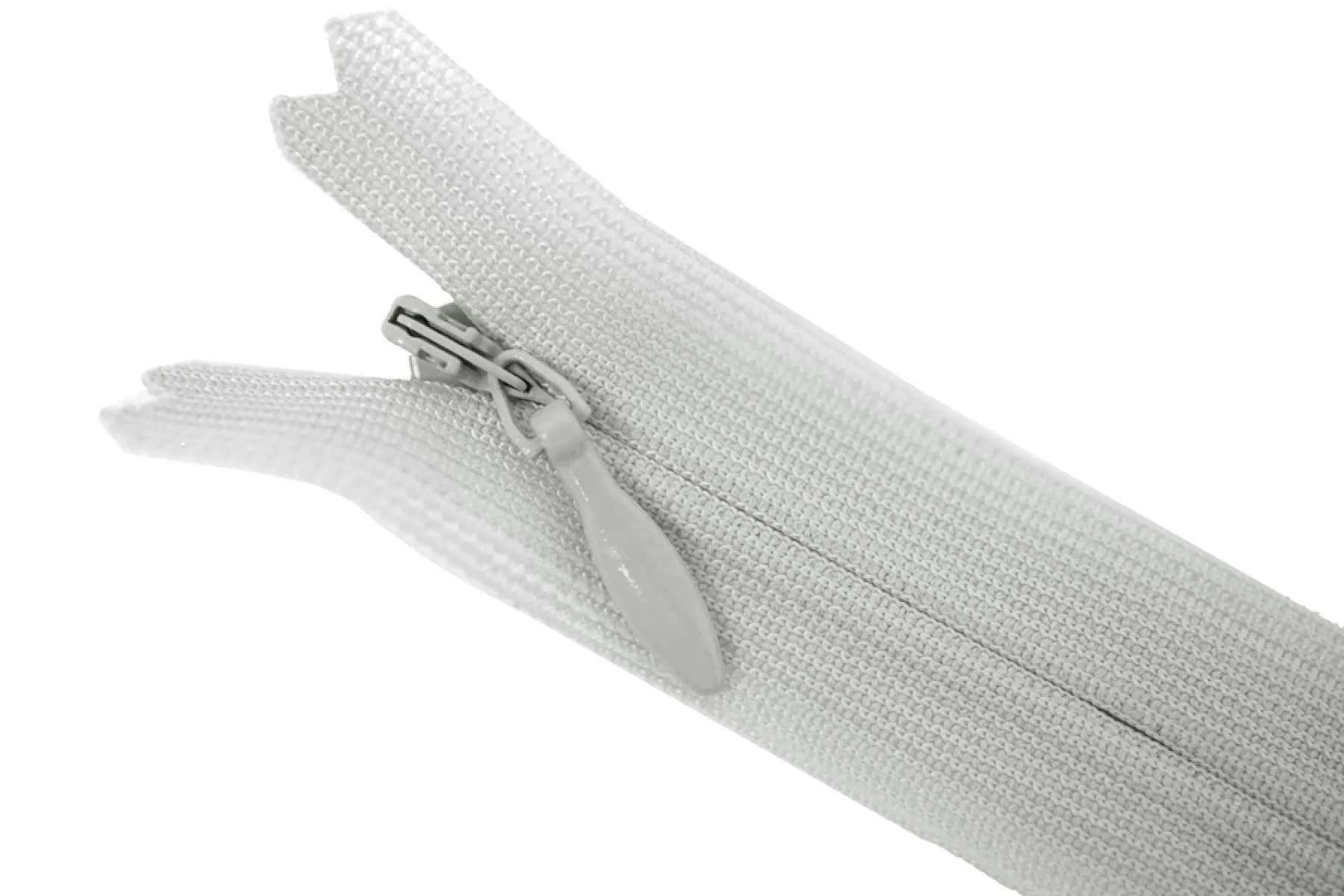 Потайная молния, спиральная, неразъёмная, однозамковая, светло-серого цвета. Зубцы пластиковые, слайдер и пулер в форме капли металл серого цвета. Длина 11см. Ширина молнии 2,1см. Ширина зубцов 5мм.