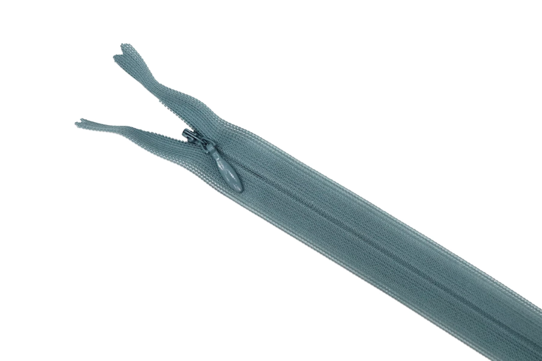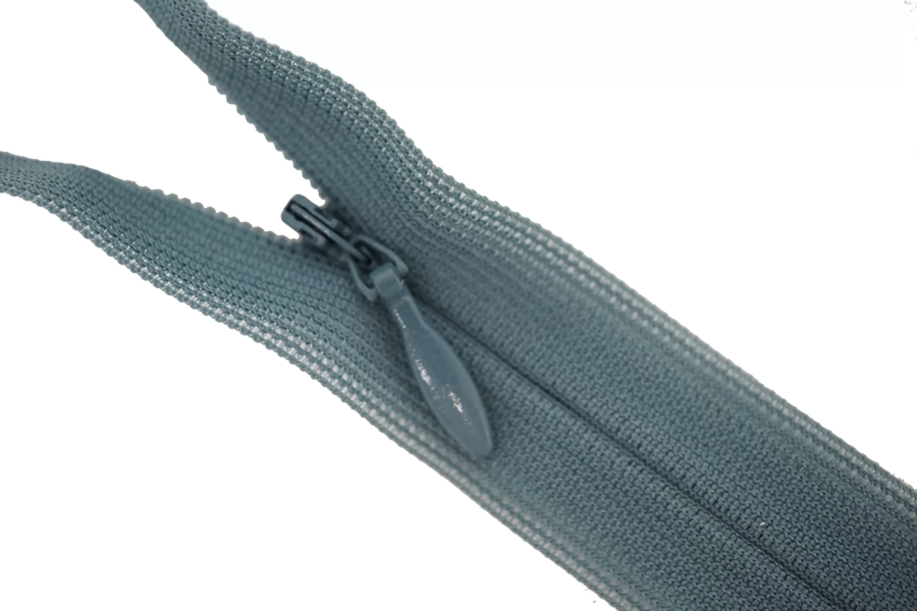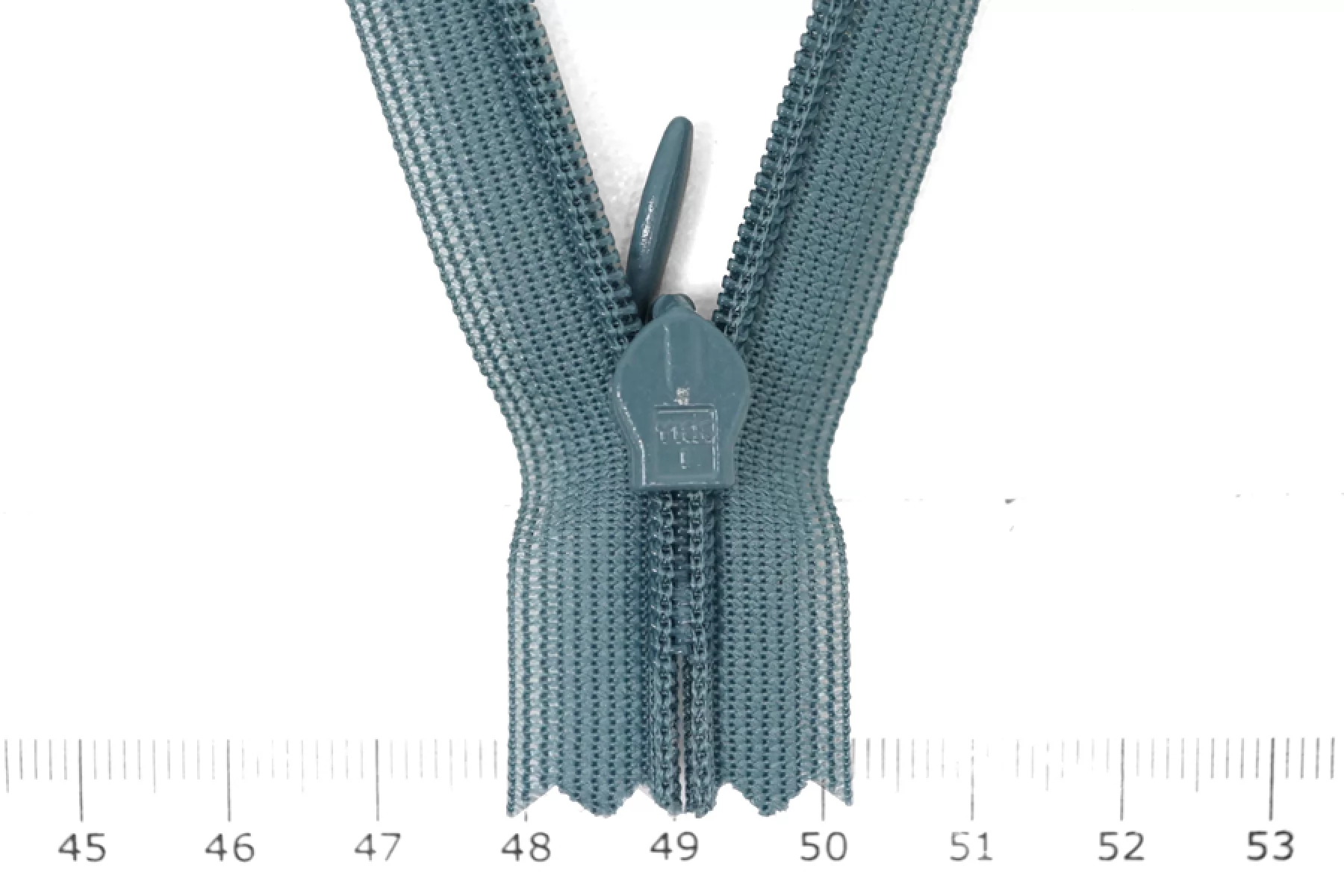 Потайная молния, спиральная, неразъёмная, однозамковая, серо-голубого цвета. Зубцы пластиковые, слайдер и пулер в форме капли металл серо-голубого цвета. Длина 50см. Ширина молнии 2,2см. Ширина зубцов 4мм.