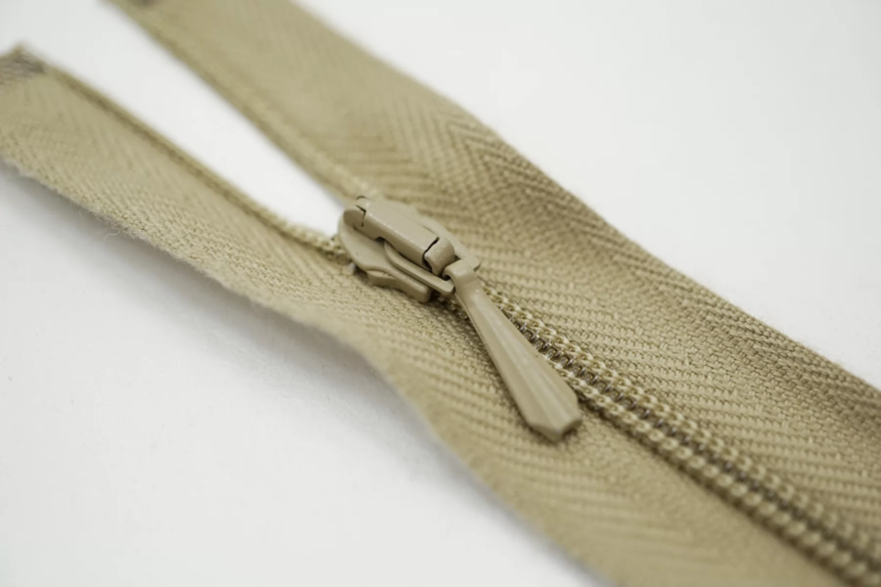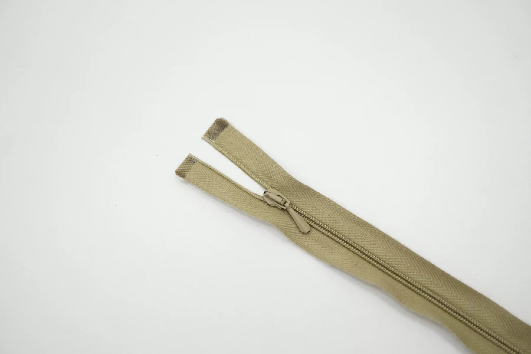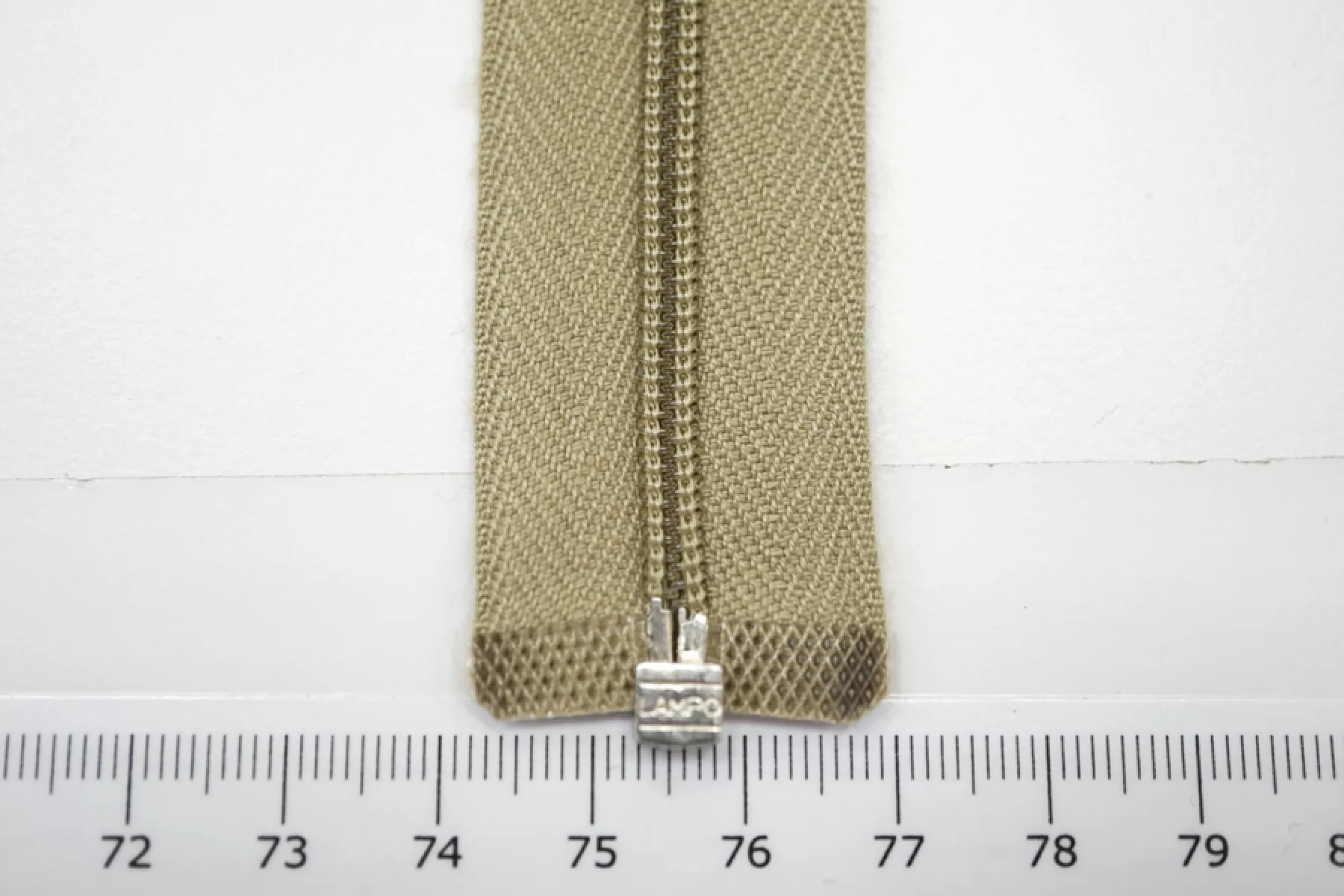Молния декоративная спиральная разъёмная, однозамковая, бежево-зеленого цвета от Lampo. Длина 44 см.
