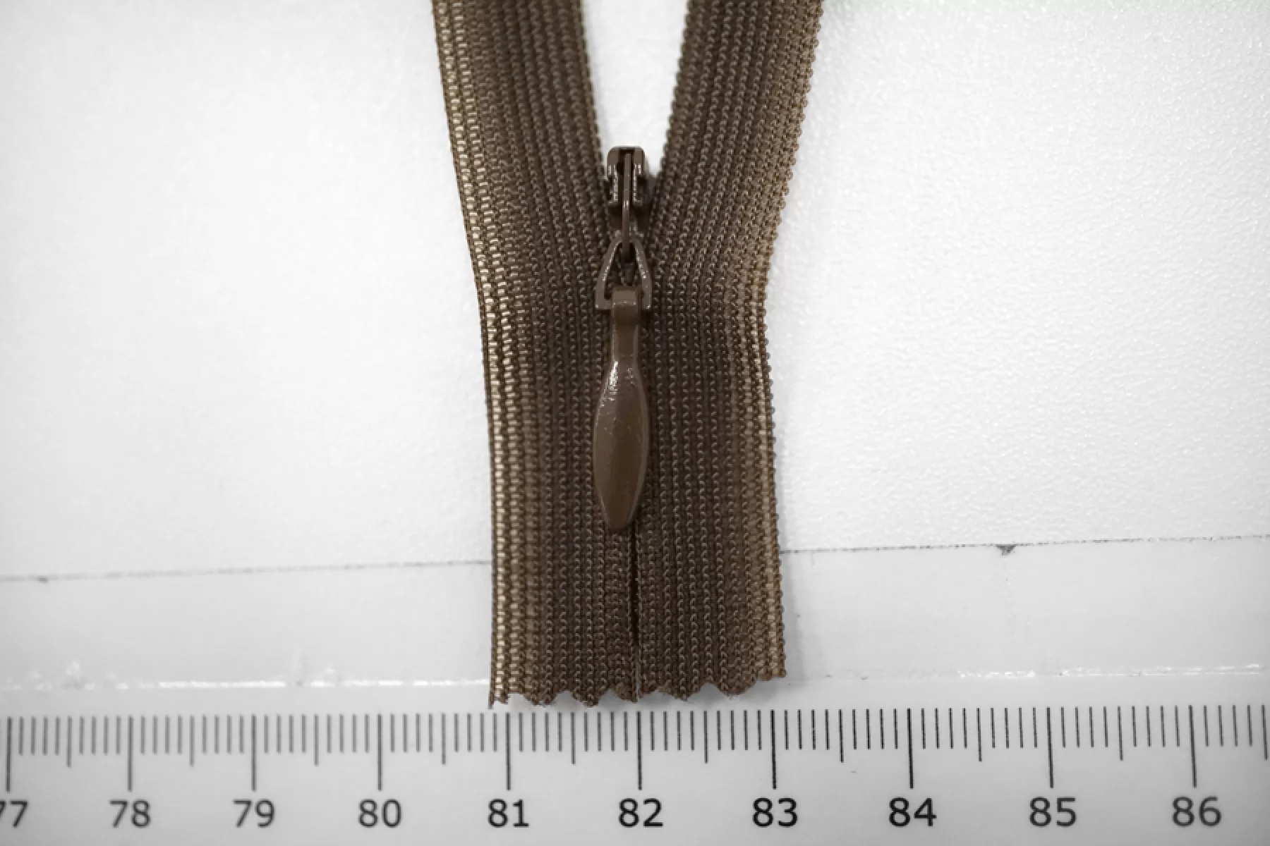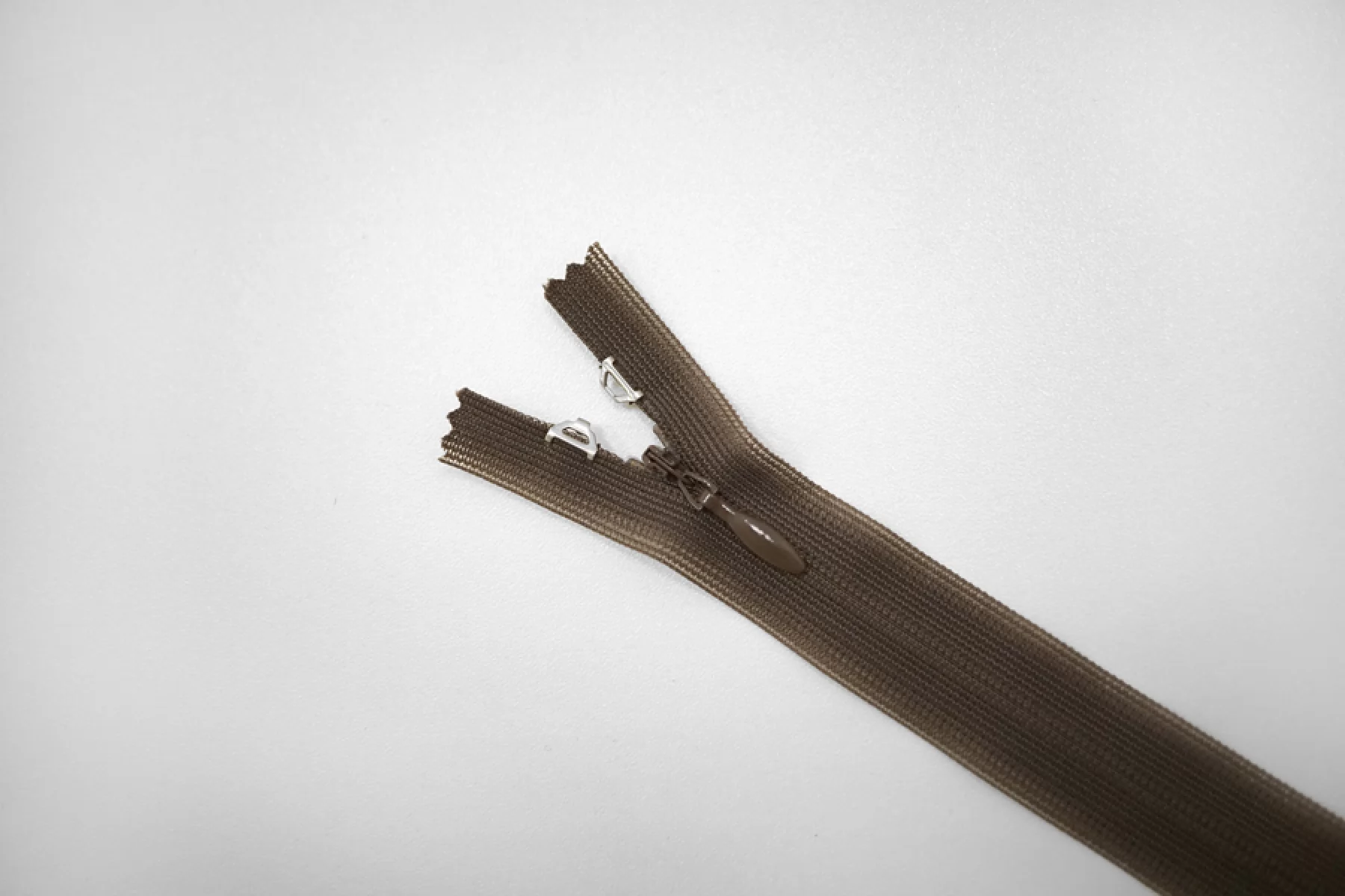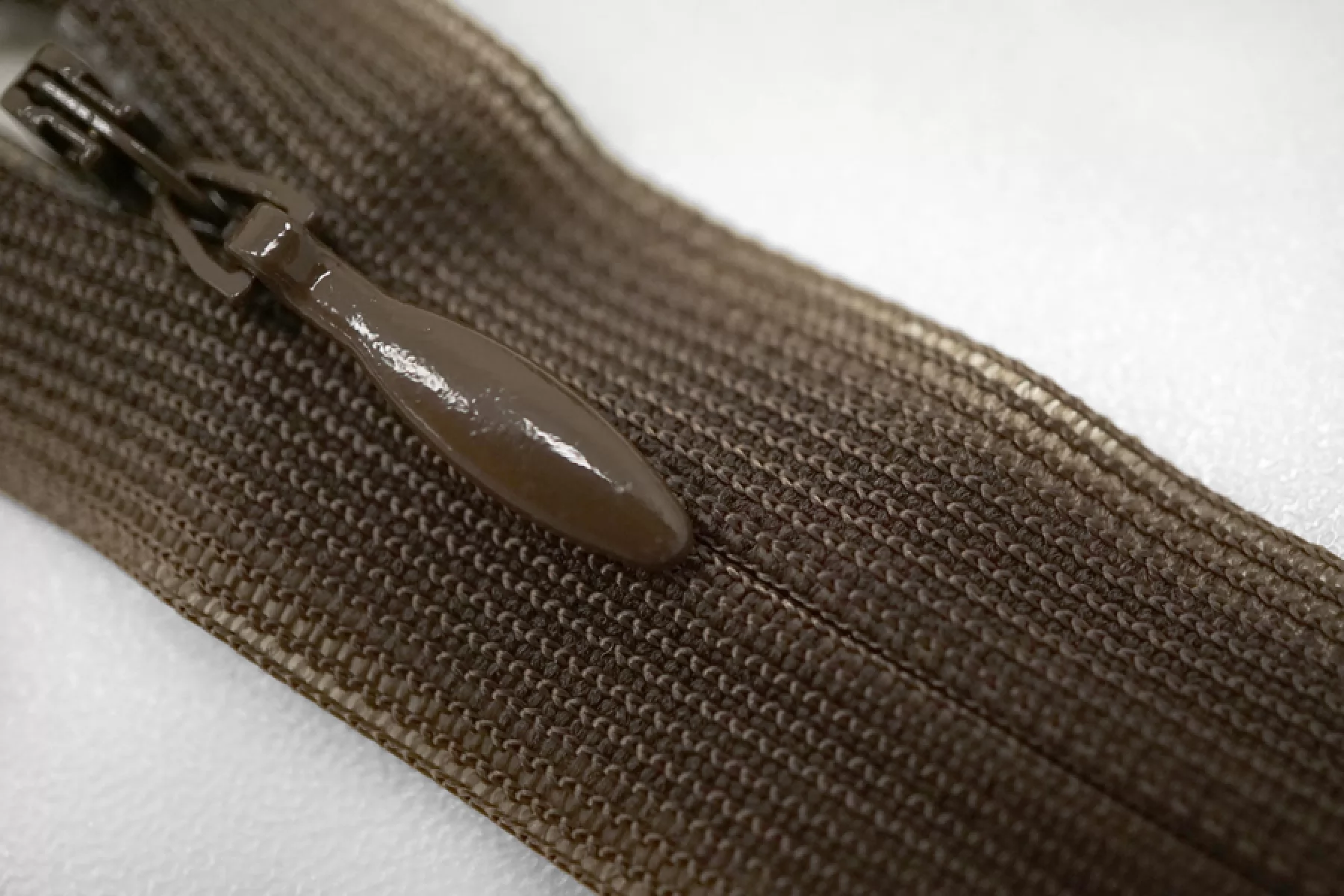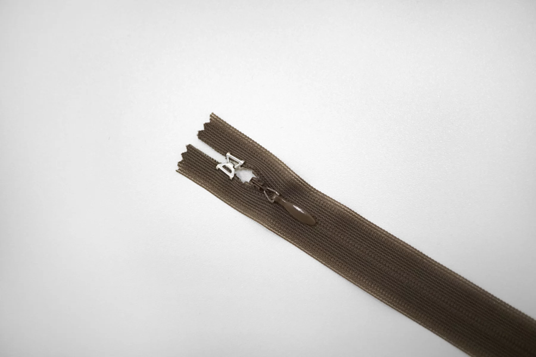 Потайная молния темно-коричневого цвета от YKK, длина 20 см. Есть дополнительный фиксатор-замочек сверху.