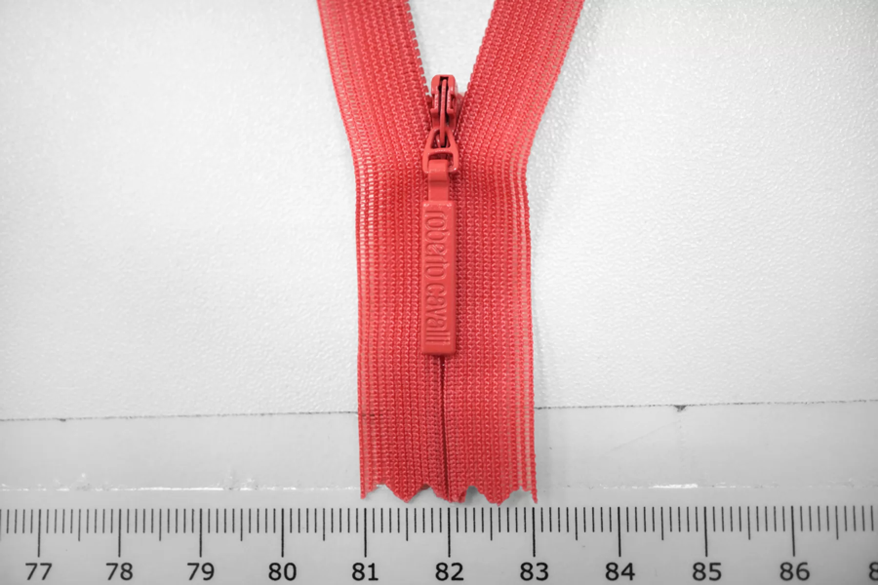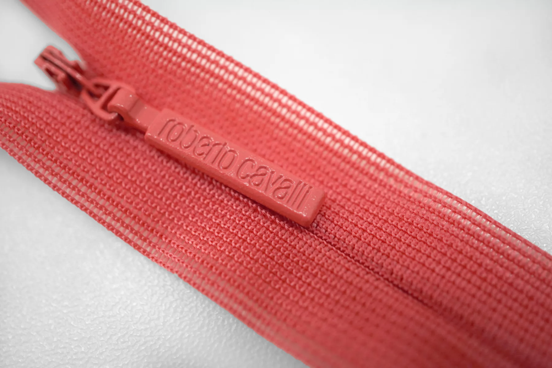 Потайная молния ягодно-розового цвета от YKK, на пулере подпись Cavalli, длина 40 см.