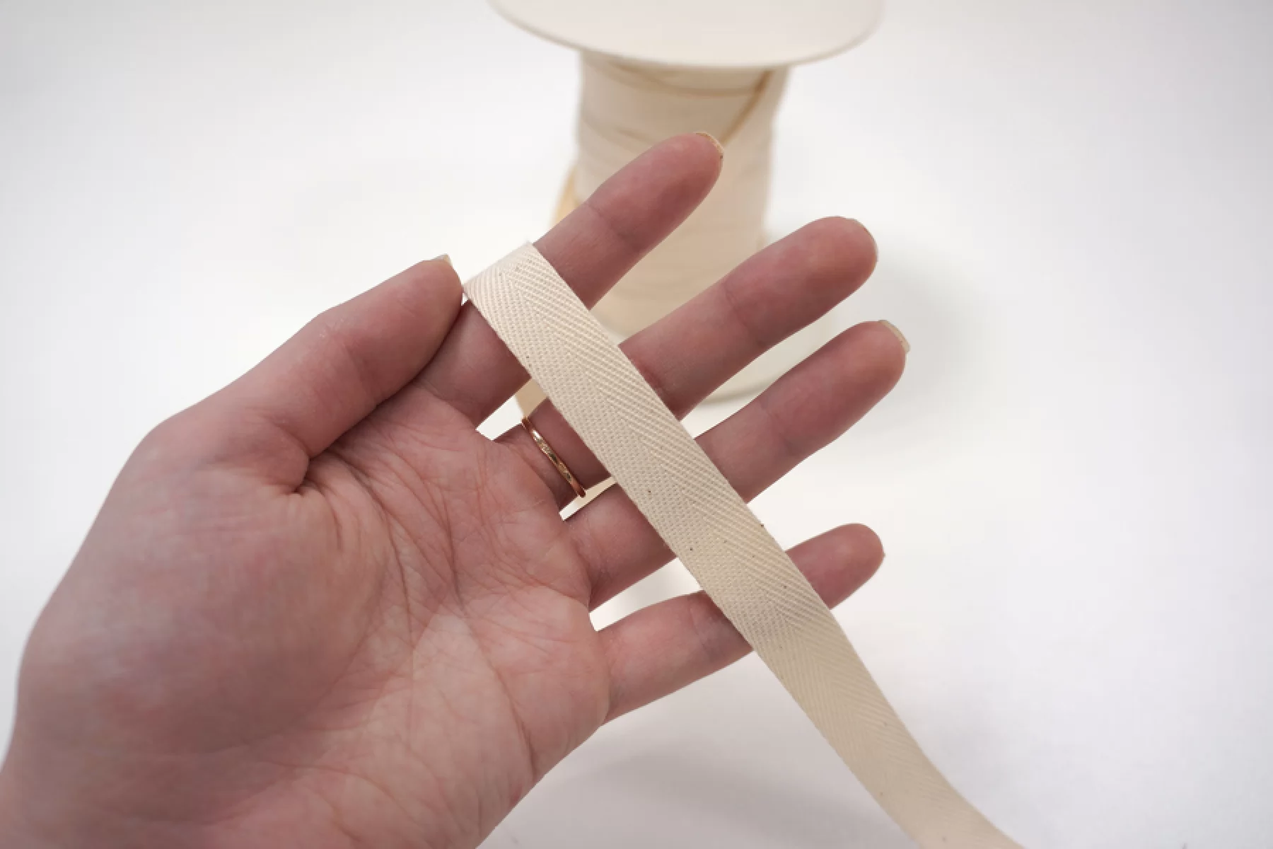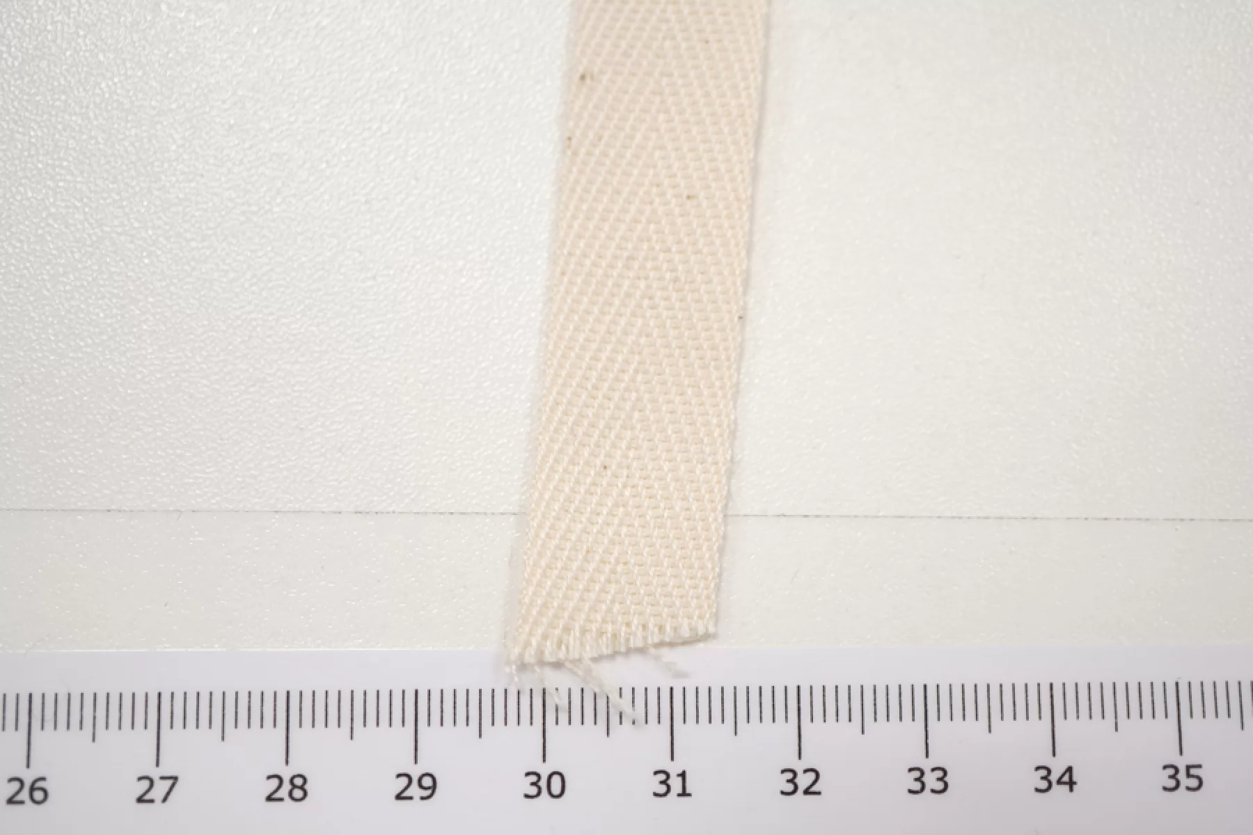 Молочная киперная лента из хлопка шириной около 1,5 см. Плотная, средняя по пластичности.