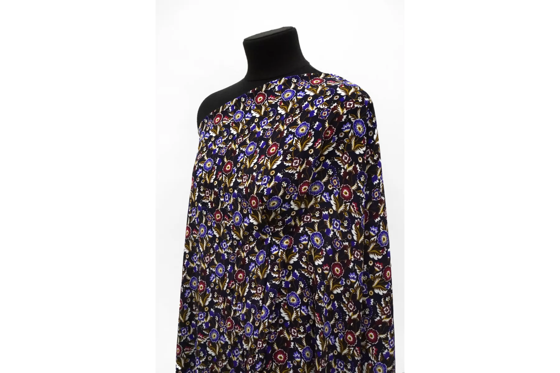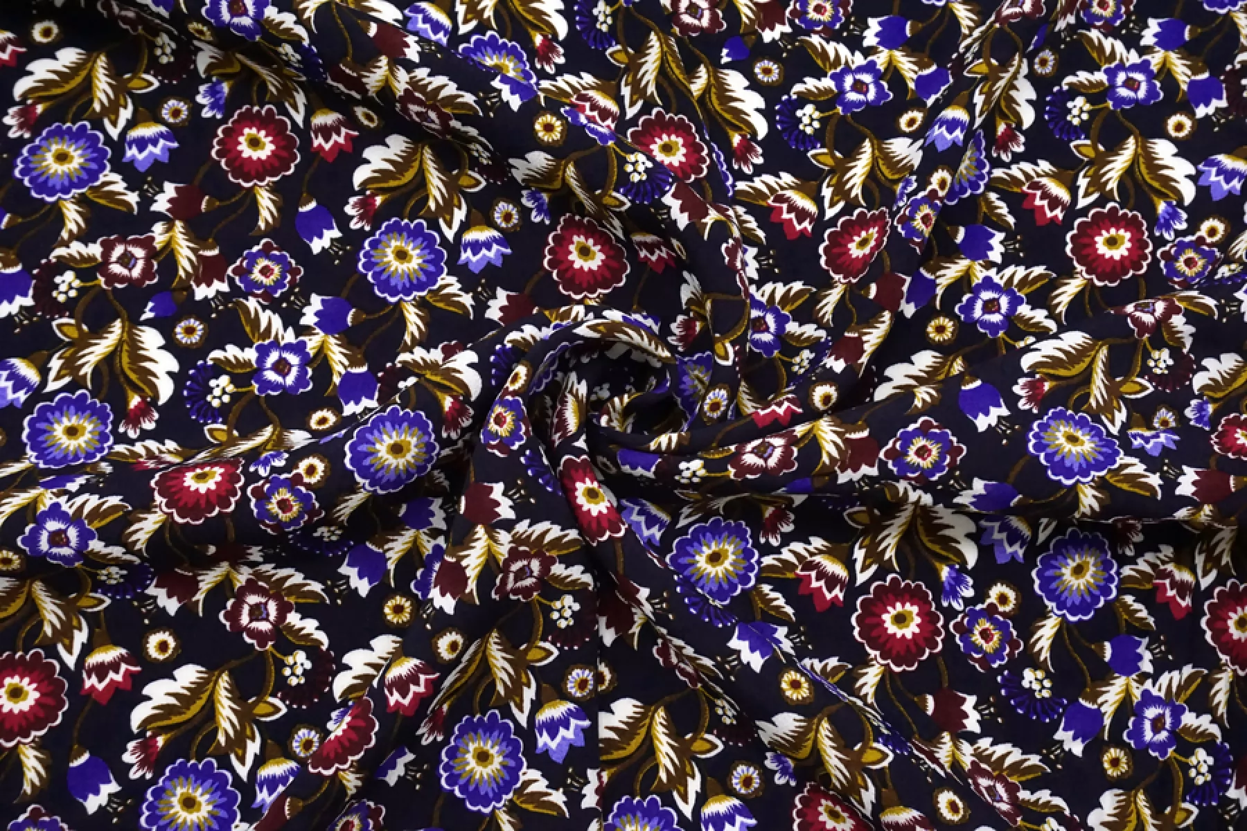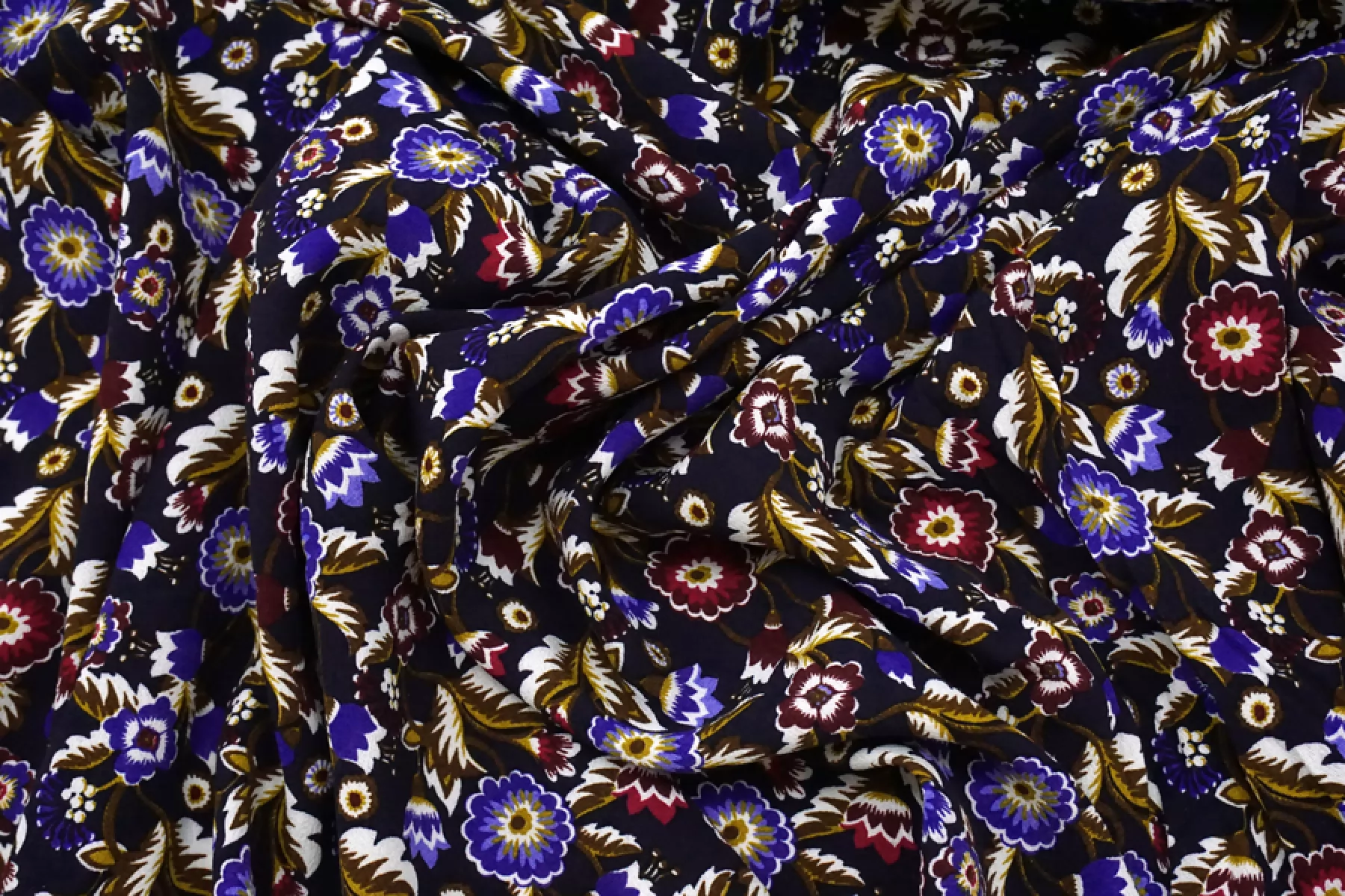 Плательная вискоза с креповой, мраморной поверхностью, слегка жатой. Цветочный принт на темно-синем фоне. Шероховатый материал, струящийся. Подойдет для пошива платья, топа, блузки, юбки. Тонкий, пластичный, немного просвечивает (для юбки или платья советуем подклад, если это не юбка с множеством складочек). При работе с этой тканью советуем использовать тонкие иглы и нитки.