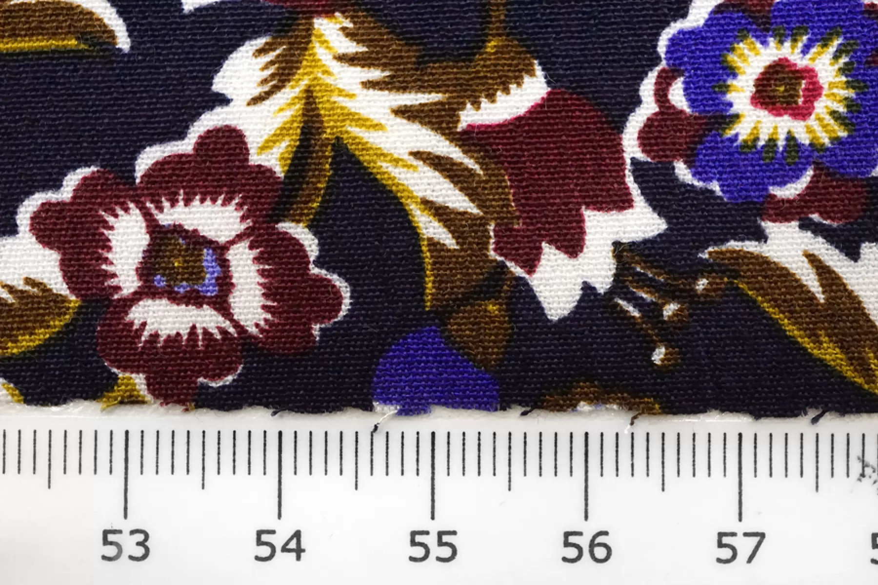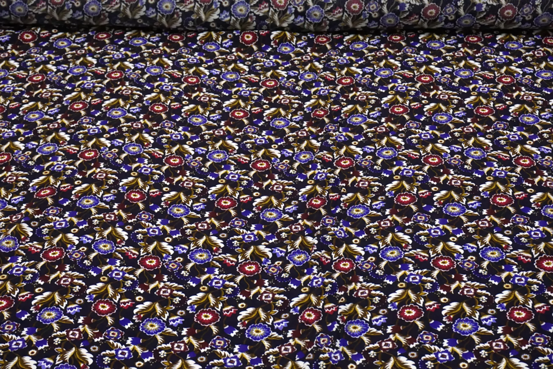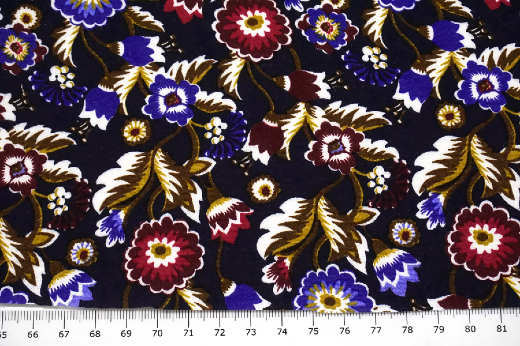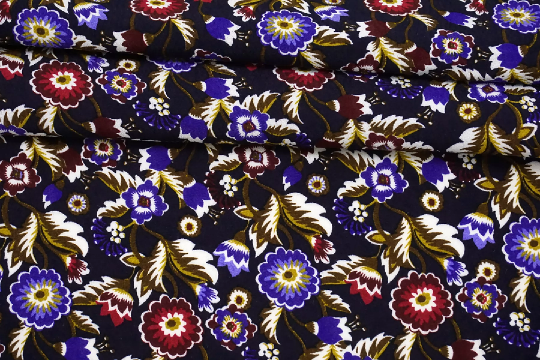 Плательная вискоза с креповой, мраморной поверхностью, слегка жатой. Цветочный принт на темно-синем фоне. Шероховатый материал, струящийся. Подойдет для пошива платья, топа, блузки, юбки. Тонкий, пластичный, немного просвечивает (для юбки или платья советуем подклад, если это не юбка с множеством складочек). При работе с этой тканью советуем использовать тонкие иглы и нитки.
