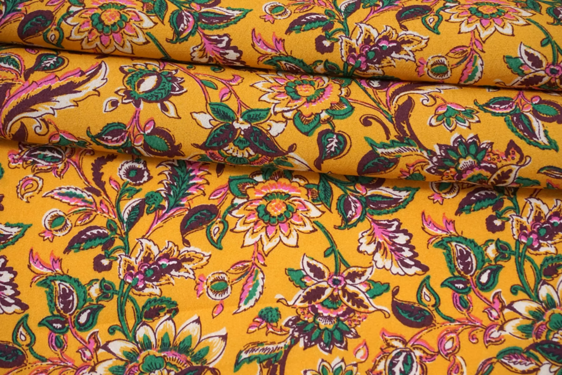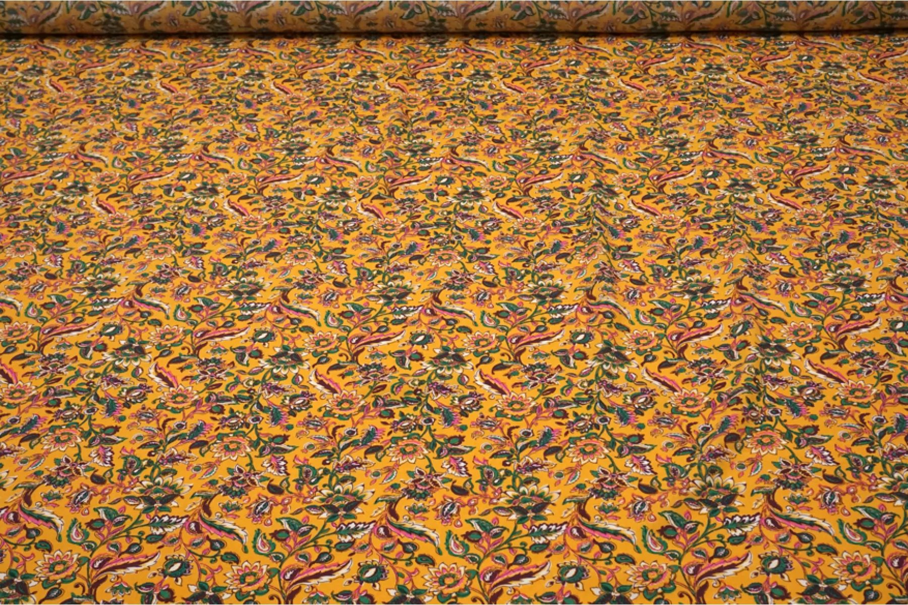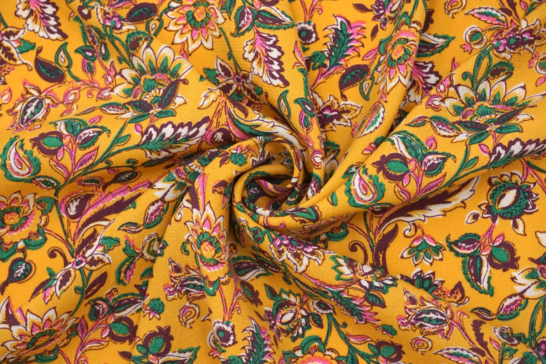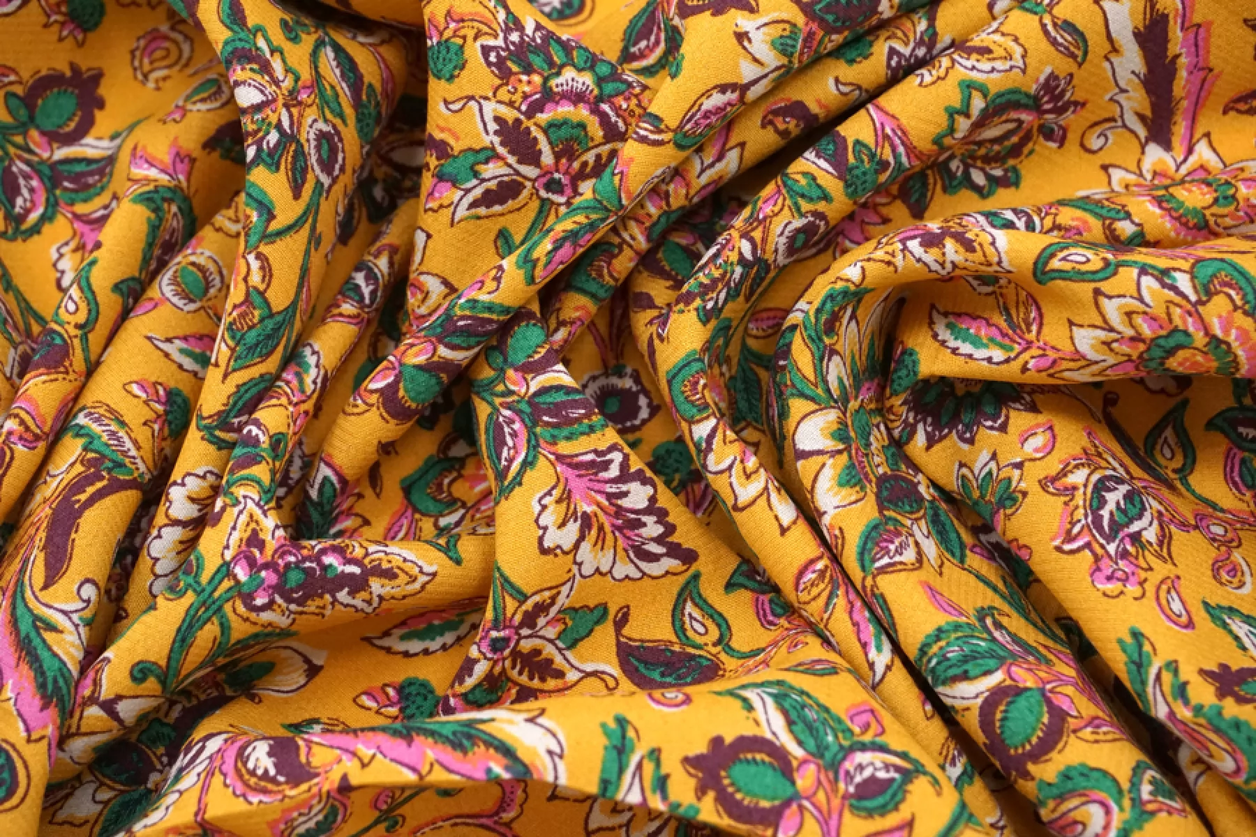 Плательная вискоза с креповой, мраморной поверхностью, слегка жатой. Цветочный принт на янтарном фоне. Шероховатый материал, струящийся. Подойдет для пошива платья, топа, блузки, юбки. Тонкий, пластичный, немного просвечивает (для юбки или платья советуем подклад, если это не юбка с множеством складочек). При работе с этой тканью советуем использовать тонкие иглы и нитки.