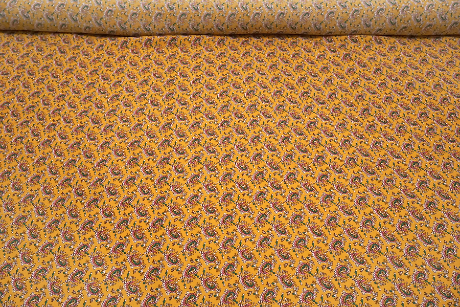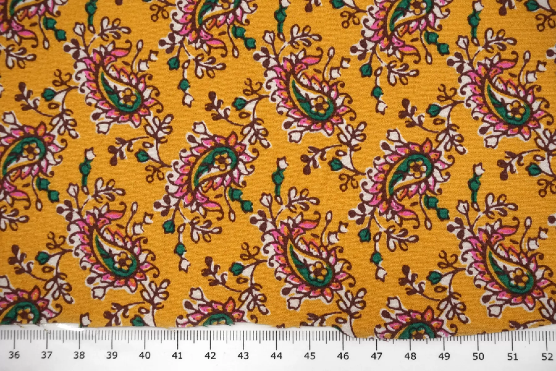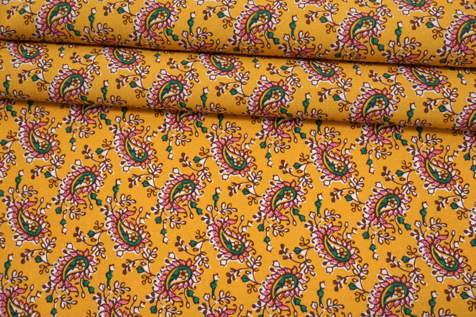 Плательная вискоза с креповой, мраморной поверхностью, слегка жатой. Маленькие огурцы на янтарном фоне. Шероховатый материал, струящийся. Подойдет для пошива платья, топа, блузки, юбки. Тонкий, пластичный, немного просвечивает (для юбки или платья советуем подклад, если это не юбка с множеством складочек). При работе с этой тканью советуем использовать тонкие иглы и нитки.