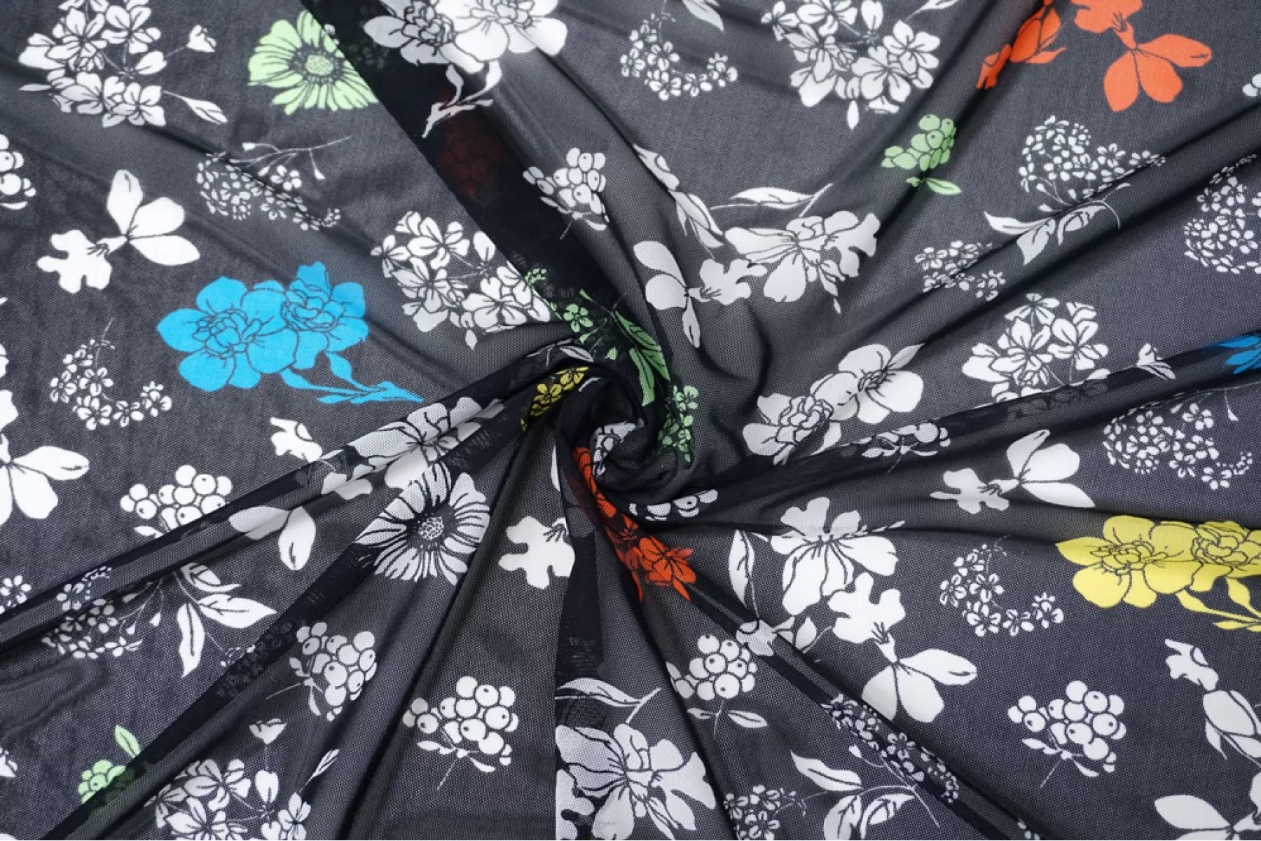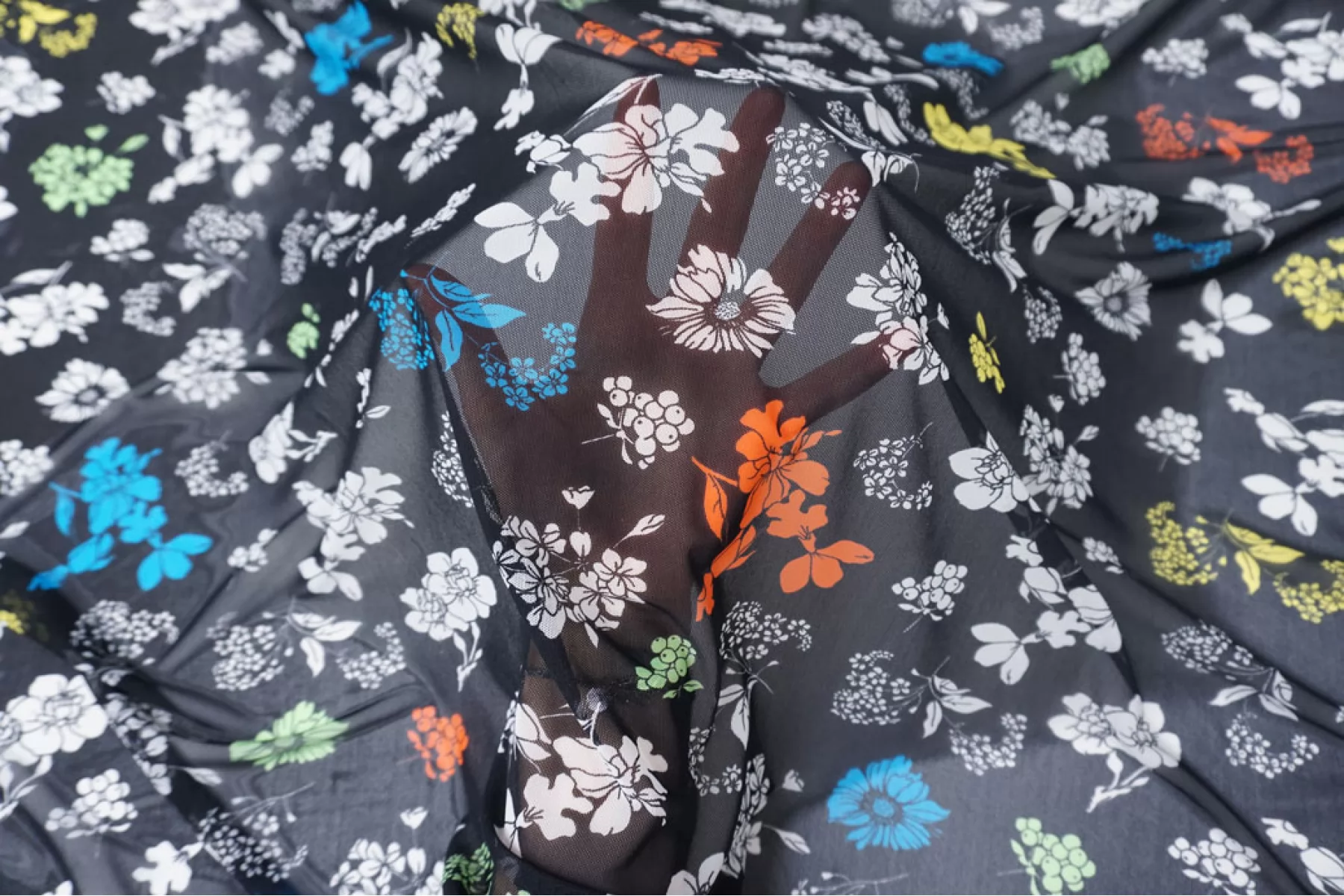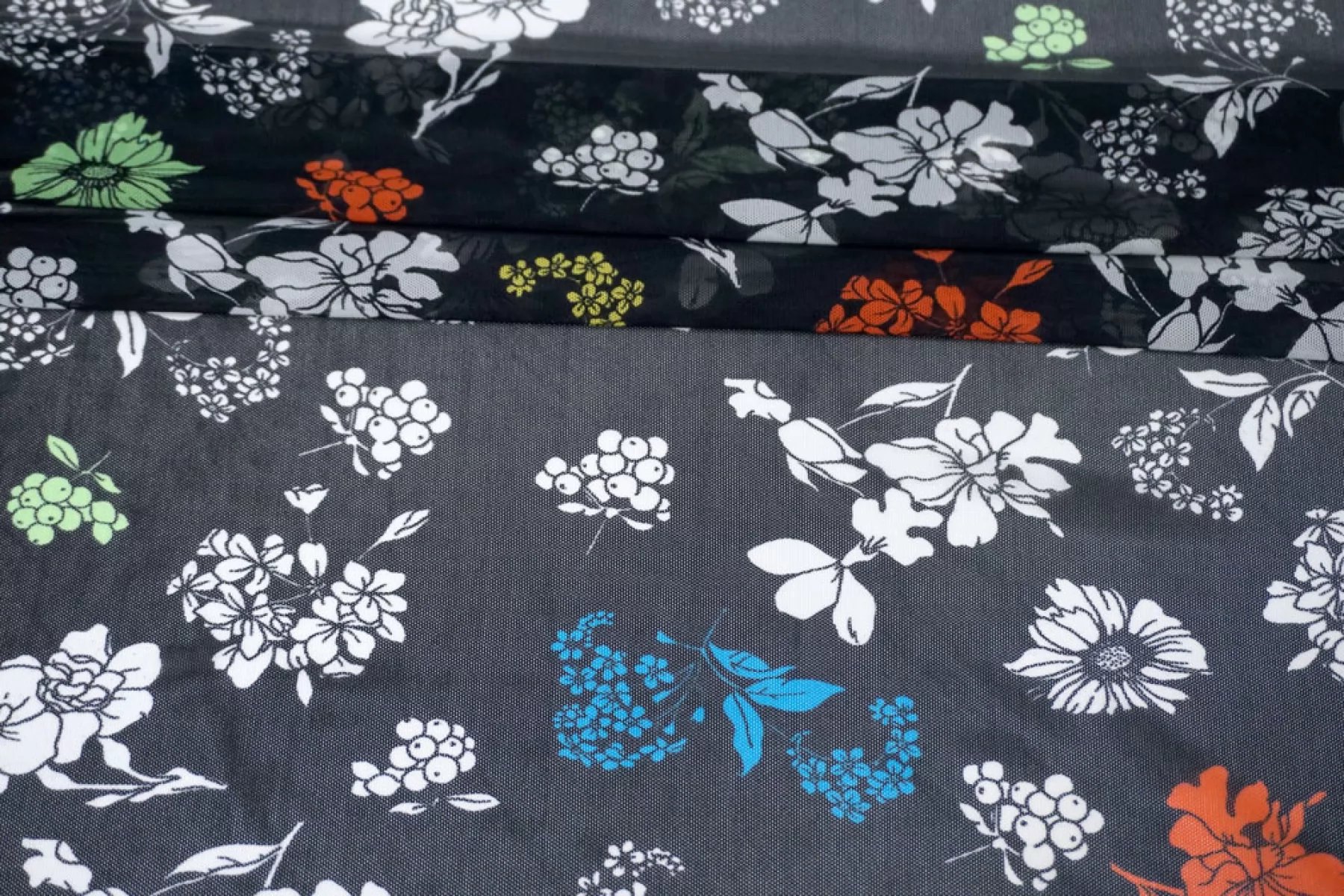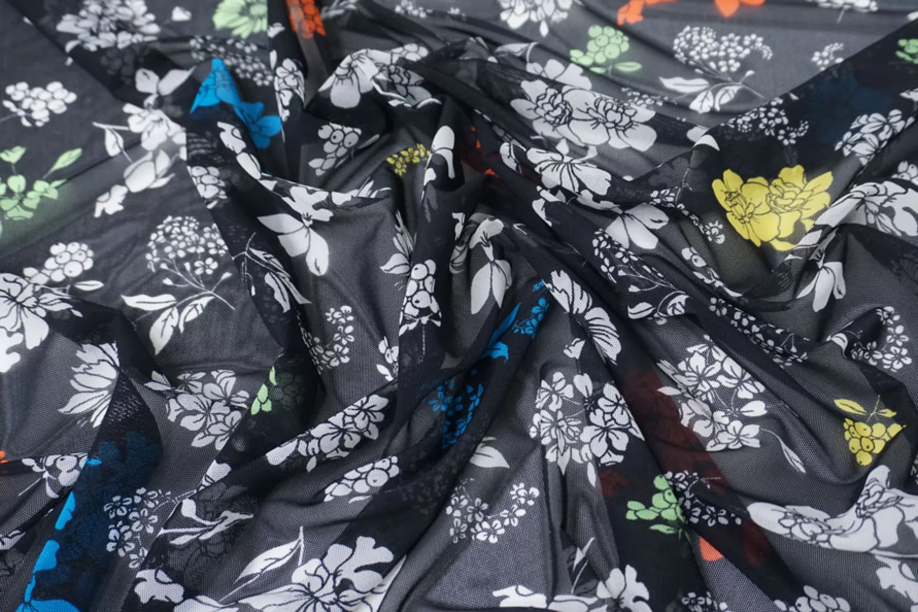 Мягкая итальянская сетка стрейч черного цвета с рисунком в виде цветов и ягод в оранжевых, желтых, зеленых, голубых и белых оттенках. Тонкая, пластичная, хорошо тянется, приятная тактильно. Форму не держит. Полупрозрачная. Отлично подойдет на боди, лонгсливы, кофты, майки и другие варианты