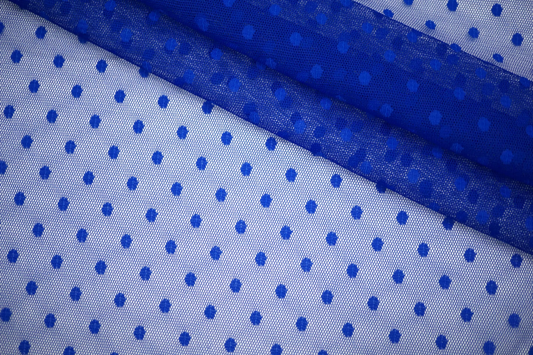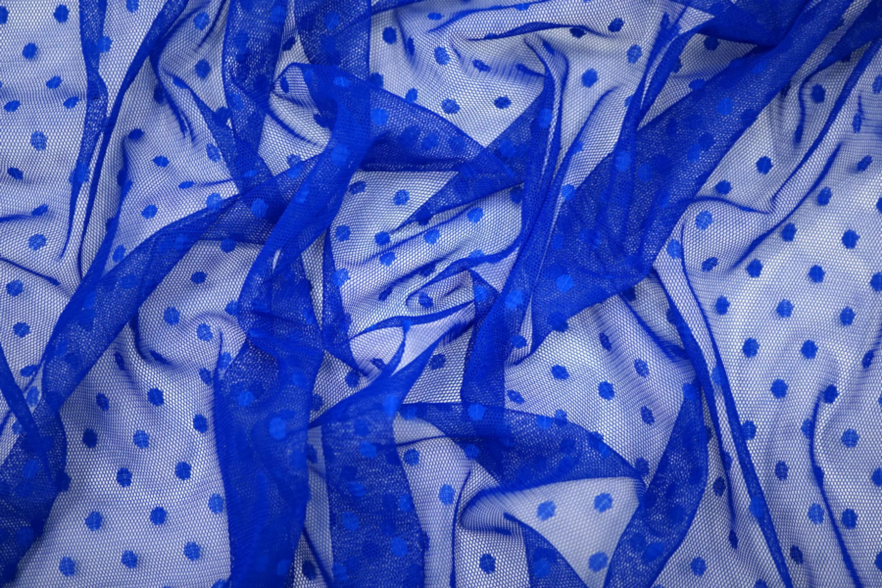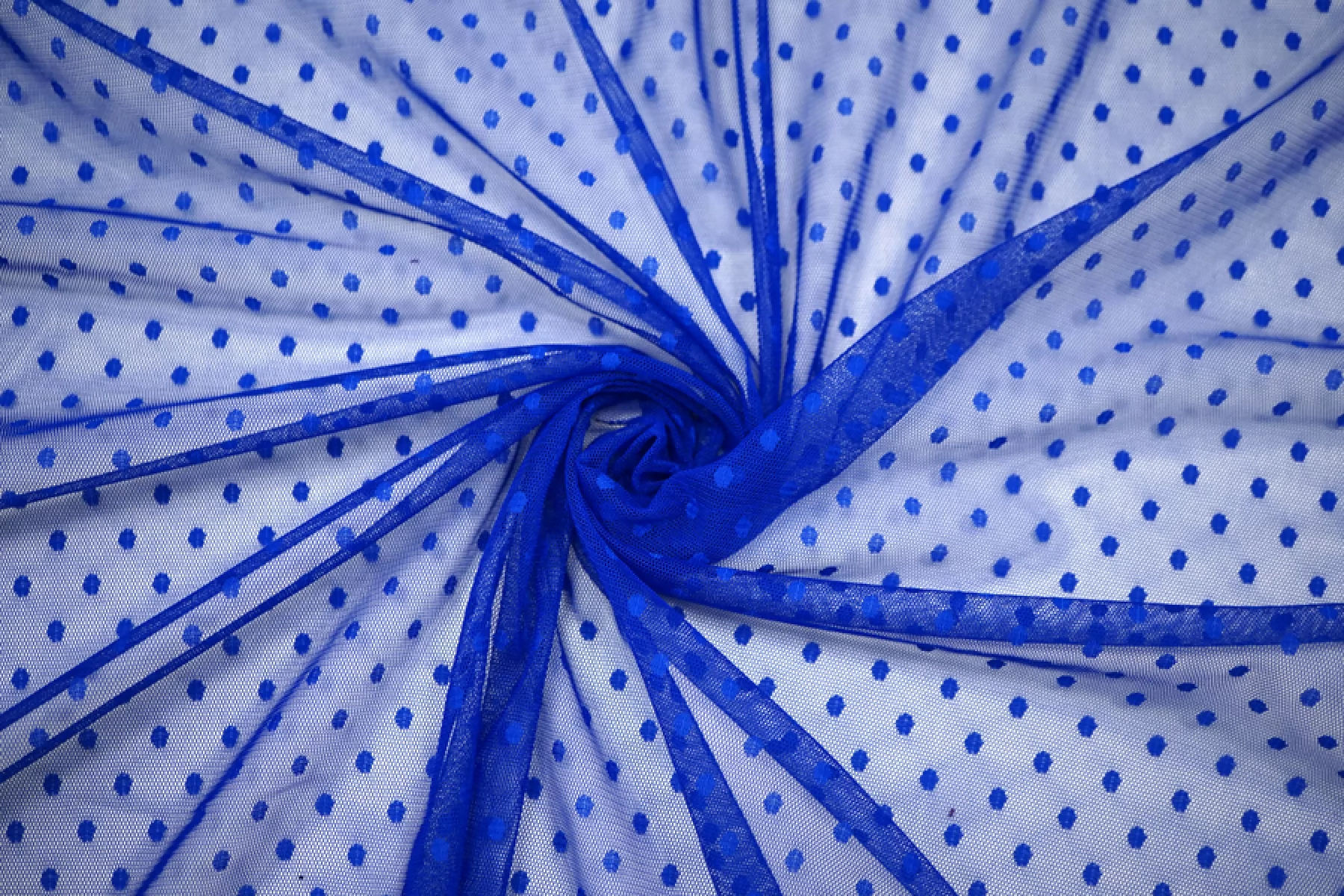 Мягкая итальянская сетка синего цвета в горошек. Тонкая, пластичная, тянется, приятная тактильно. Хорошо подойдет для пошива и декора одежды и белья.